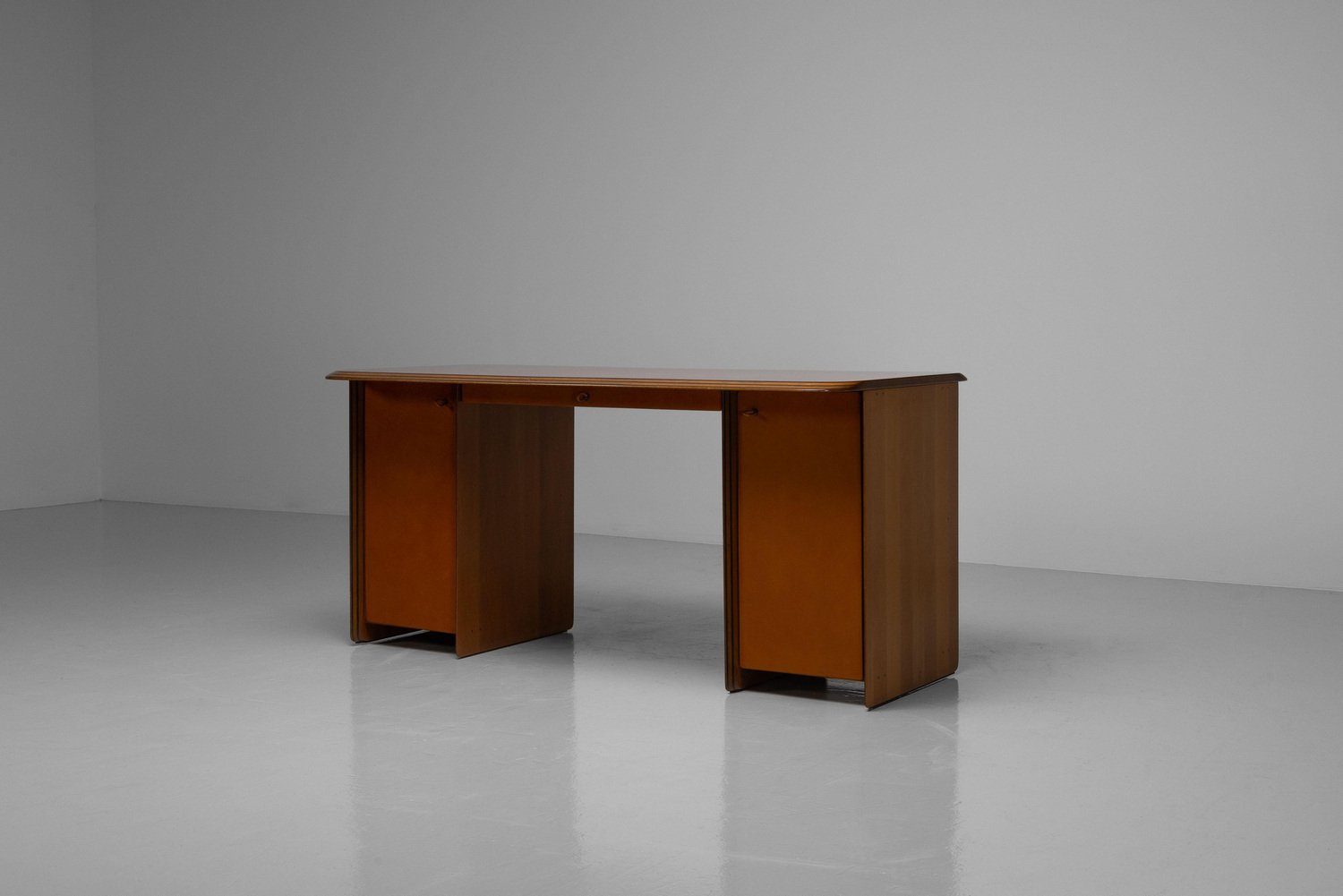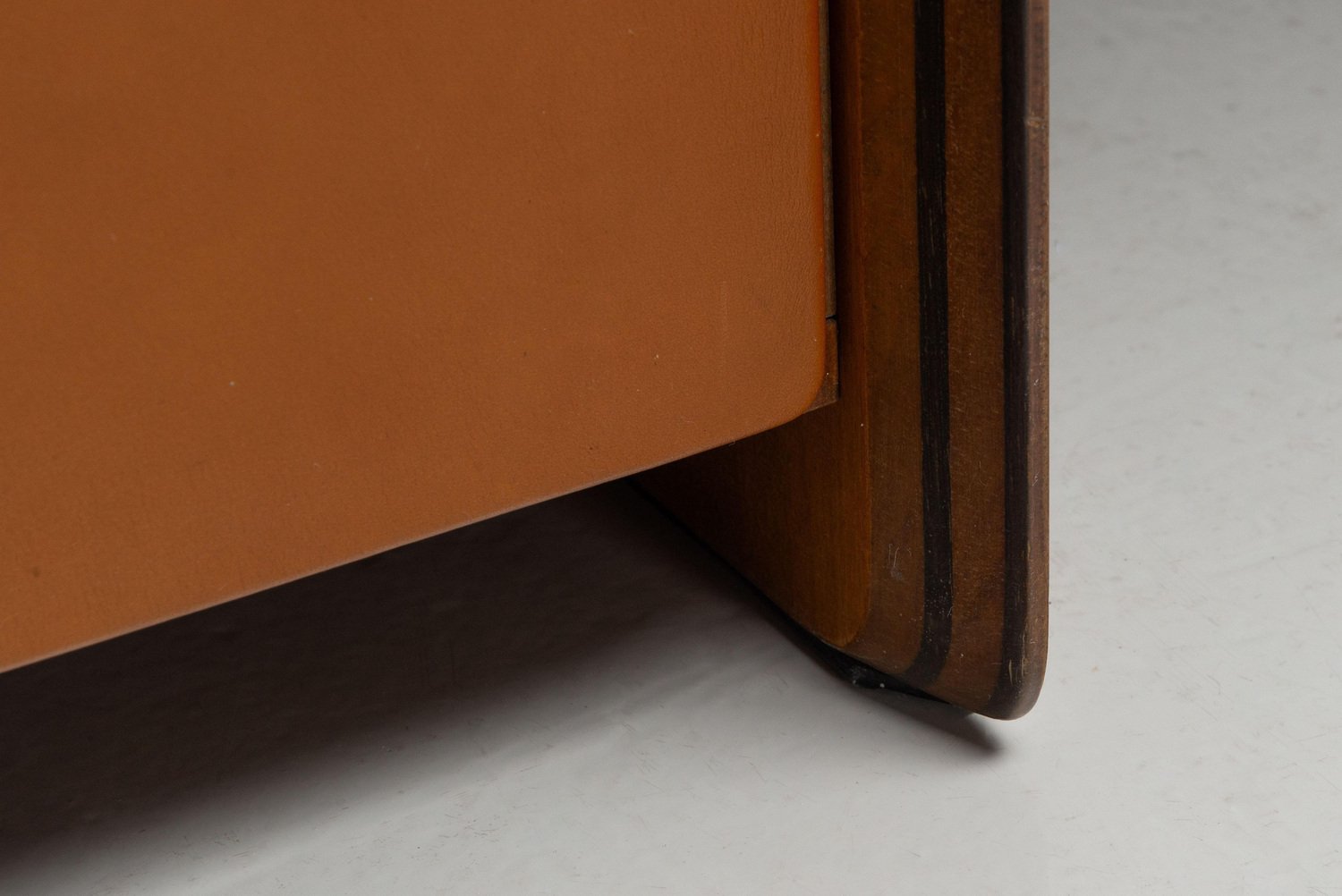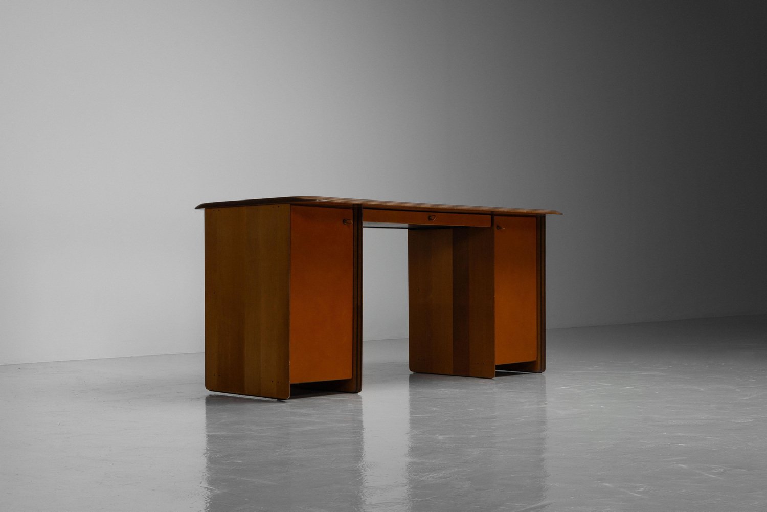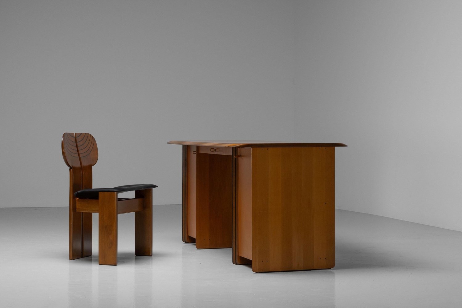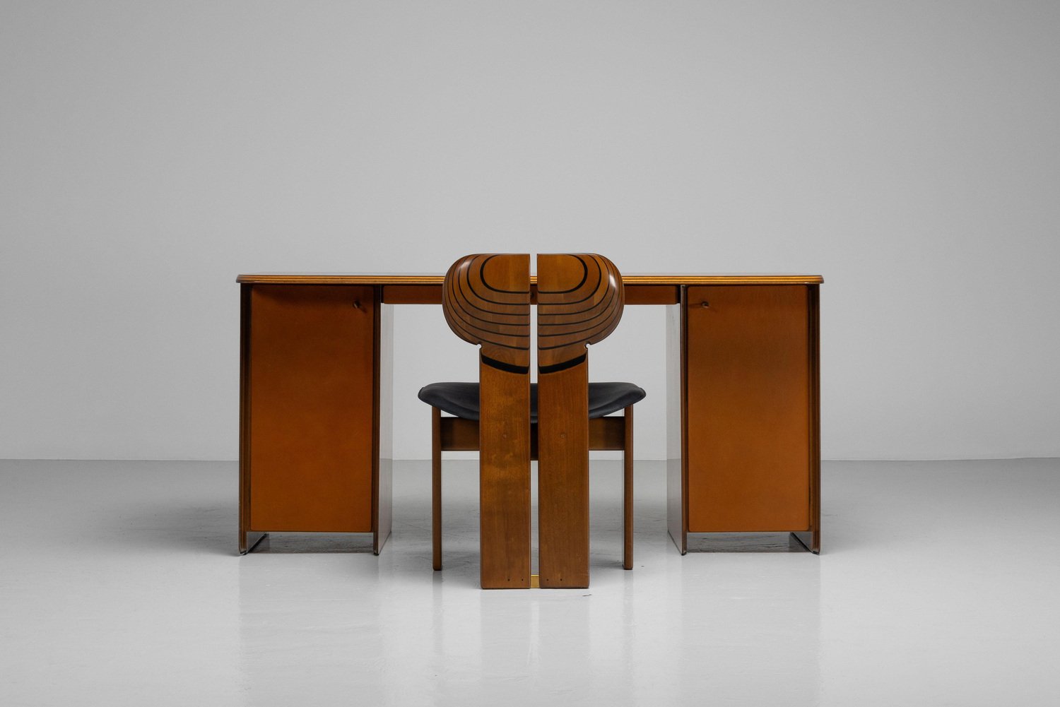 Beautiful writing desk model 7737 from the Artona series designed by Afra e Tobia Scarpa and manufactured by Maxalto in Italy, 1975. The top has a striking burl-wood veneer with a mesmerizing pattern. The bottom features walnut veneer compartments with leather-covered doors and leather “loop" handles. The edges show the typical Artona signature with dark lines in the wood, slightly angled. The warm orange/brown color of the top complements the cognac brown leather and walnut wood. The desk features a thin drawer in the middle and storage space on both sides, with two shelves on the left and one on the right behind the leather-covered doors. This desk combines aesthetics with practicality, making it perfect for working in style. Very nice quality designed desk in very good original condition. The chair on the pictures is not included but can be purchased here. The ‘Artona’ line, crafted by the Scarpa duo, holds historical significance as it marked the beginning of Maxalto, a specialized branch of B&B Italia. Maxalto, founded in 1975, was dedicated to crafting artisanal, predominantly wooden furniture. The ‘Artona’ series was their first project for Maxalto and also served as a counterpoint to the prevailing trend of using plastics in furniture design during the postwar era. Afra and Tobia Scarpa are award winning postmodern Italian architects and designers. Their pieces can be found in museums across the United States and Europe, including collections in MoMa and the Louvre Museum. They have collaborated with companies such as B&B Italia, San Lorenzo Silver, Molteni, and Knoll International. They have won a number of awards such as the Compasso d’Oro in 1969 to the International Forum Design in 1992. Their design work consists of architecture and everyday household items including, furniture, clothing, interior design, art glass. They focused on the technical and aesthetic possibilities of materials in their designs. The couple was greatly influenced by Tobia’s father, Carlo Scarpa, a Venetian architect and designer. Read more…