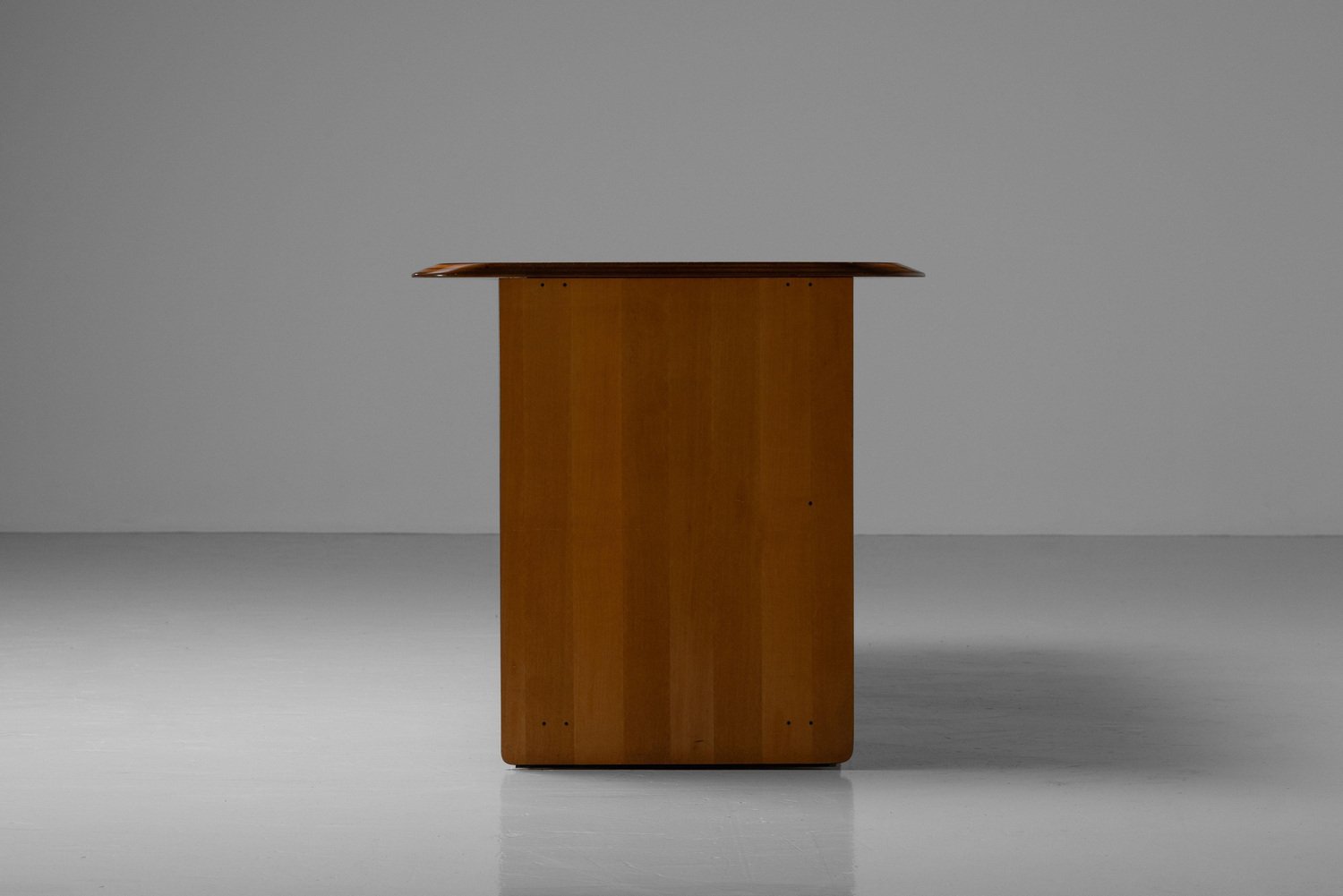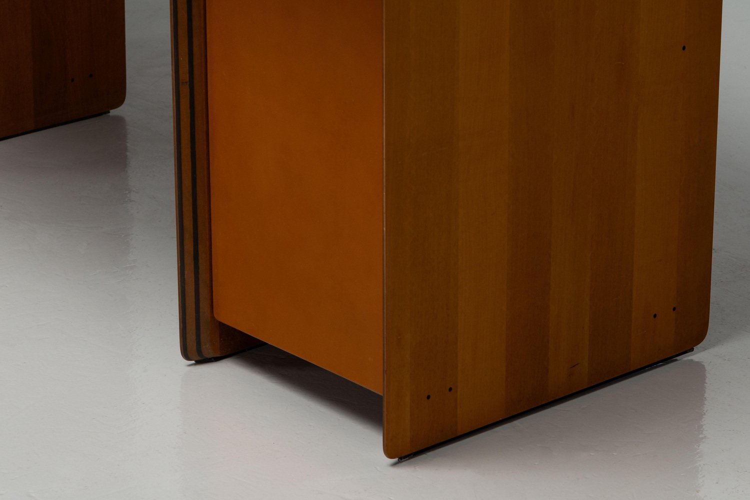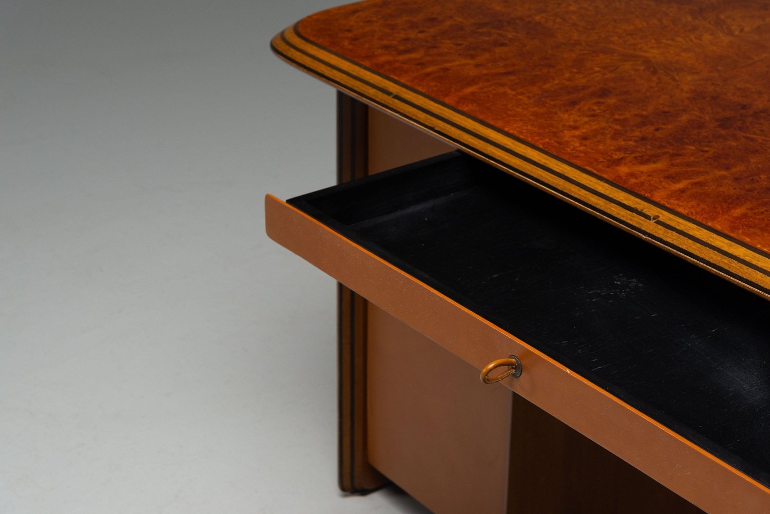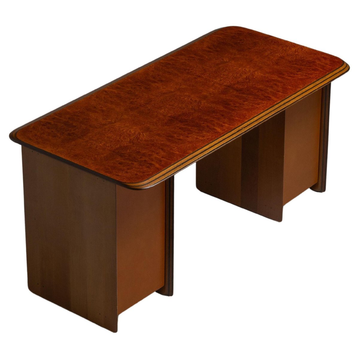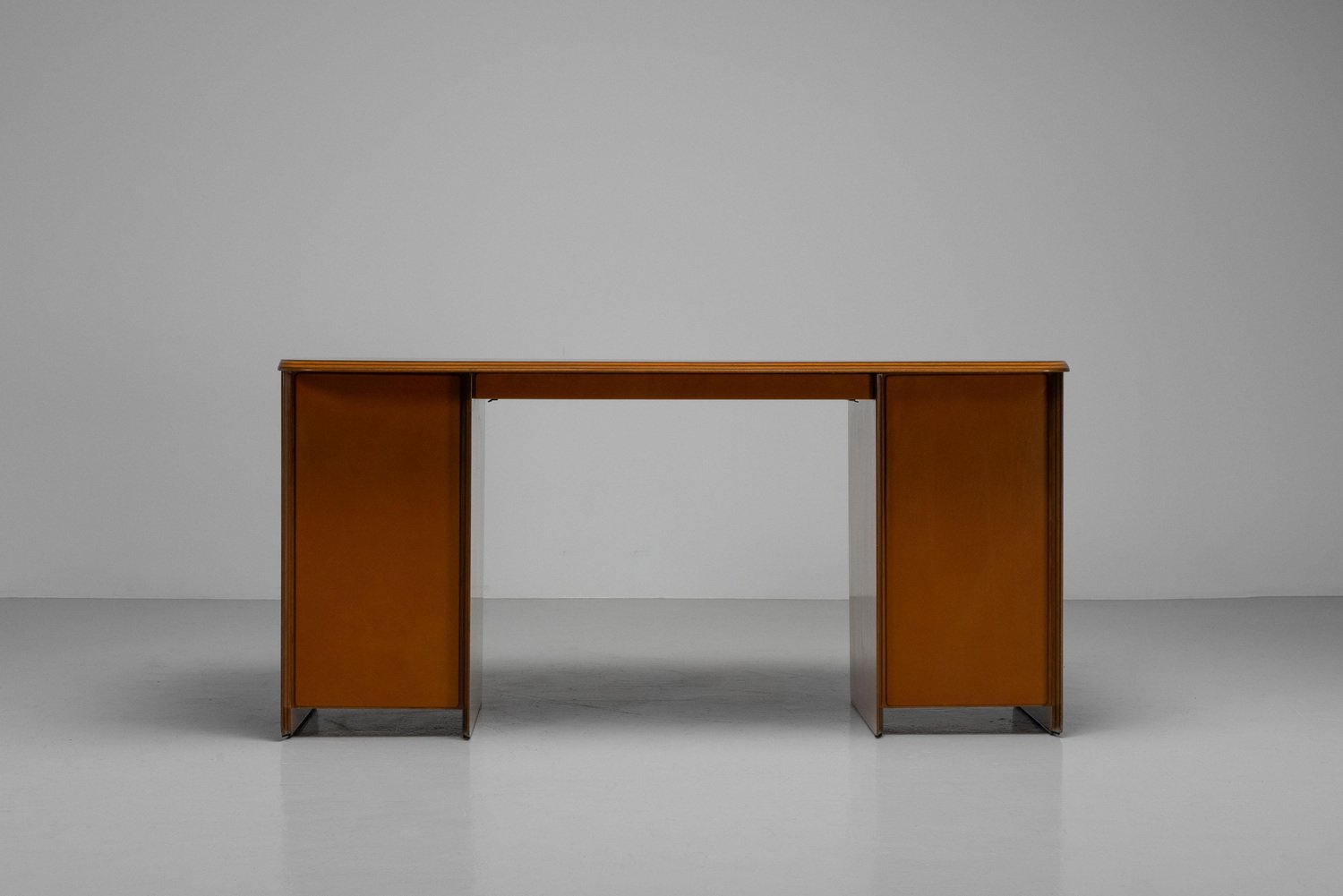 Beautiful writing desk model 7737 from the Artona series designed by Afra e Tobia Scarpa and manufactured by Maxalto in Italy, 1975. The top has a striking burl-wood veneer with a mesmerizing pattern. The bottom features walnut veneer compartments with leather-covered doors and leather “loop" handles. The edges show the typical Artona signature with dark lines in the wood, slightly angled. The warm orange/brown color of the top complements the cognac brown leather and walnut wood. The desk features a thin drawer in the middle and storage space on both sides, with two shelves on the left and one on the right behind the leather-covered doors. This desk combines aesthetics with practicality, making it perfect for working in style. Very nice quality designed desk in very good original condition. The chair on the pictures is not included but can be purchased here. The ‘Artona’ line, crafted by the Scarpa duo, holds historical significance as it marked the beginning of Maxalto, a specialized branch of B&B Italia. Maxalto, founded in 1975, was dedicated to crafting artisanal, predominantly wooden furniture. The ‘Artona’ series was their first project for Maxalto and also served as a counterpoint to the prevailing trend of using plastics in furniture design during the postwar era. Afra and Tobia Scarpa are award winning postmodern Italian architects and designers. Their pieces can be found in museums across the United States and Europe, including collections in MoMa and the Louvre Museum. They have collaborated with companies such as B&B Italia, San Lorenzo Silver, Molteni, and Knoll International. They have won a number of awards such as the Compasso d’Oro in 1969 to the International Forum Design in 1992. Their design work consists of architecture and everyday household items including, furniture, clothing, interior design, art glass. They focused on the technical and aesthetic possibilities of materials in their designs. The couple was greatly influenced by Tobia’s father, Carlo Scarpa, a Venetian architect and designer. Read more…