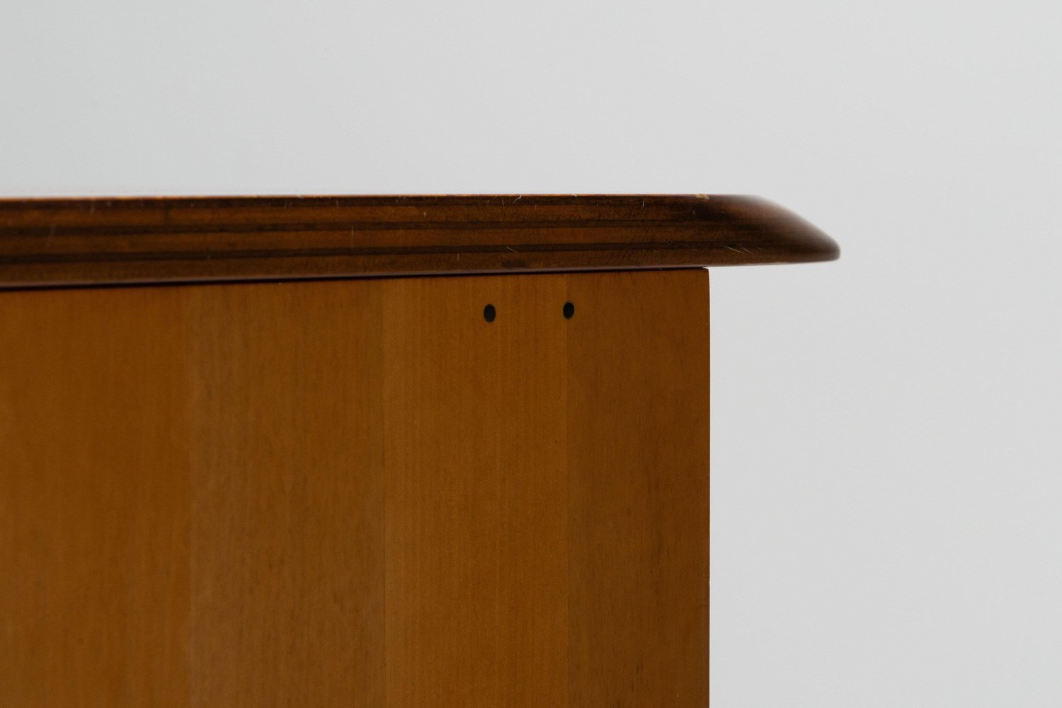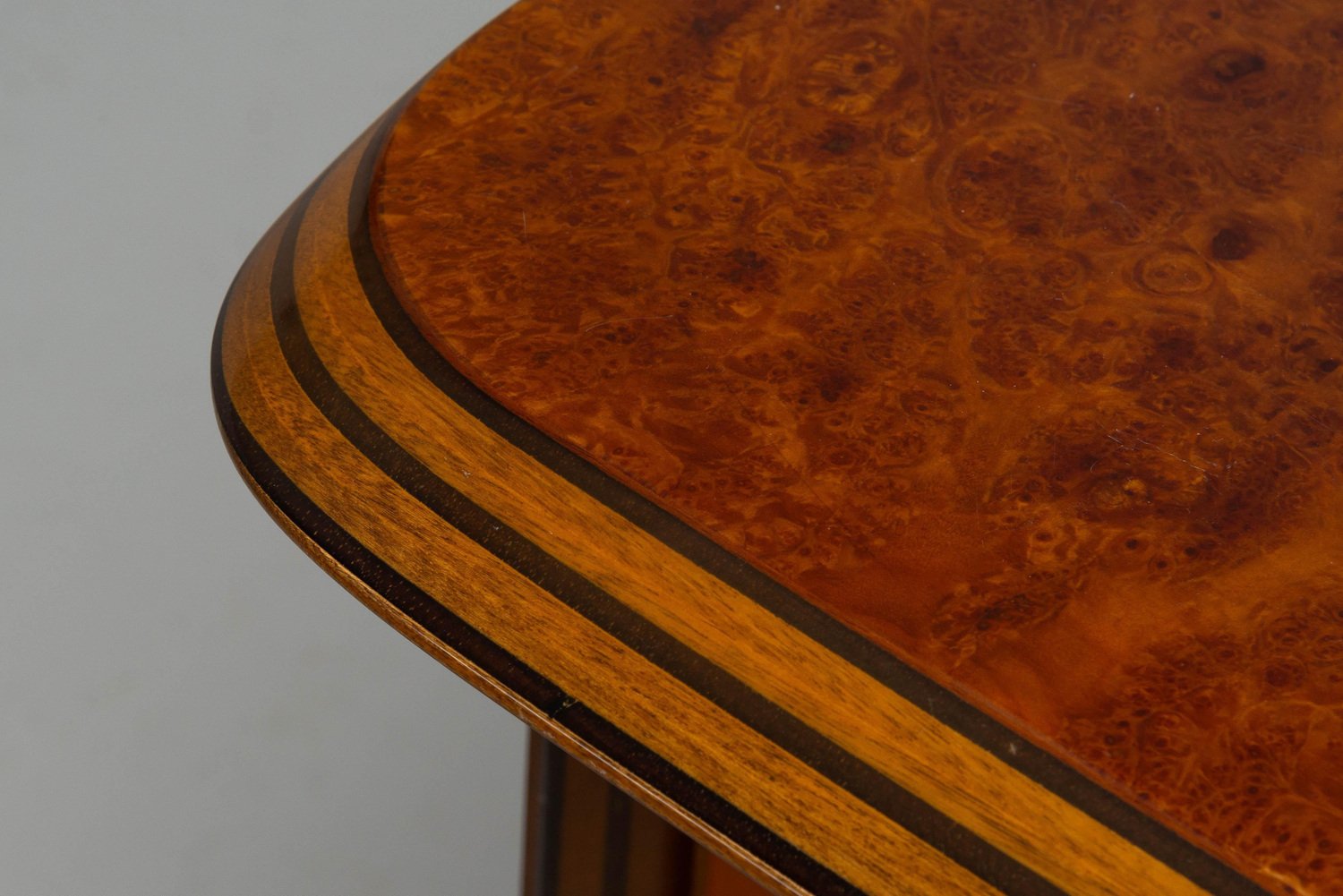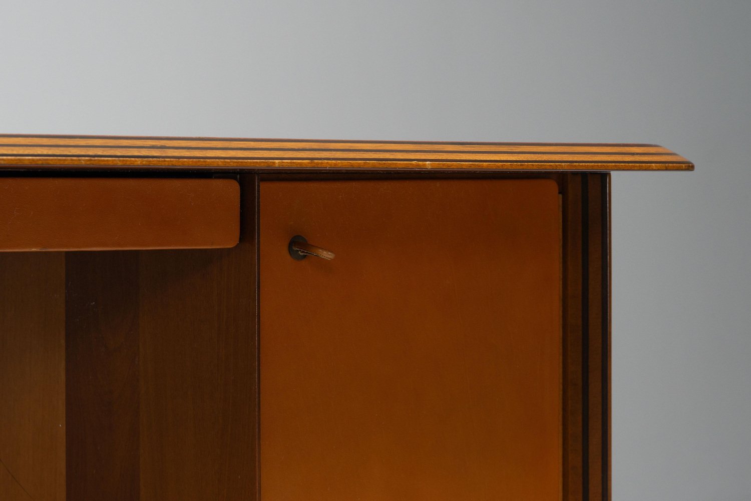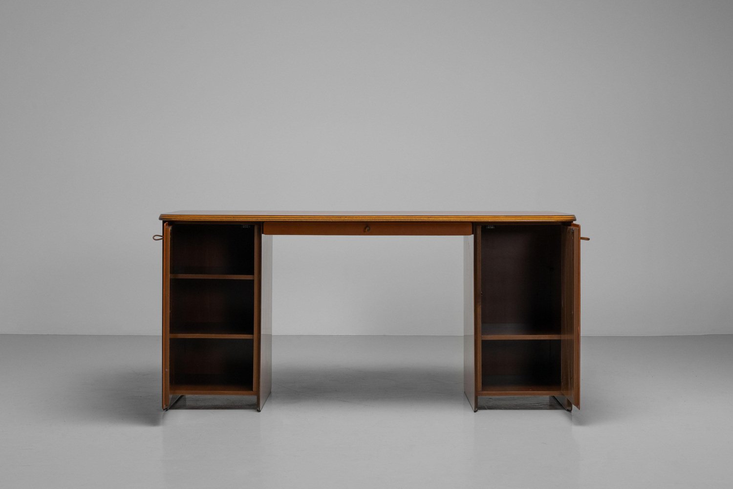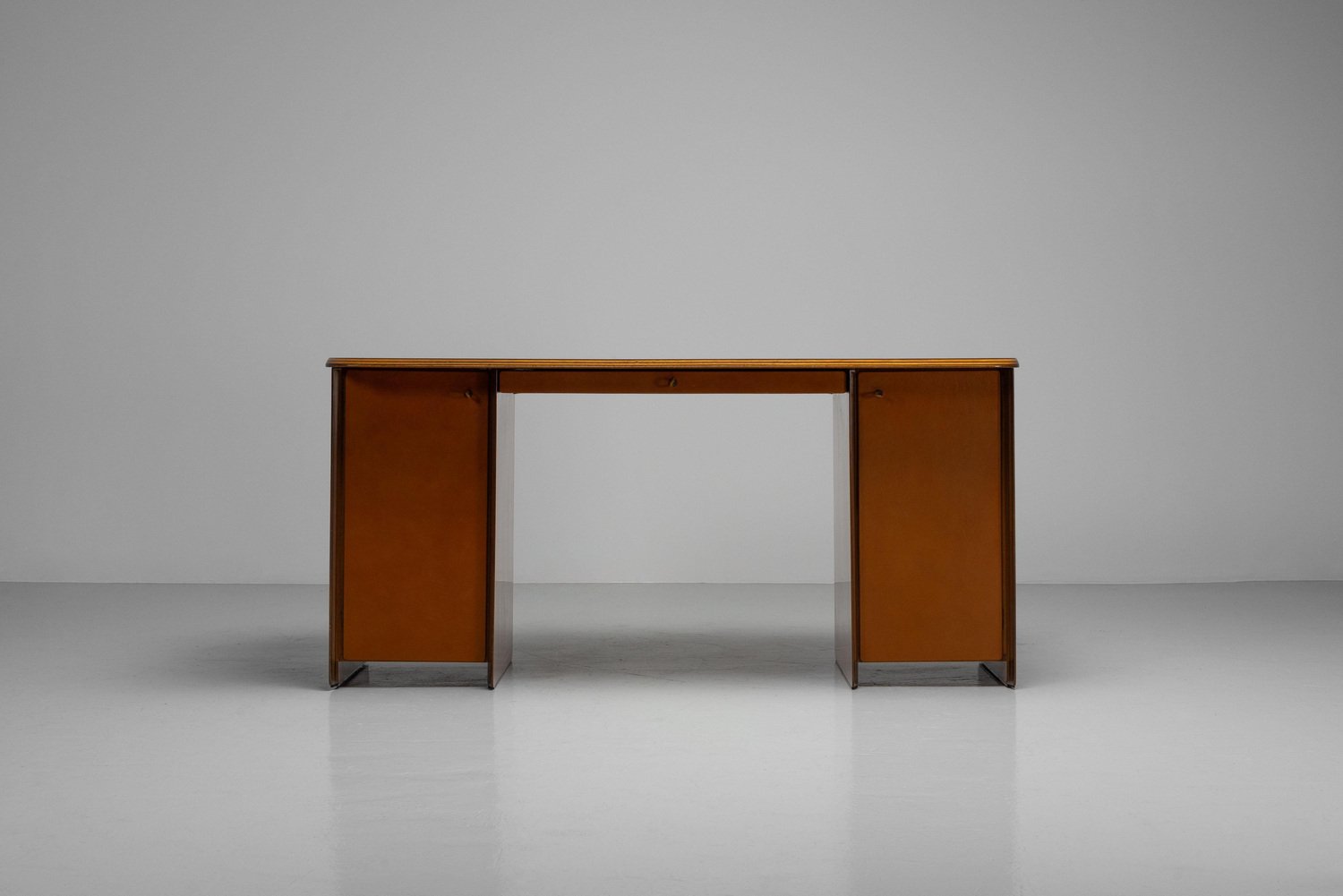 Beautiful writing desk model 7737 from the Artona series designed by Afra e Tobia Scarpa and manufactured by Maxalto in Italy, 1975. The top has a striking burl-wood veneer with a mesmerizing pattern. The bottom features walnut veneer compartments with leather-covered doors and leather “loop" handles. The edges show the typical Artona signature with dark lines in the wood, slightly angled. The warm orange/brown color of the top complements the cognac brown leather and walnut wood. The desk features a thin drawer in the middle and storage space on both sides, with two shelves on the left and one on the right behind the leather-covered doors. This desk combines aesthetics with practicality, making it perfect for working in style. Very nice quality designed desk in very good original condition. The chair on the pictures is not included but can be purchased here. The ‘Artona’ line, crafted by the Scarpa duo, holds historical significance as it marked the beginning of Maxalto, a specialized branch of B&B Italia. Maxalto, founded in 1975, was dedicated to crafting artisanal, predominantly wooden furniture. The ‘Artona’ series was their first project for Maxalto and also served as a counterpoint to the prevailing trend of using plastics in furniture design during the postwar era. Afra and Tobia Scarpa are award winning postmodern Italian architects and designers. Their pieces can be found in museums across the United States and Europe, including collections in MoMa and the Louvre Museum. They have collaborated with companies such as B&B Italia, San Lorenzo Silver, Molteni, and Knoll International. They have won a number of awards such as the Compasso d’Oro in 1969 to the International Forum Design in 1992. Their design work consists of architecture and everyday household items including, furniture, clothing, interior design, art glass. They focused on the technical and aesthetic possibilities of materials in their designs. The couple was greatly influenced by Tobia’s father, Carlo Scarpa, a Venetian architect and designer. Read more…