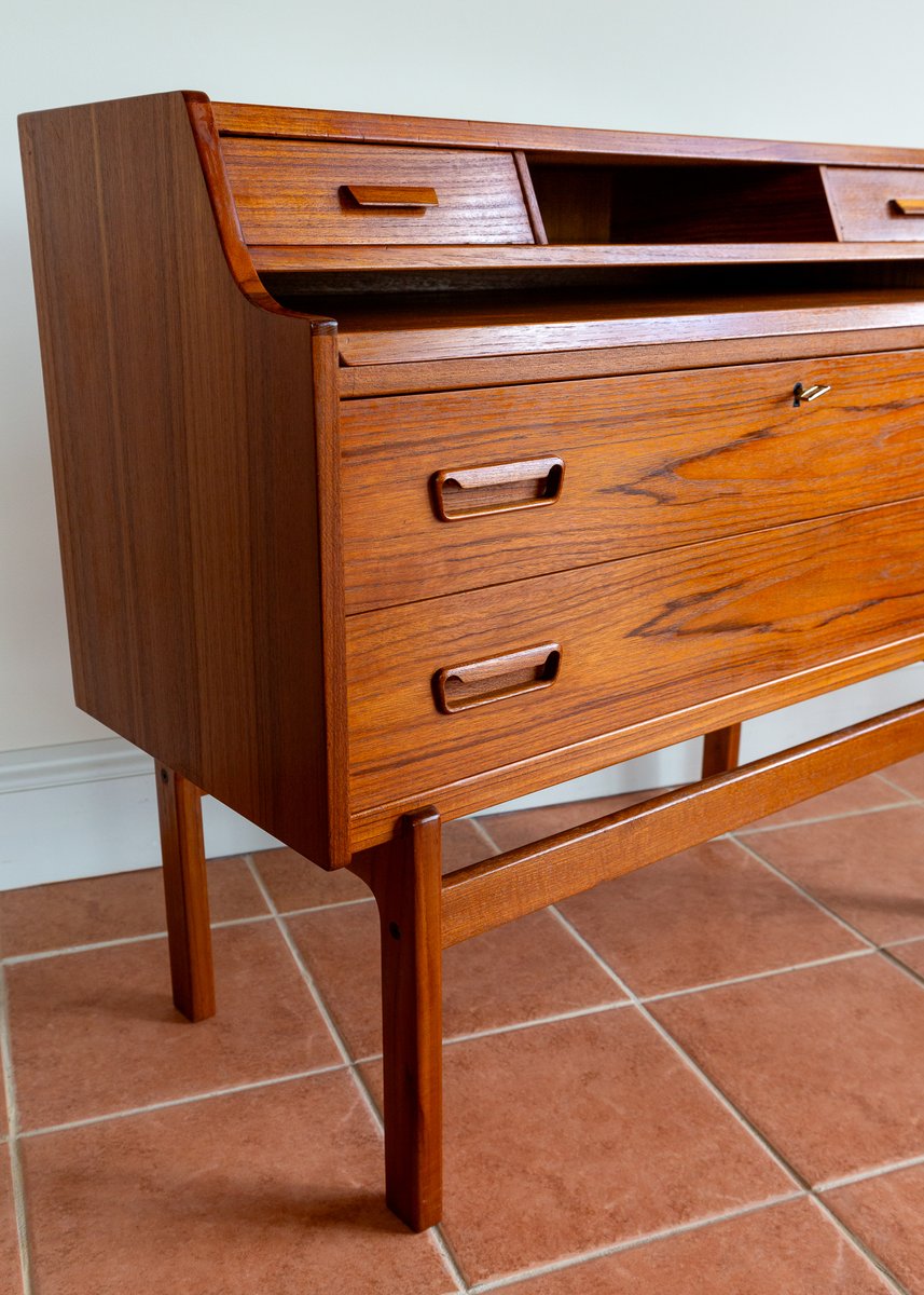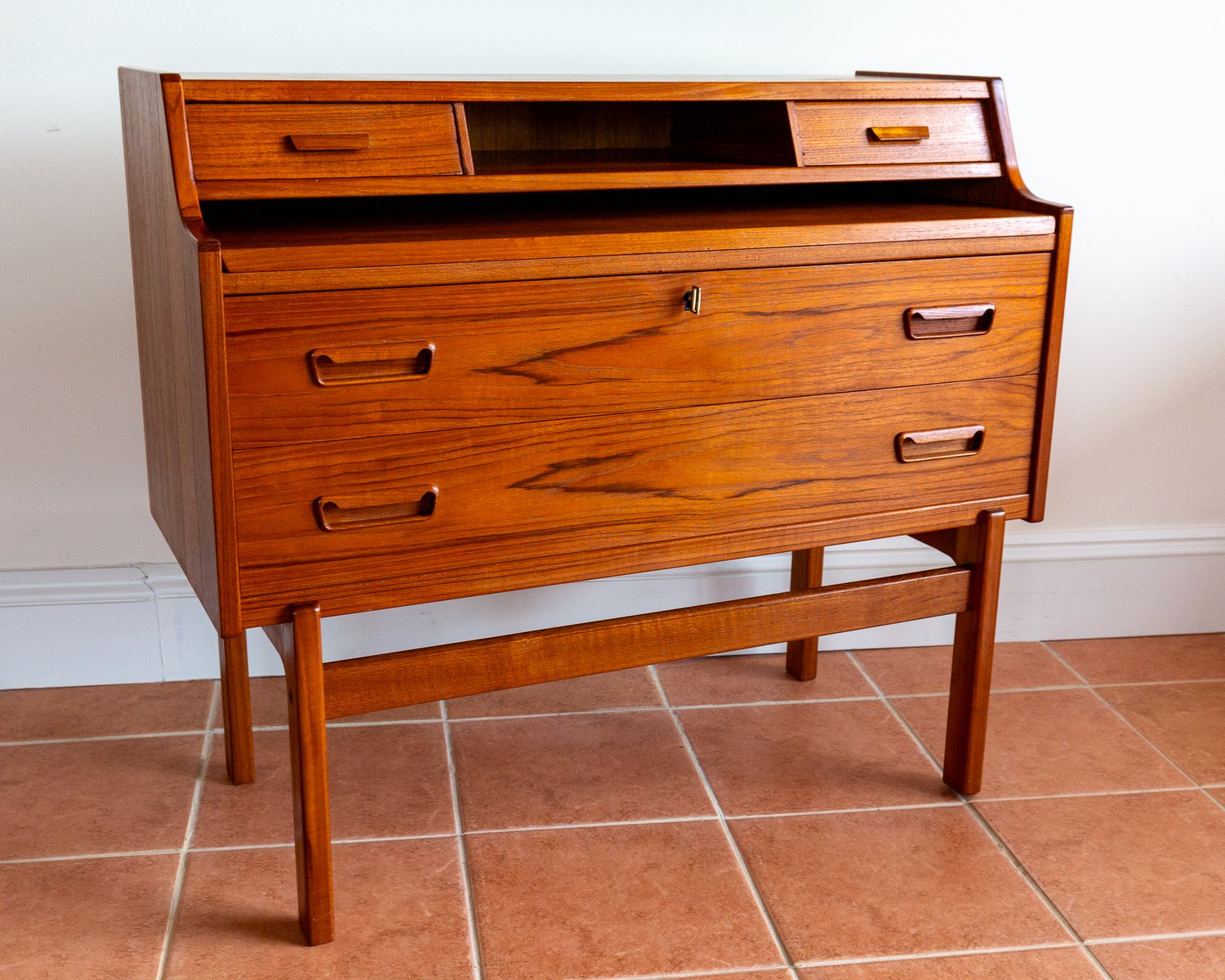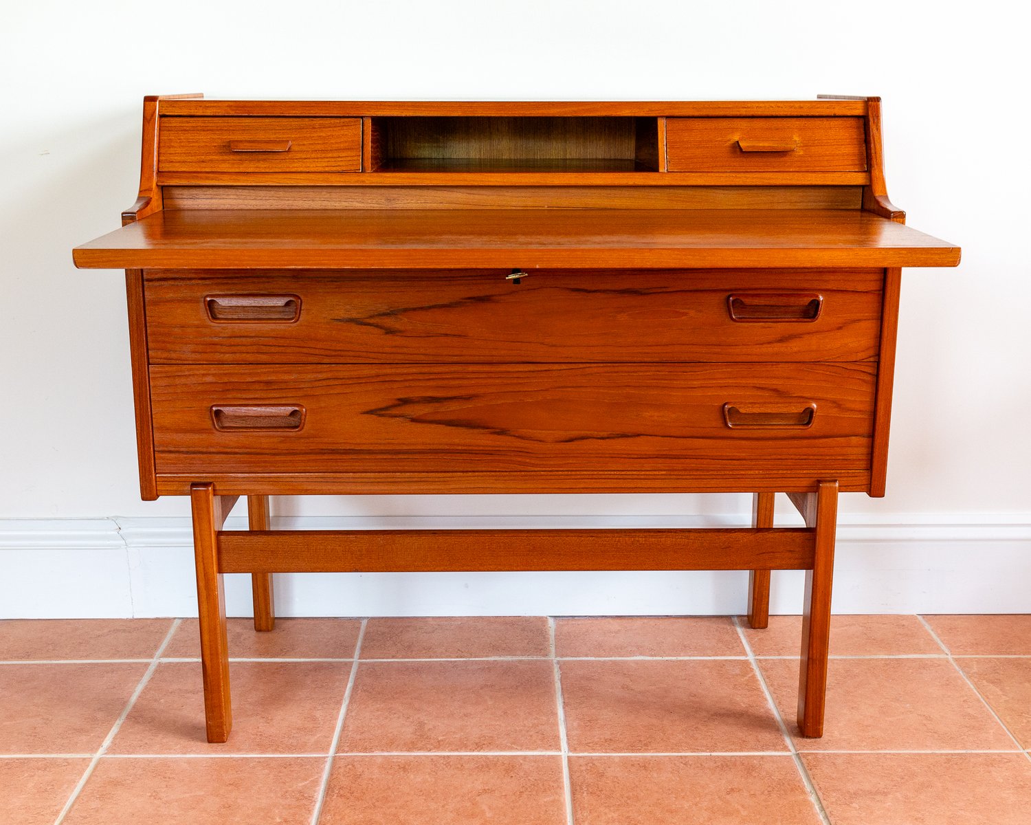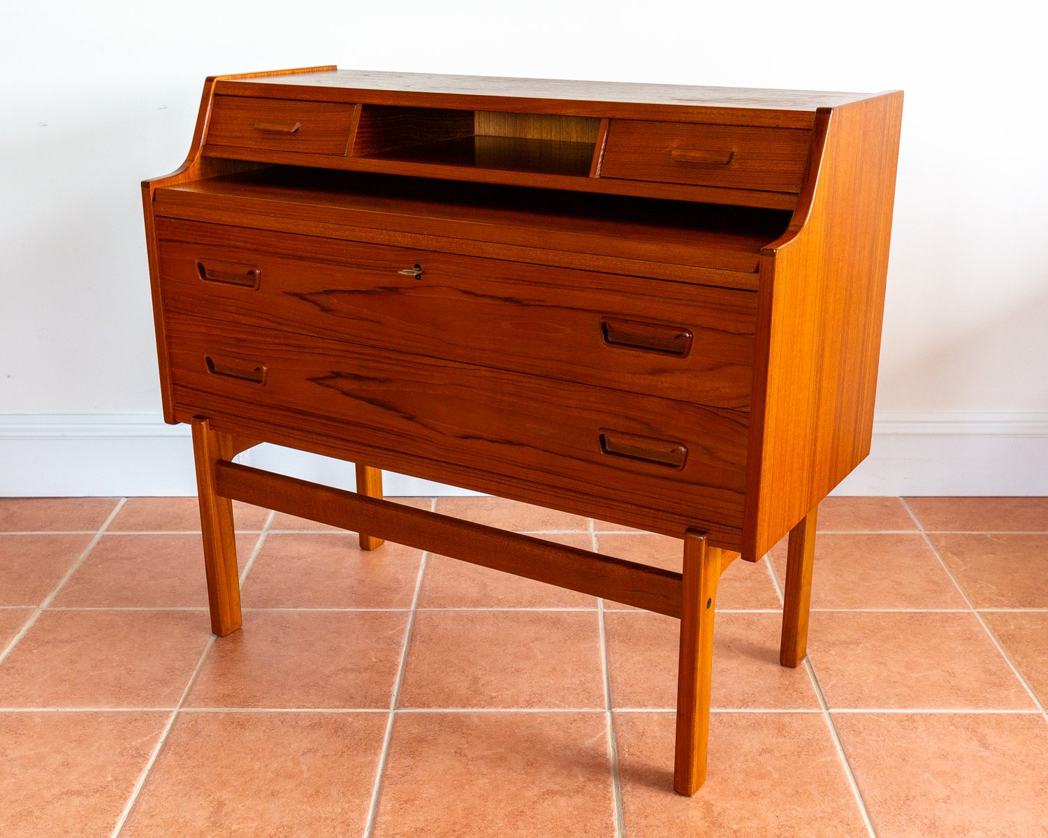 There’s so much design excellence and quality to admire in this superb bureau, which really makes it stand out as a prestigious piece of Danish design: from the graduated waterfall effect of the two surface areas, adjoined by a lovely ski-jump curve, to the use of dovetail joinery and subtly curving corners throughout; from the charming quality of the lower drawer handles to the streamlined, angular upper handles, which match the slanted front of the slide-out desk; from the lovely silhouette effect of the lower front crossbar stretcher to the gorgeous rich colouring and superb grain detailing of the wood, and from the engineered perfection of all the parts to the smooth working of the original key – this fine piece has it all!