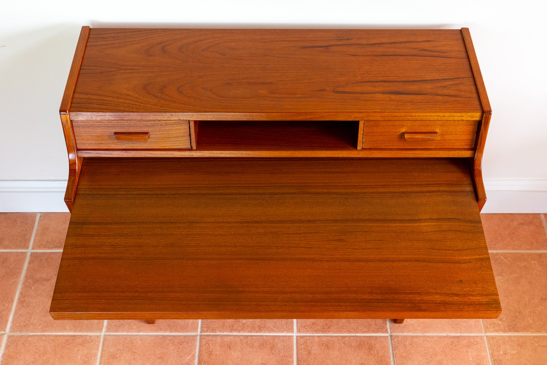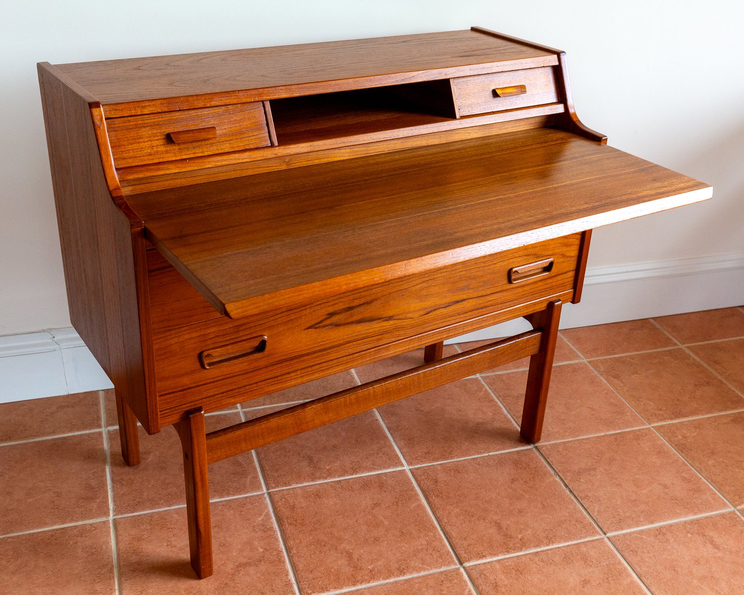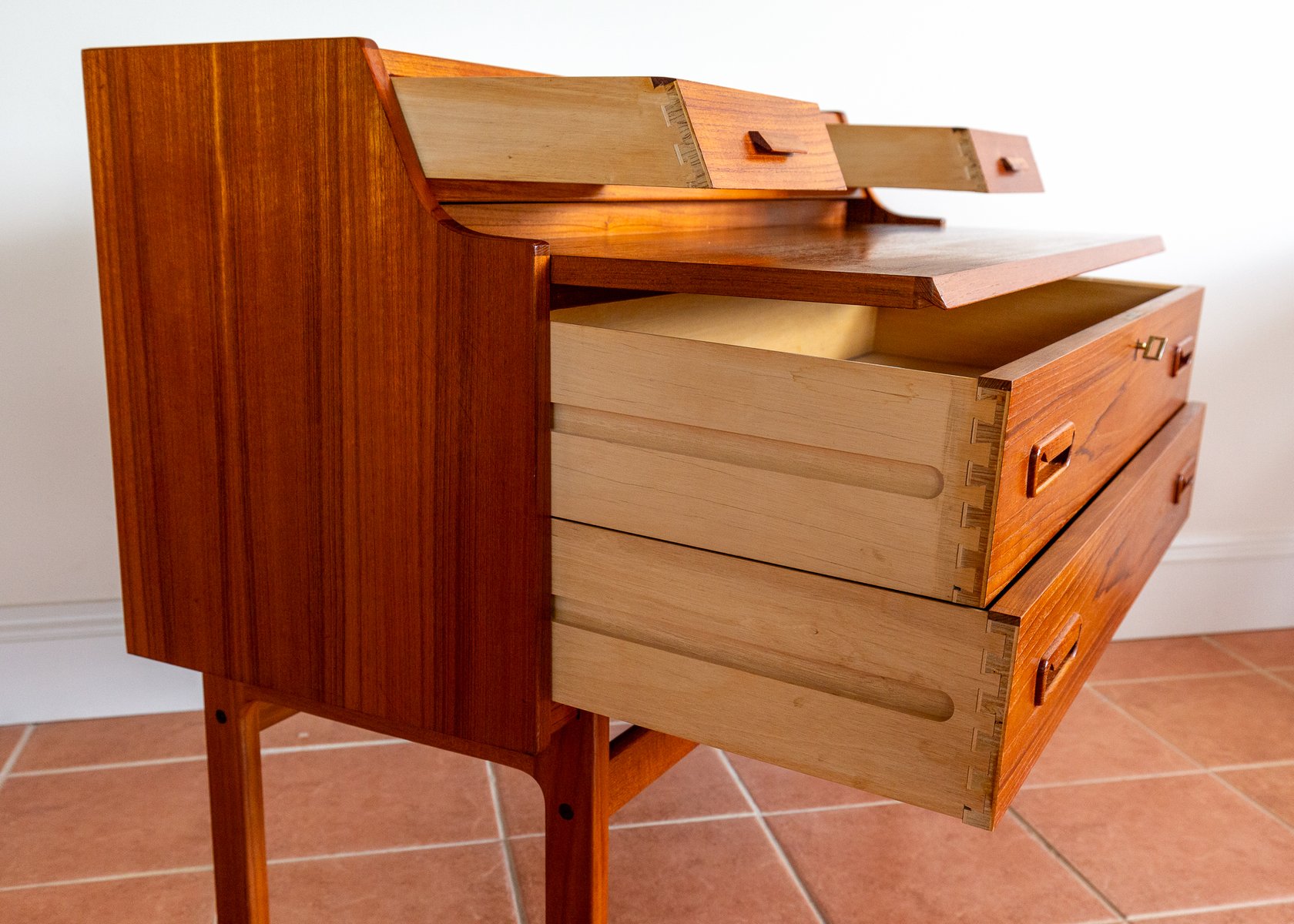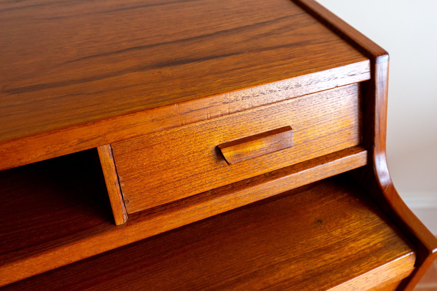 There’s so much design excellence and quality to admire in this superb bureau, which really makes it stand out as a prestigious piece of Danish design: from the graduated waterfall effect of the two surface areas, adjoined by a lovely ski-jump curve, to the use of dovetail joinery and subtly curving corners throughout; from the charming quality of the lower drawer handles to the streamlined, angular upper handles, which match the slanted front of the slide-out desk; from the lovely silhouette effect of the lower front crossbar stretcher to the gorgeous rich colouring and superb grain detailing of the wood, and from the engineered perfection of all the parts to the smooth working of the original key – this fine piece has it all!