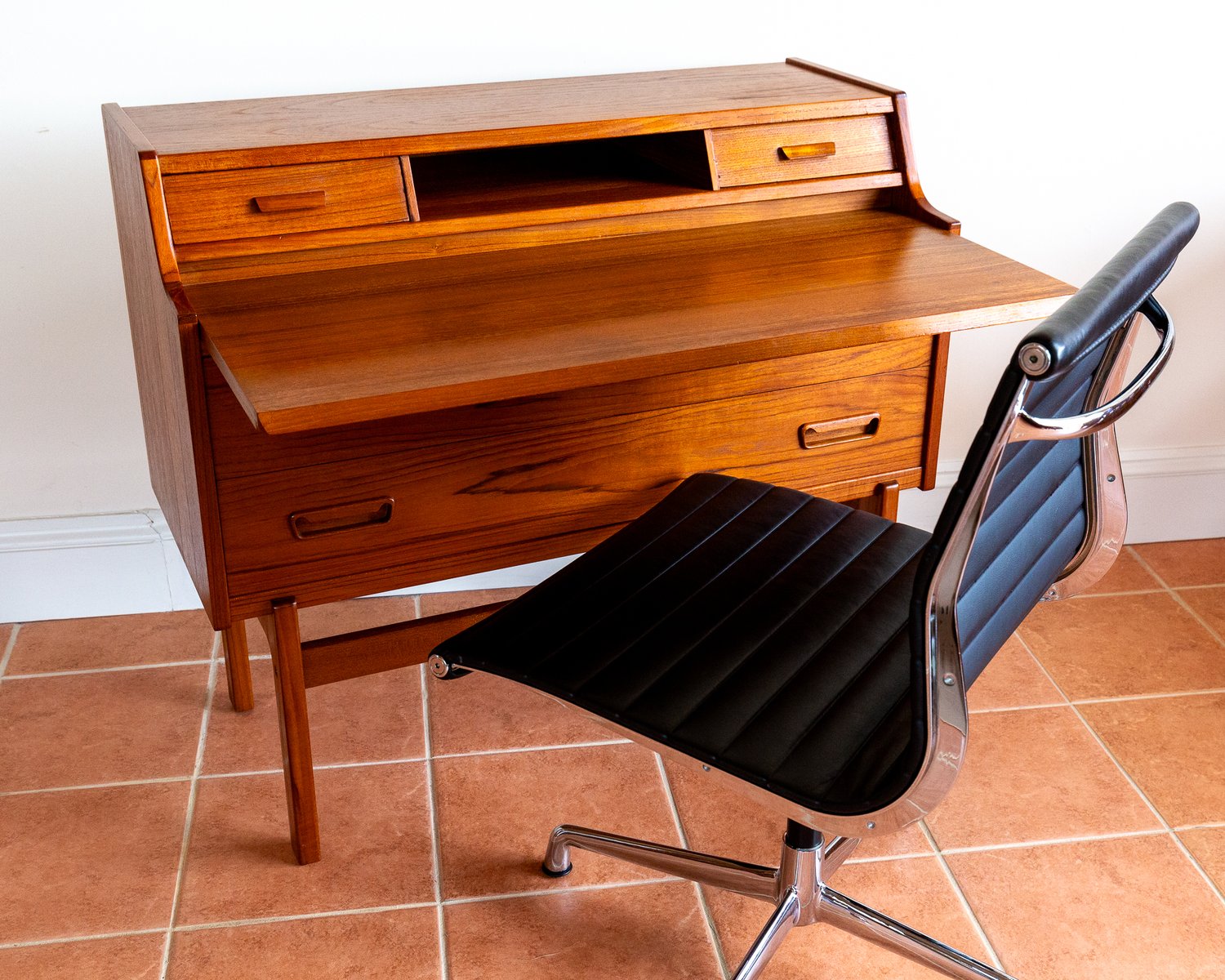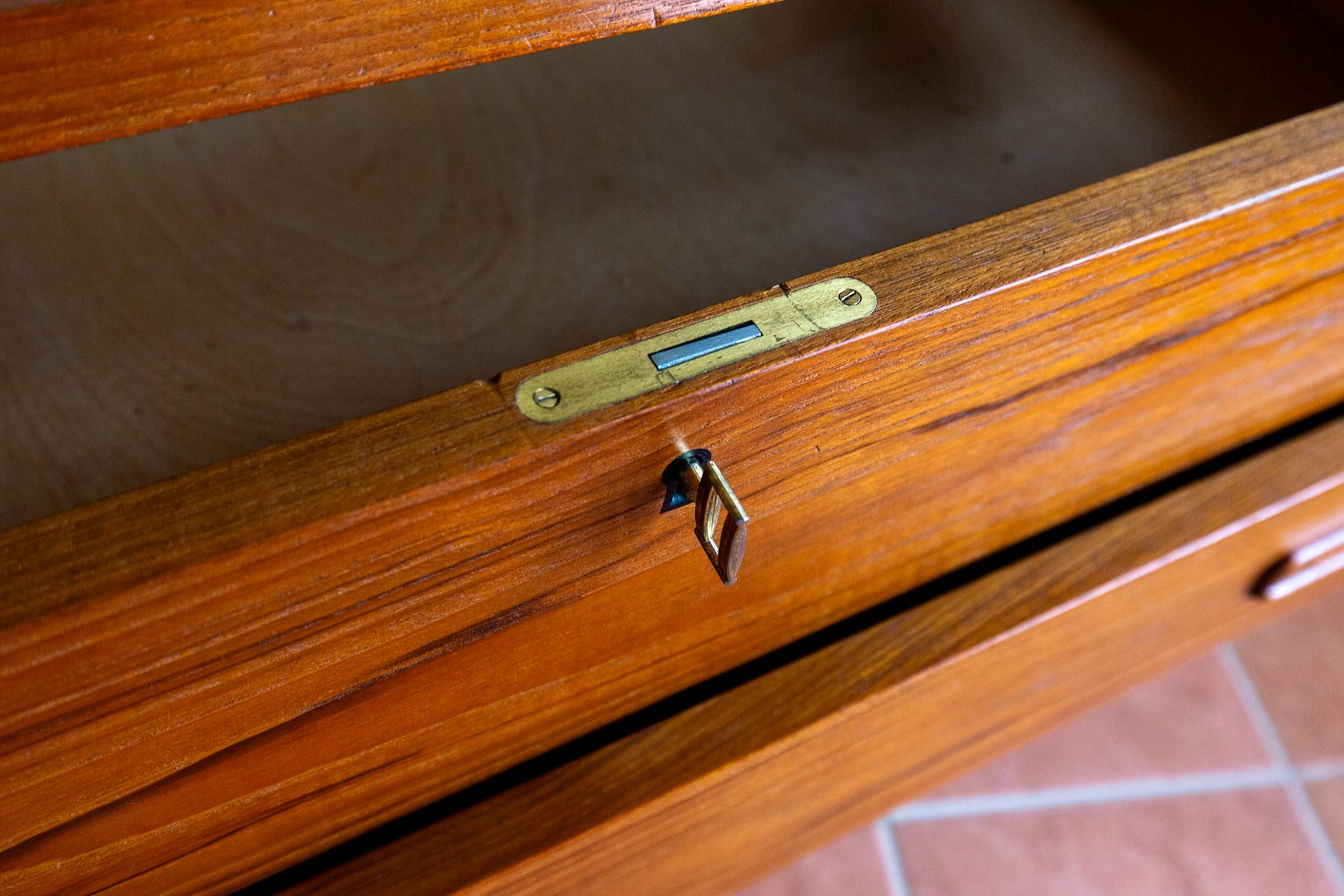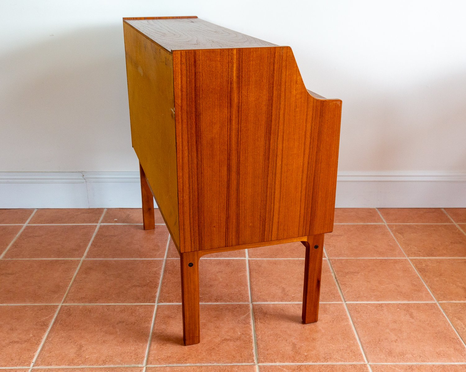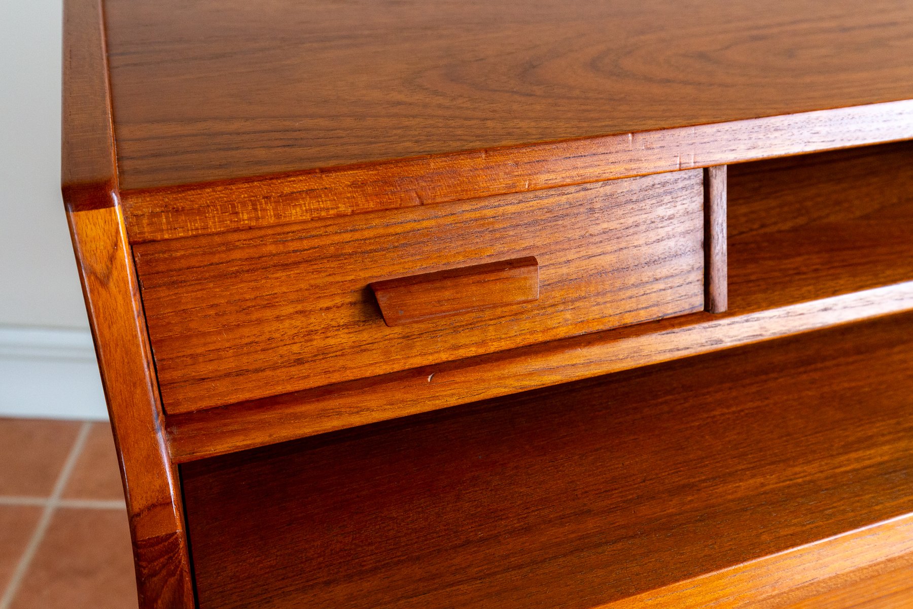 There’s so much design excellence and quality to admire in this superb bureau, which really makes it stand out as a prestigious piece of Danish design: from the graduated waterfall effect of the two surface areas, adjoined by a lovely ski-jump curve, to the use of dovetail joinery and subtly curving corners throughout; from the charming quality of the lower drawer handles to the streamlined, angular upper handles, which match the slanted front of the slide-out desk; from the lovely silhouette effect of the lower front crossbar stretcher to the gorgeous rich colouring and superb grain detailing of the wood, and from the engineered perfection of all the parts to the smooth working of the original key – this fine piece has it all!