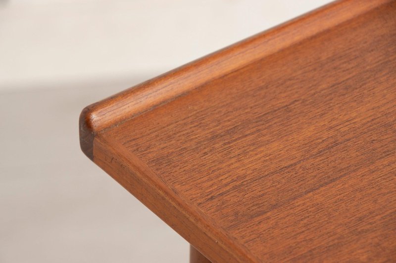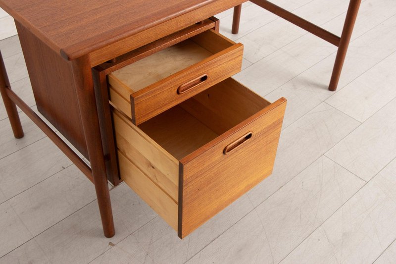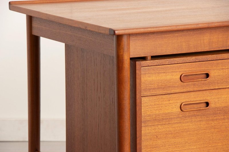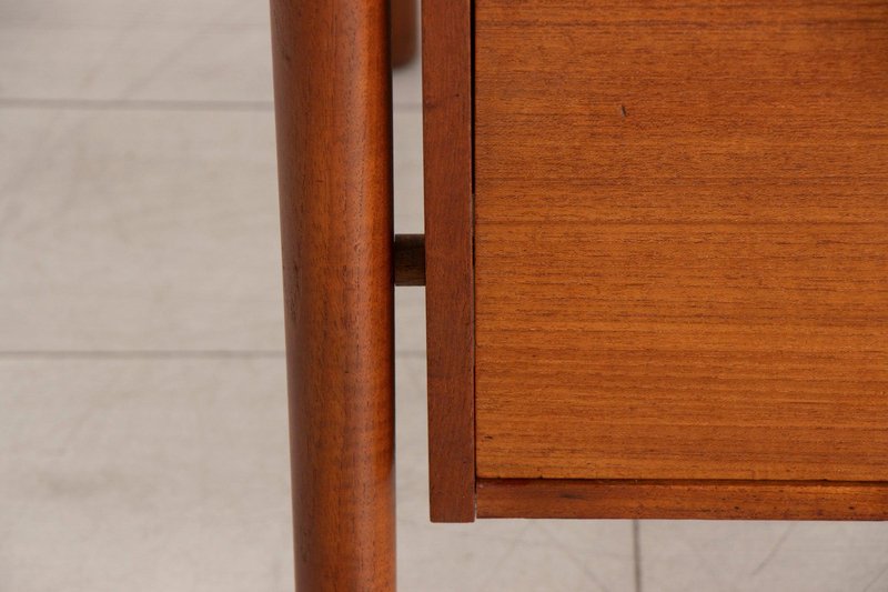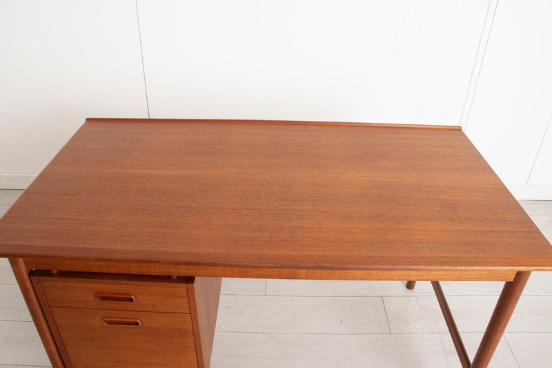 Scrivania svedese di metà secolo in teak di Seffle Möbelfabrik, risalente agli anni Sessanta. La scrivania presenta un design minimalista con linee pulite, caratteristiche dello stile moderno scandinavo. Ha un piano rettangolare con un bordo posteriore leggermente rialzato e un singolo piedistallo di cassetti sul lato sinistro, compresi due cassetti con maniglie integrate. La scrivania è sostenuta da gambe sottili e affusolate, che conferiscono un aspetto leggero e arioso pur mantenendo la stabilità. Il legno di teak conferisce una finitura calda e naturale, che riflette l'estetica funzionale ed elegante del design di metà secolo. H: 72 cm L: 130 cm P: 70 cm Apertura al ginocchio: 62,5 cm - 74 cm.