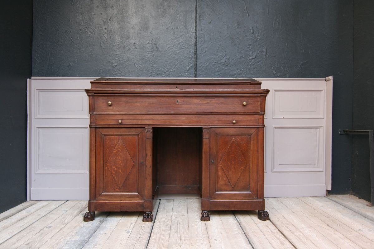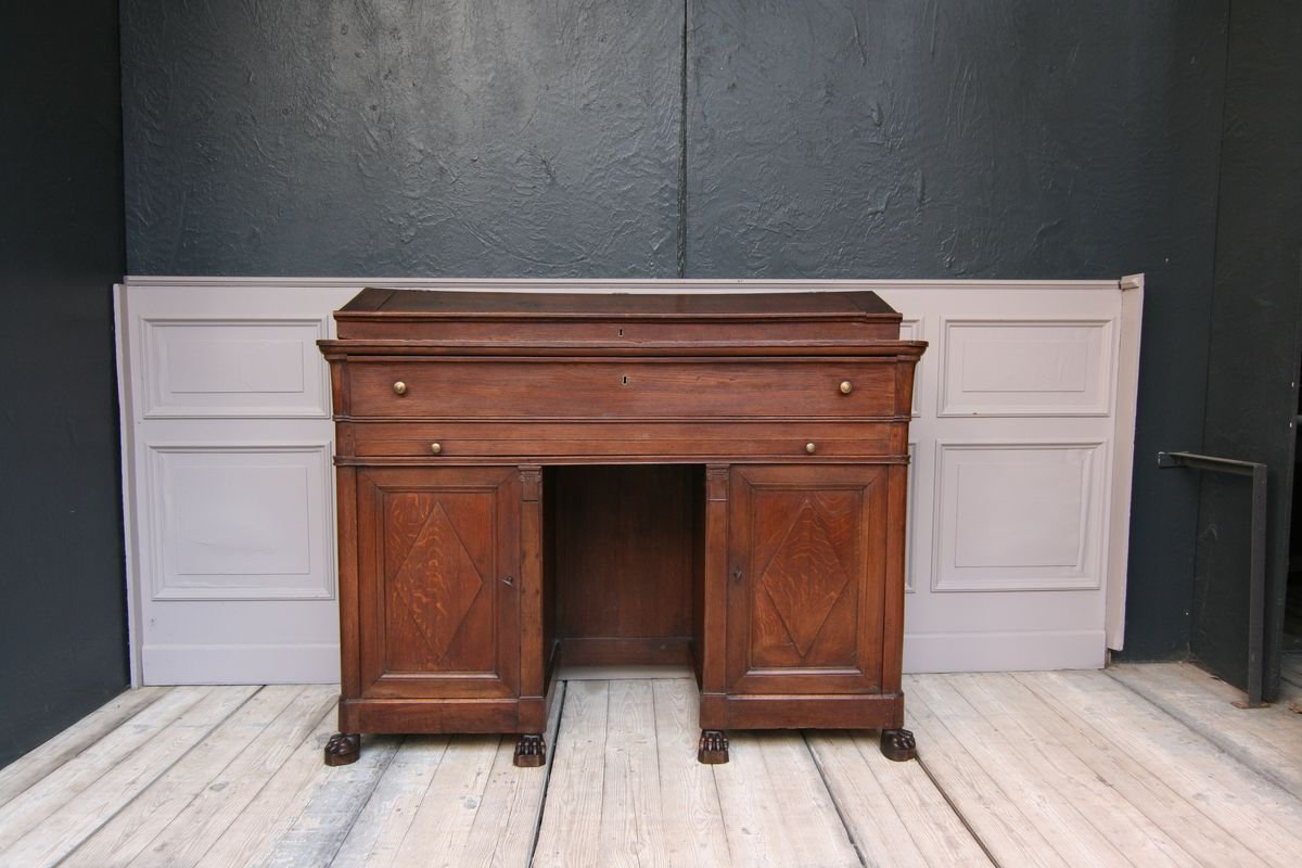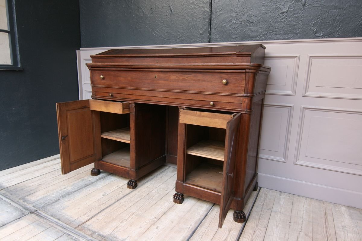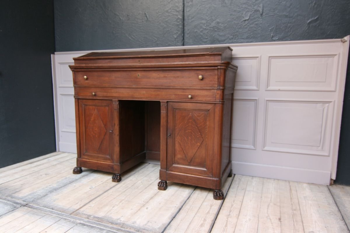 Standing on lion feet, 2 base units with one door each, behind which there is one drawer and one shelf. The lion paws feet suggest the French style epoch of the Empire, whereas the diamonds on the door panels are more attributed to Louis Size. Above this is a pull-out board with 2 brass knobs and above this again a large drawer (new brass knobs have been mounted here. On the board lies the desk top with flap.