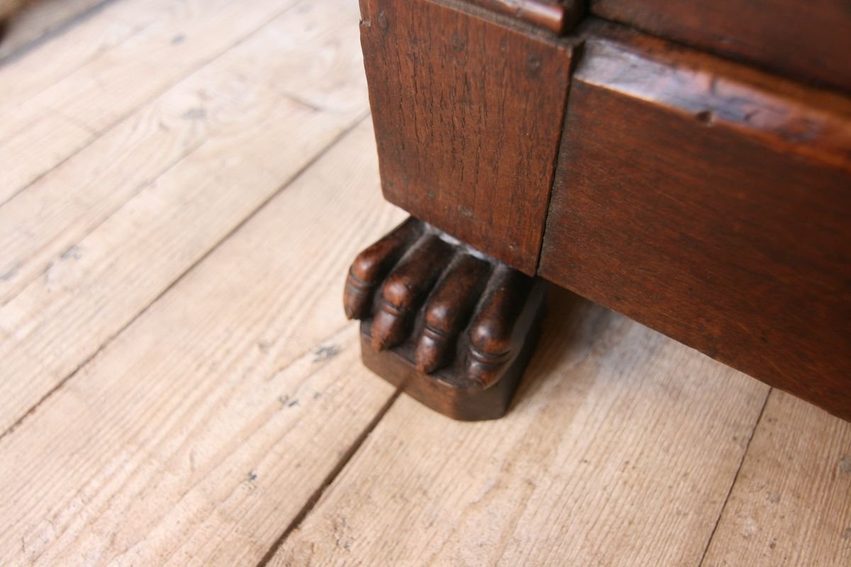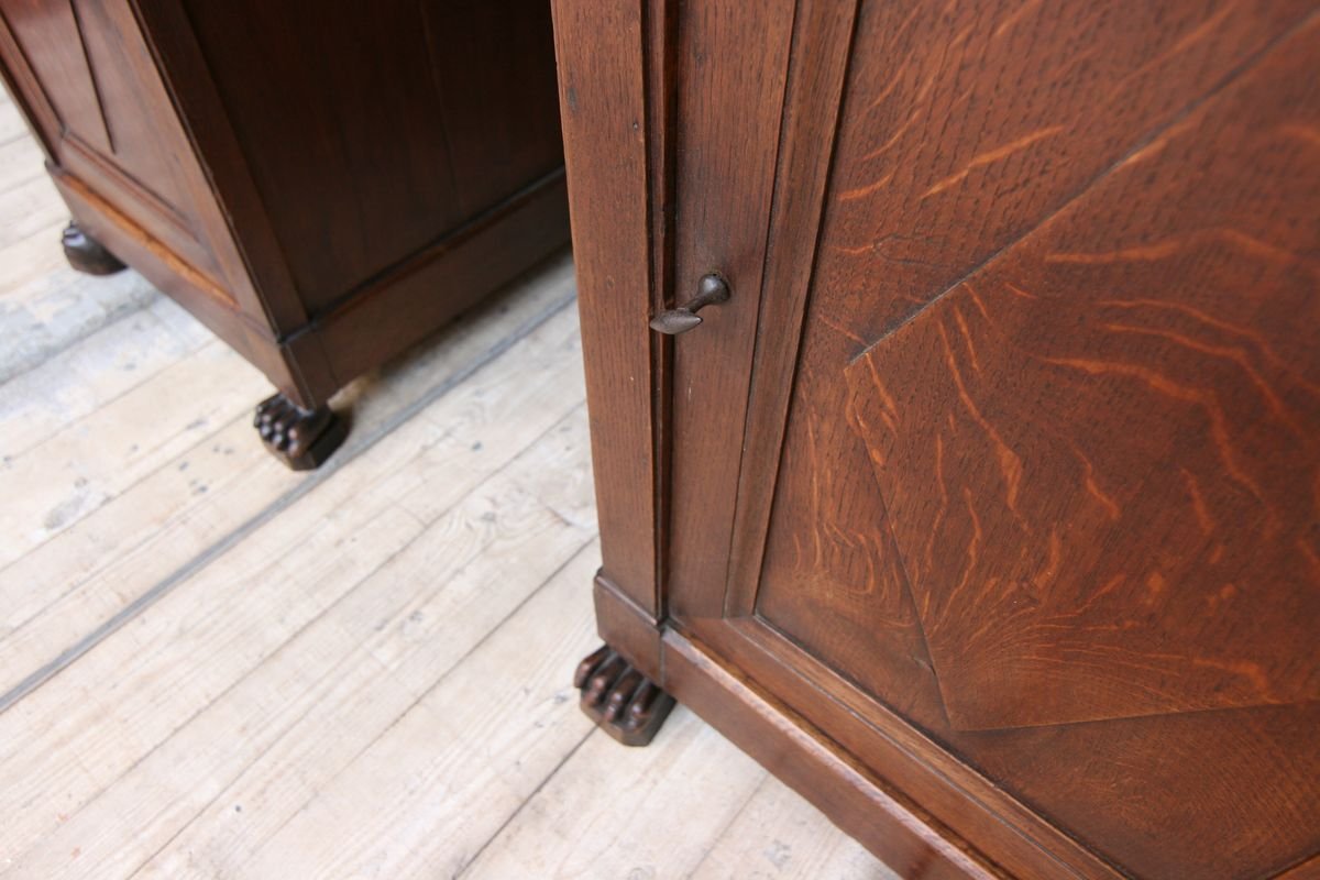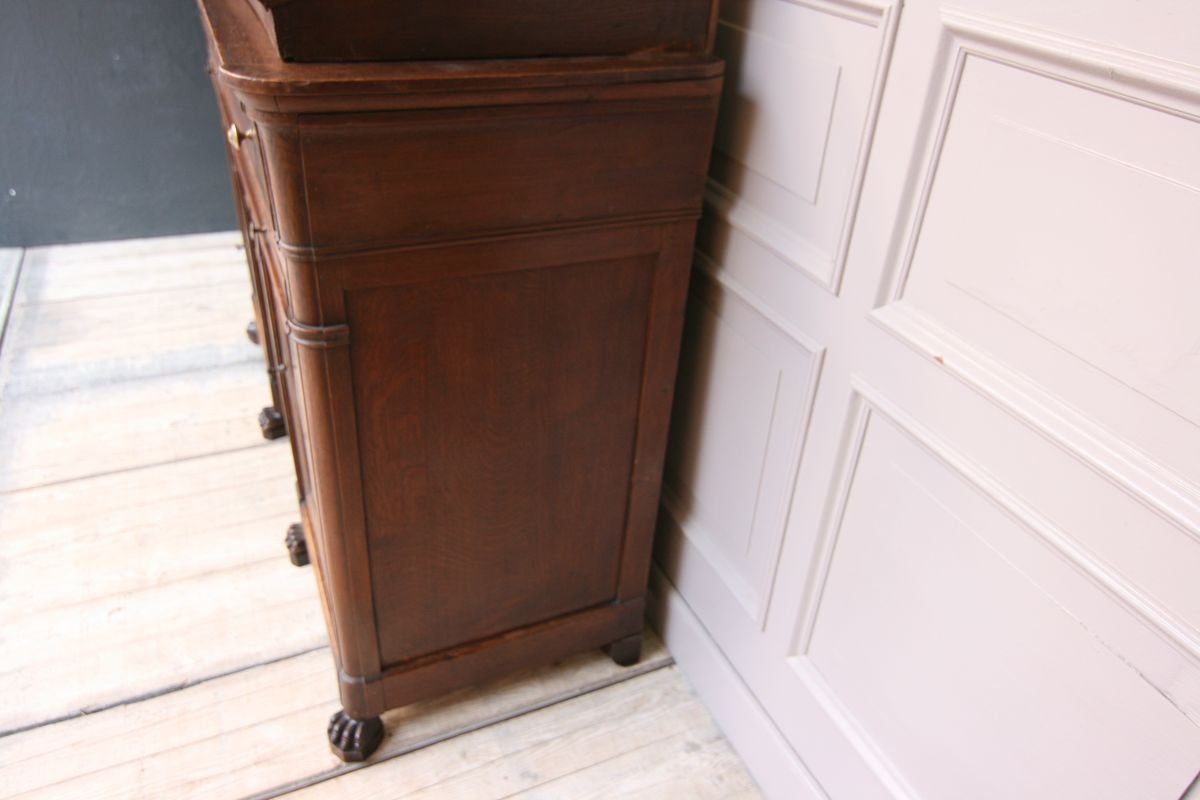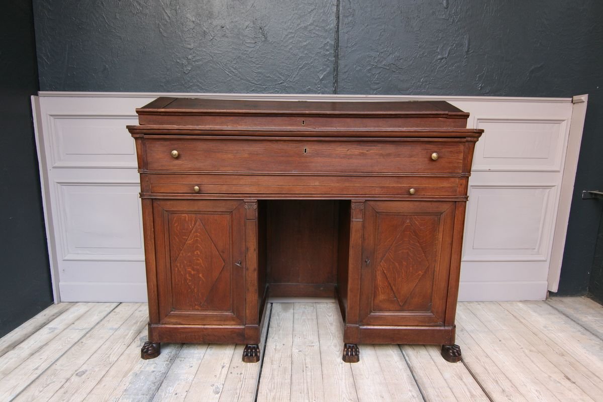 Standing on lion feet, 2 base units with one door each, behind which there is one drawer and one shelf. The lion paws feet suggest the French style epoch of the Empire, whereas the diamonds on the door panels are more attributed to Louis Size. Above this is a pull-out board with 2 brass knobs and above this again a large drawer (new brass knobs have been mounted here. On the board lies the desk top with flap.