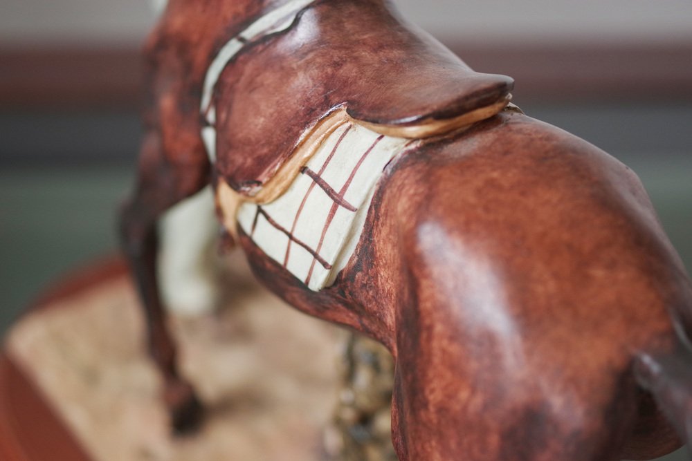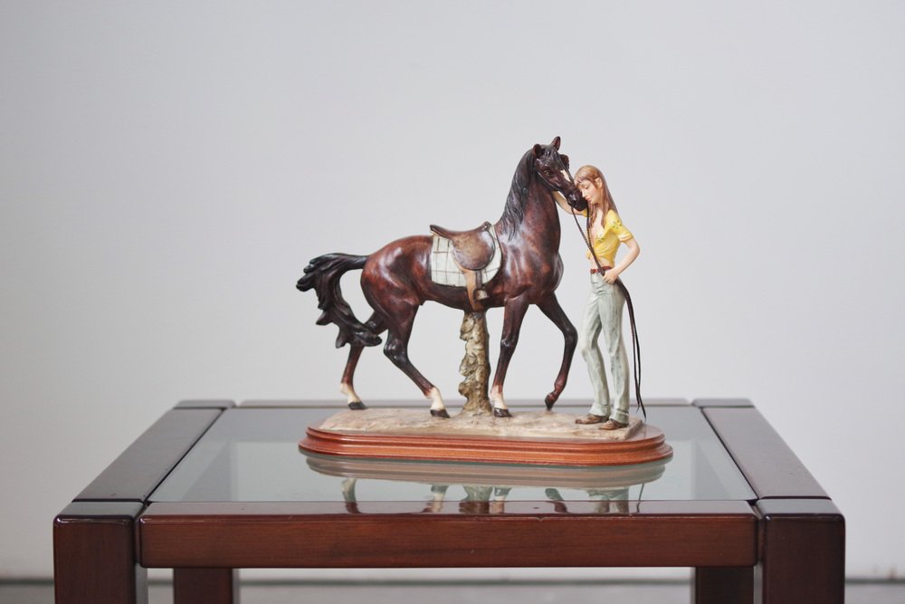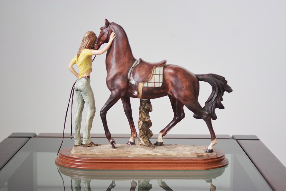 Dettagli raffinati: Lavoro in ceramica meticolosamente dettagliato, che mette in evidenza l'intricata anatomia del cavallo e l'espressione gentile della donna.