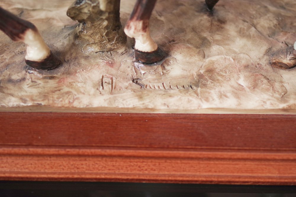 This A. Saulini sculpture captures the essence of a serene bond between human and horse, making it more than just decor—it's a statement of refined taste. The ceramic and wood combination gives it a unique, tactile quality that sets it apart, making it perfect for any vintage or equestrian art collection. Ideal for display on a shelf, table, or mantel, this sculpture adds character and elegance to your space.