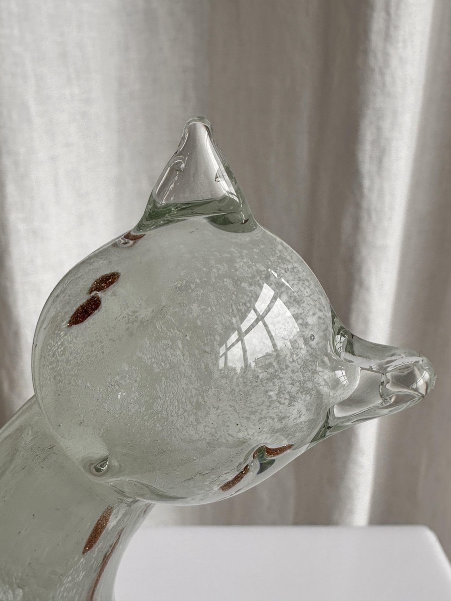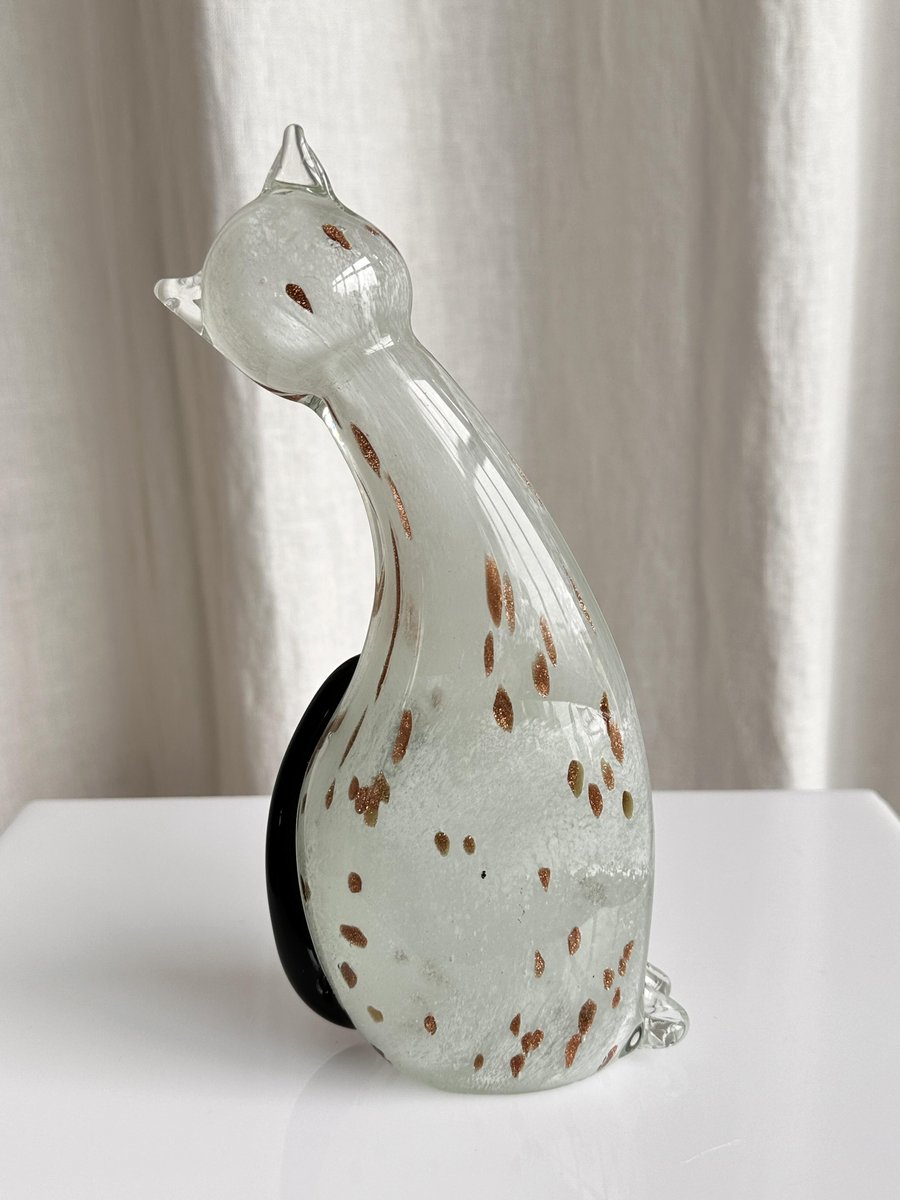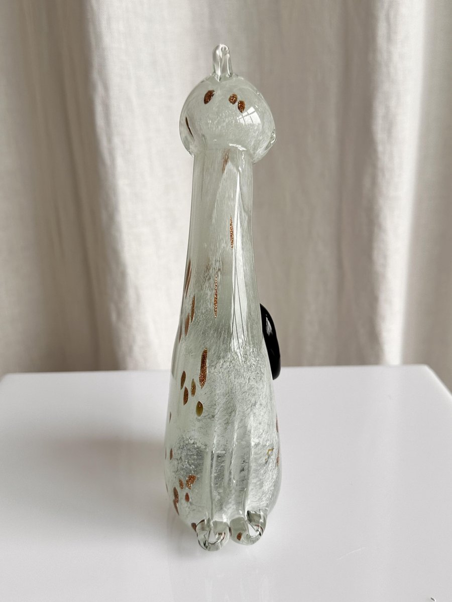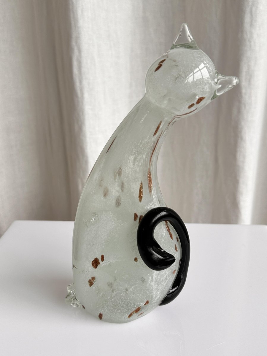 Graziosa statuetta di gatto in vetro di Murano di colore bianco avorio con rosette dorate. Graziosa figura, splendido colore avorio traslucido del gattino in vetro. Le rosette dorate aggiungono un tocco di eleganza, che corrisponde alla natura di un gatto reale. È il pezzo perfetto per ornare la credenza, la mensola o il tavolo, e non solo per gli appassionati di vetro di Murano! Non importa se siete amanti dei gatti o dei cani, questa bellezza diventerà sicuramente un elemento divertente ed esteticamente piacevole nella vostra casa.