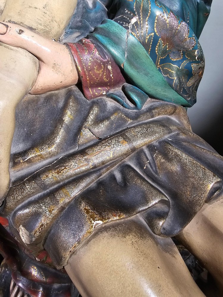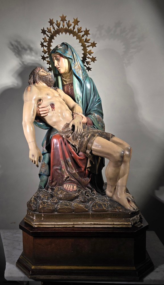 Immergetevi nella struggente bellezza di questa significativa scultura in legno intagliato e policromo che raffigura l'iconica scena della Pietà. Realizzata probabilmente in Spagna durante il XIX secolo, quest'opera d'arte è un'impressionante testimonianza dell'arte sacra e della maestria artistica dell'epoca. La scultura, eseguita con qualità eccezionale, cattura la delicatezza e la devozione della scena della Pietà, in cui la Vergine Maria culla il corpo di Gesù Cristo dopo la crocifissione. Nonostante alcune piccole perdite, come mostrato nelle foto di accompagnamento, queste non diminuiscono significativamente il valore o la bellezza del pezzo. Con dimensioni di 108x60x55 cm, compresa la base in legno, questa scultura possiede una presenza imponente che richiama l'attenzione in qualsiasi spazio. L'espressività delle figure e la meticolosa attenzione ai dettagli testimoniano il talento dello scultore e la sua profonda comprensione del tema religioso. Che sia al centro di una collezione d'arte sacra o come elemento di spicco in uno spazio devozionale, questa scultura della Pietà affascinerà tutti coloro che la guarderanno con la sua forza emotiva e la sua straordinaria maestria. È un vero gioiello del XIX secolo che merita di essere apprezzato e ammirato dalle generazioni future.