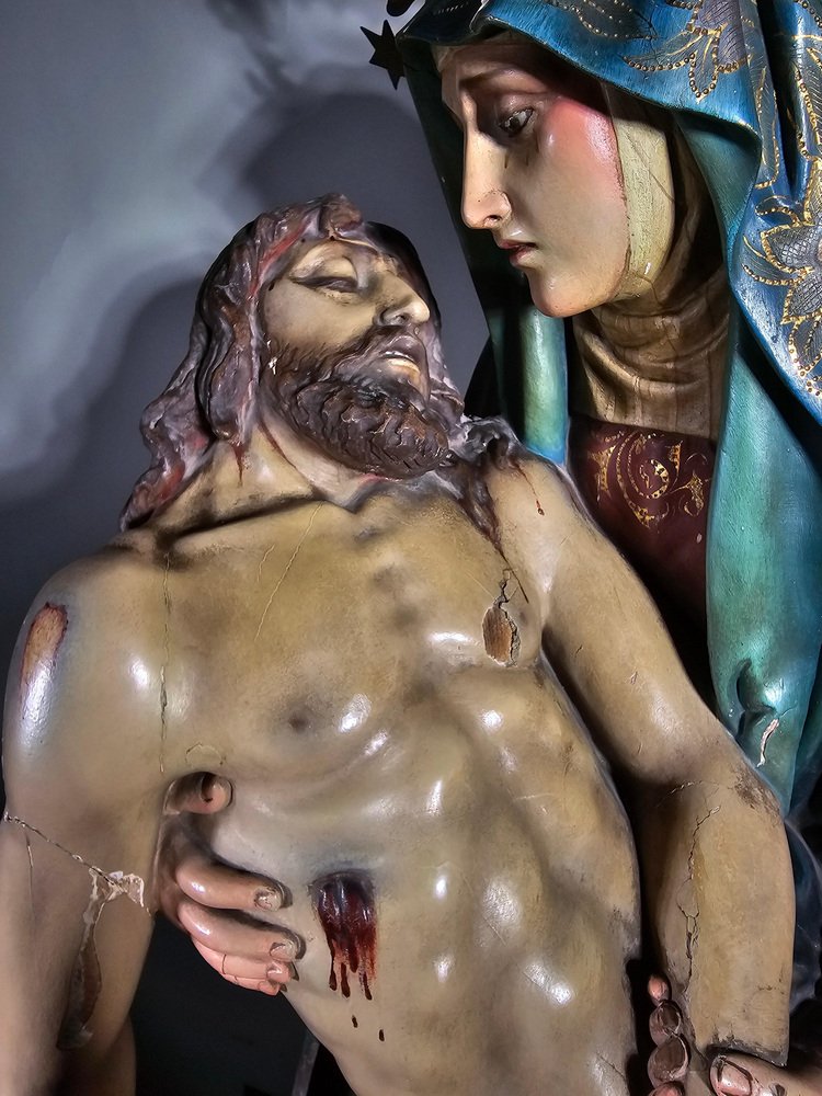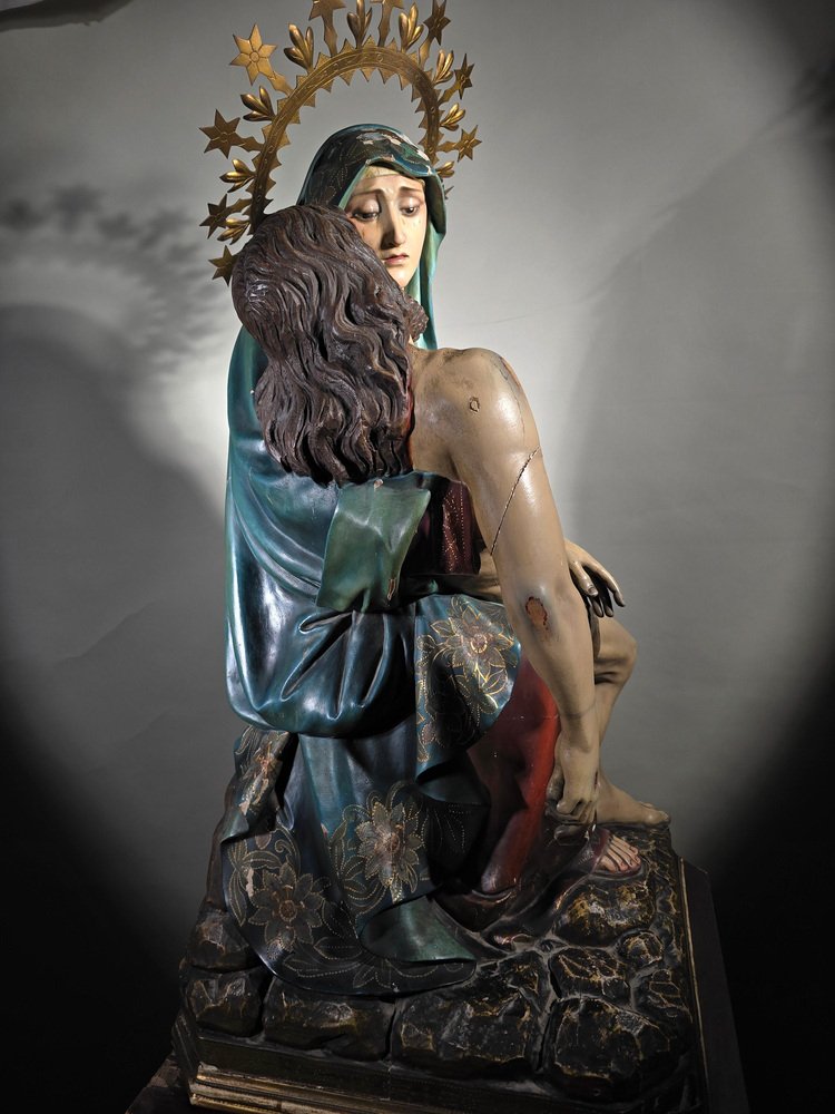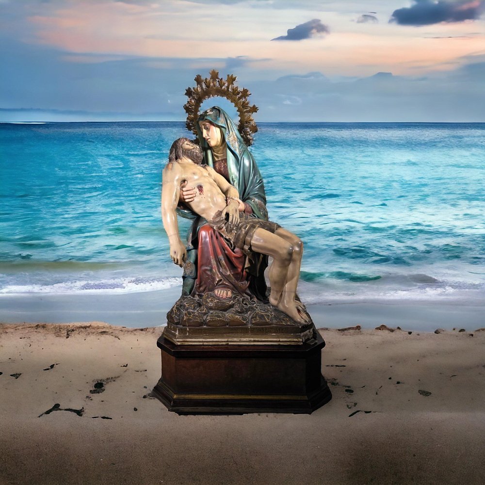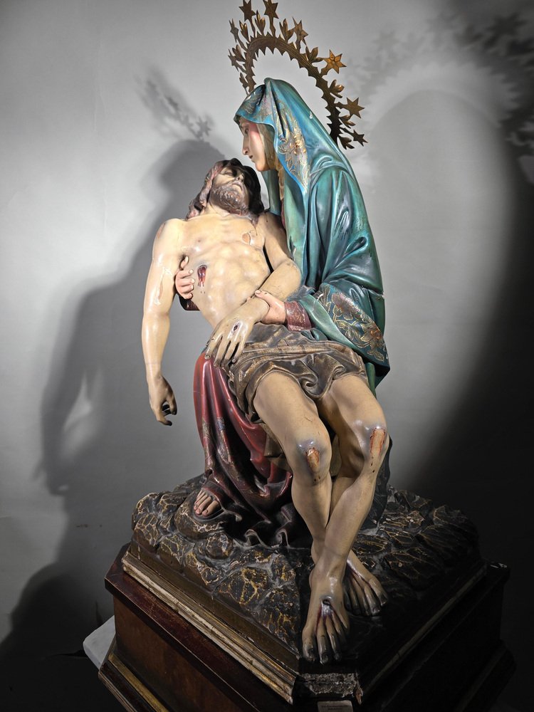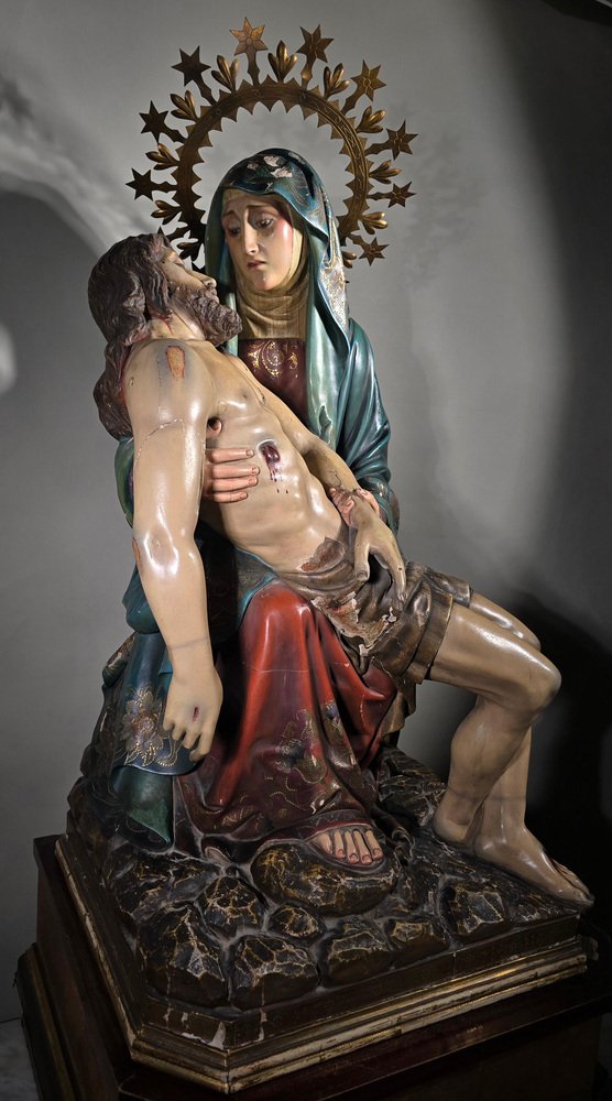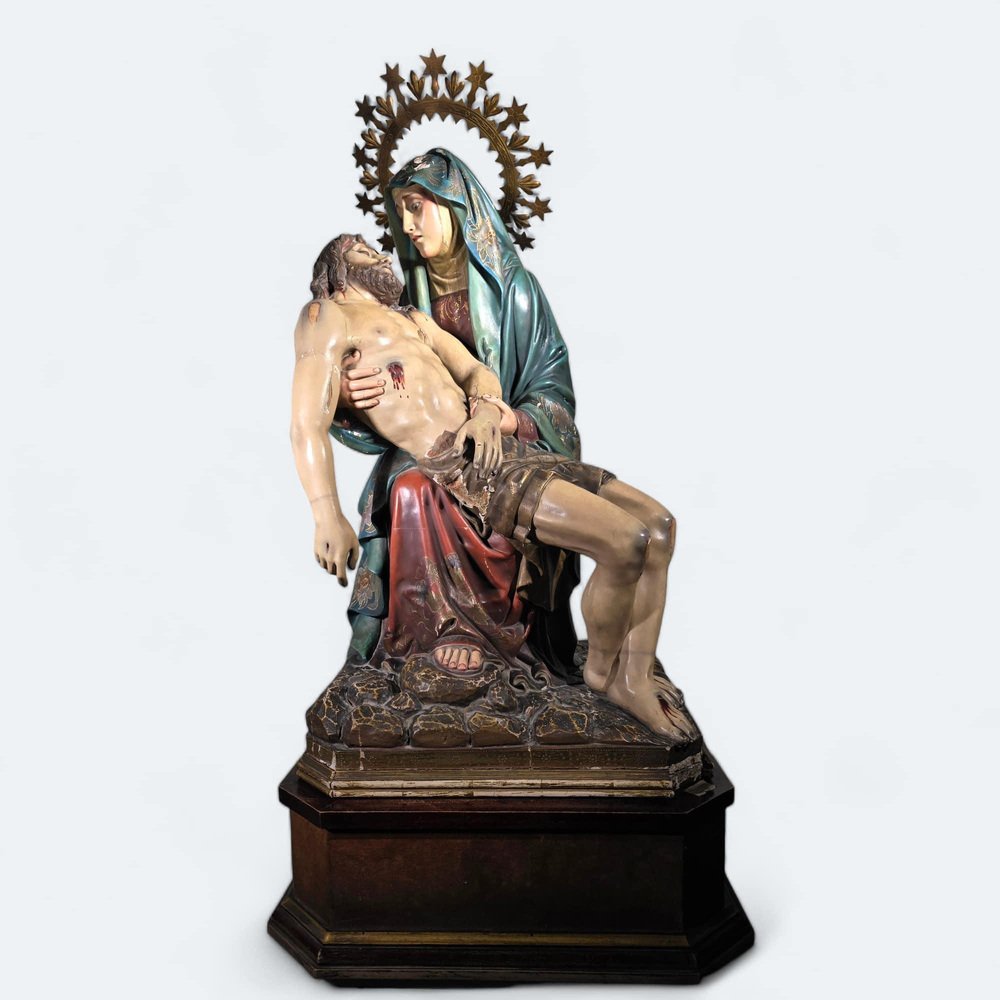 Immerse yourself in the poignant beauty of this significant carved wood and polychrome sculpture depicting the iconic scene of the Pieta. Crafted possibly in Spain during the 19th century, this artwork stands as a striking testament to sacred art and artistic mastery of the era. The sculpture, executed with exceptional quality, captures the delicacy and devotion of the Pieta scene, where the Virgin Mary cradles the body of Jesus Christ after the crucifixion. Despite some minor losses, as shown in the accompanying photos, these do not significantly diminish the value or beauty of the piece. Measuring 108x60x55 cm, including the wooden base, this sculpture possesses an imposing presence that will command attention in any space. The expressiveness of the figures and the meticulous attention to detail attest to the sculptor's talent and deep understanding of the religious theme. Whether as the centerpiece of a sacred art collection or as a standout element in a devotional space, this Pieta sculpture will captivate all who behold it with its emotional power and extraordinary craftsmanship. It is a true jewel of the 19th century deserving of appreciation and admiration by generations to come.