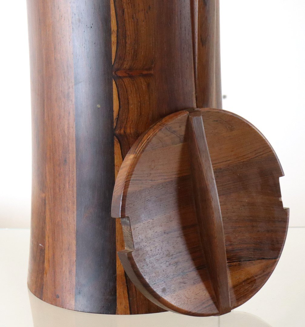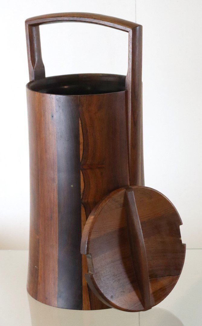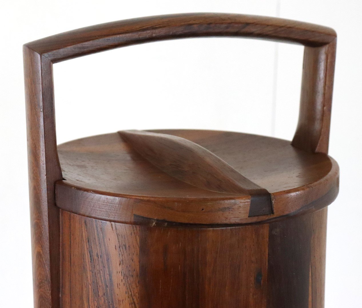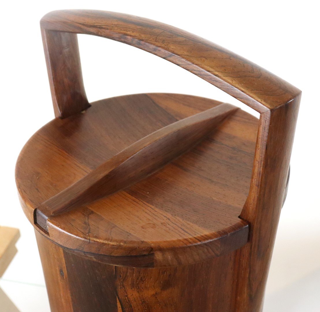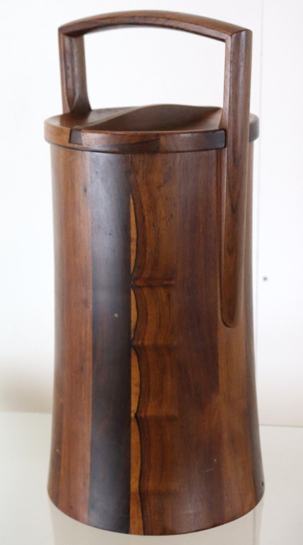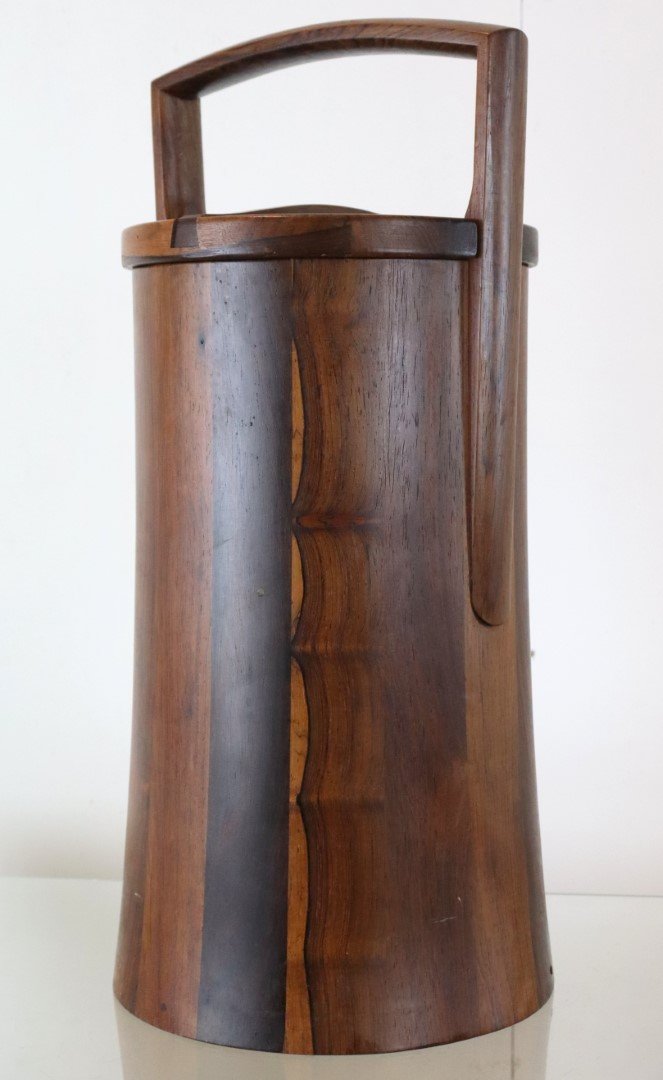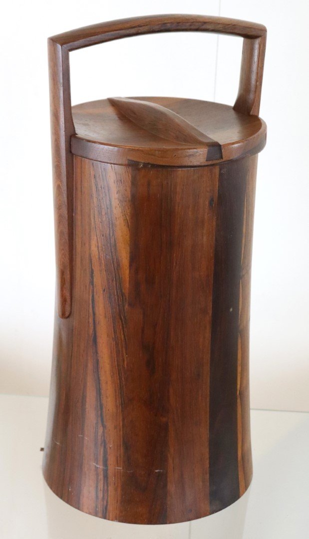 Jens Quistgaard was a Danish designer best known for his contributions to Danish design in the 1950s and 1960s. He was born on April 23, 1919 and died on January 4, 2008. Quistgaard was a versatile designer who was active in various fields, including pottery, cutlery, furniture and kitchenware. One of his best-known designs is this exclusive rosewood "ice bucket" that he created for the Nissen company. This "ice bucket", made of rosewood and stainless steel, was an example of Quistgaard's signature style that combined traditional materials with modern design. His designs were often functional, elegant and timeless, making them classics of Danish design. Quistgaard worked closely with various manufacturers, including Nissen, with whom he had a long-term partnership. His work has had a lasting influence on Scandinavian design and is still appreciated for its craftsmanship and innovative approach. This very exclusive item is a valued design icon and a must have for the true enthusiast. Country of origin: Denmark Manufacturer: Nissen Designer: Jens Quistgaard Height: 46 cm Diameter: 21 cm