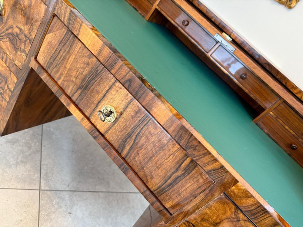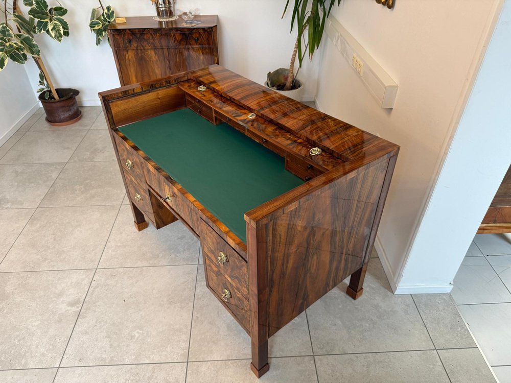 Restored Biedermeier writing desk, chest of drawers - shellac palm polish Dimensions: Height x Width x Depth 95 x 131 x 74 For sale is a rare Biedermeier tambour door secretary, so-called American, circa 1820/30, masterfully crafted in fine walnut veneer with a wonderfully symmetrical veneer pattern. A special feature of this secretary is its sophisticated central function: the side drawers can only be operated by pulling out the middle drawer. In addition, the secretary section is lockable, fully keyed, and the inside has been beautifully refurbished. The interior impresses with its fine layout and careful restoration. The tambour door function works perfectly, and the entire piece has been extensively refurbished/restored with shellac palm polish. The piece is in a fantastic, restored condition - technically and visually in excellent condition. A unique piece of its kind that not only makes collectors' hearts beat faster, but also impresses as a representative piece of writing furniture. Care instructions: • Dust regularly with a soft cotton cloth. • Occasionally care for the shellac surface with high-quality furniture polish. • Do not use microfiber cloths or alcohol-based cleaners. • Avoid direct sunlight and extreme temperature fluctuations to permanently protect the veneer. Sustainability & Increased Value: Antique furniture like this tambour secretary represents sustainable home decor and the preservation of the highest quality craftsmanship. Due to its rarity and perfect restoration, this piece offers an excellent opportunity for appreciation.