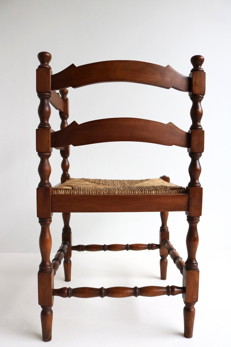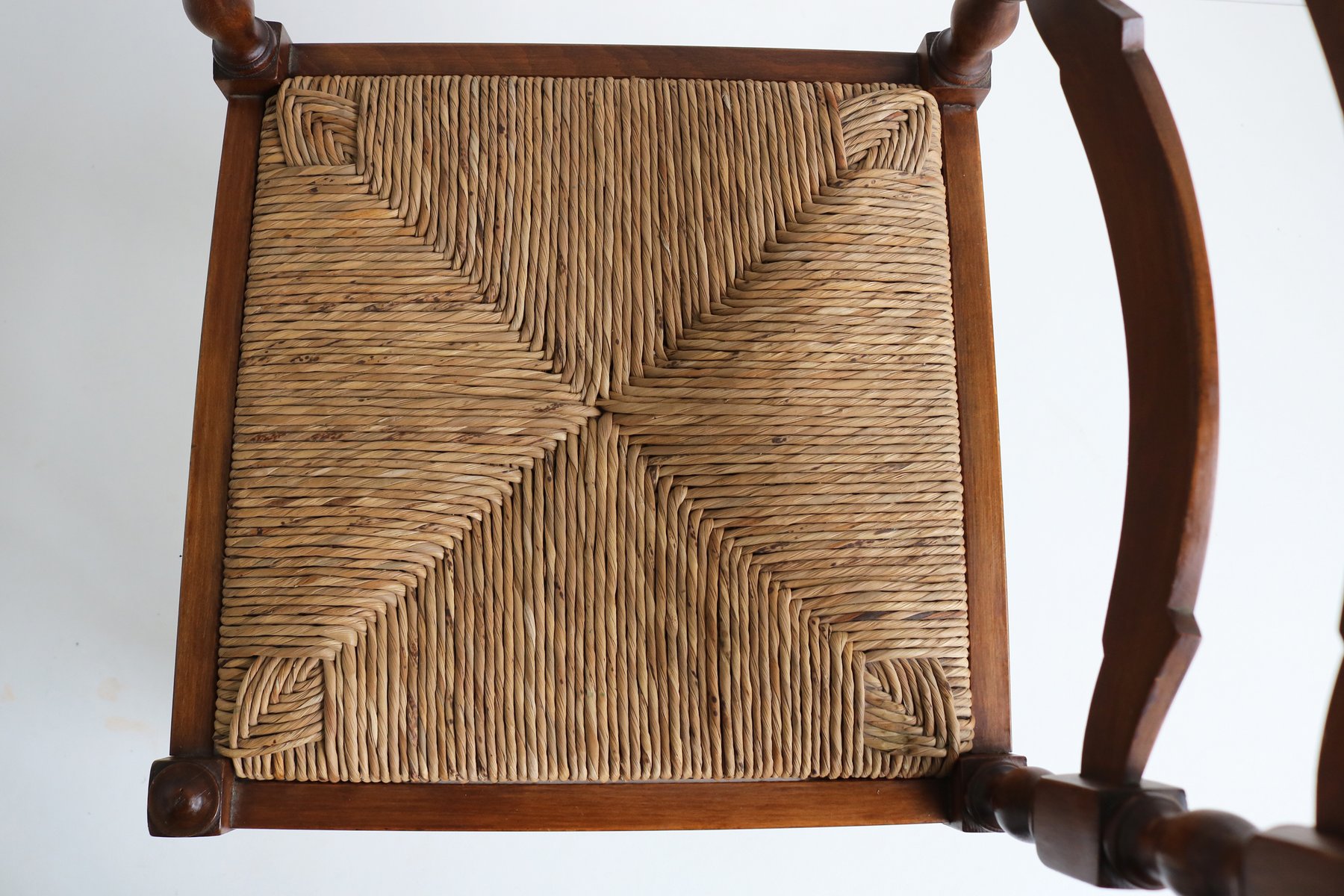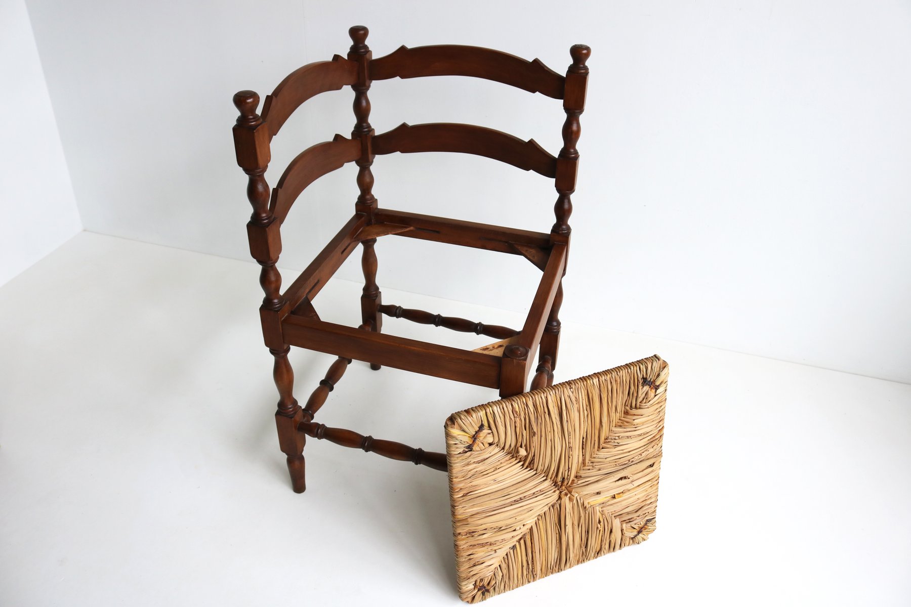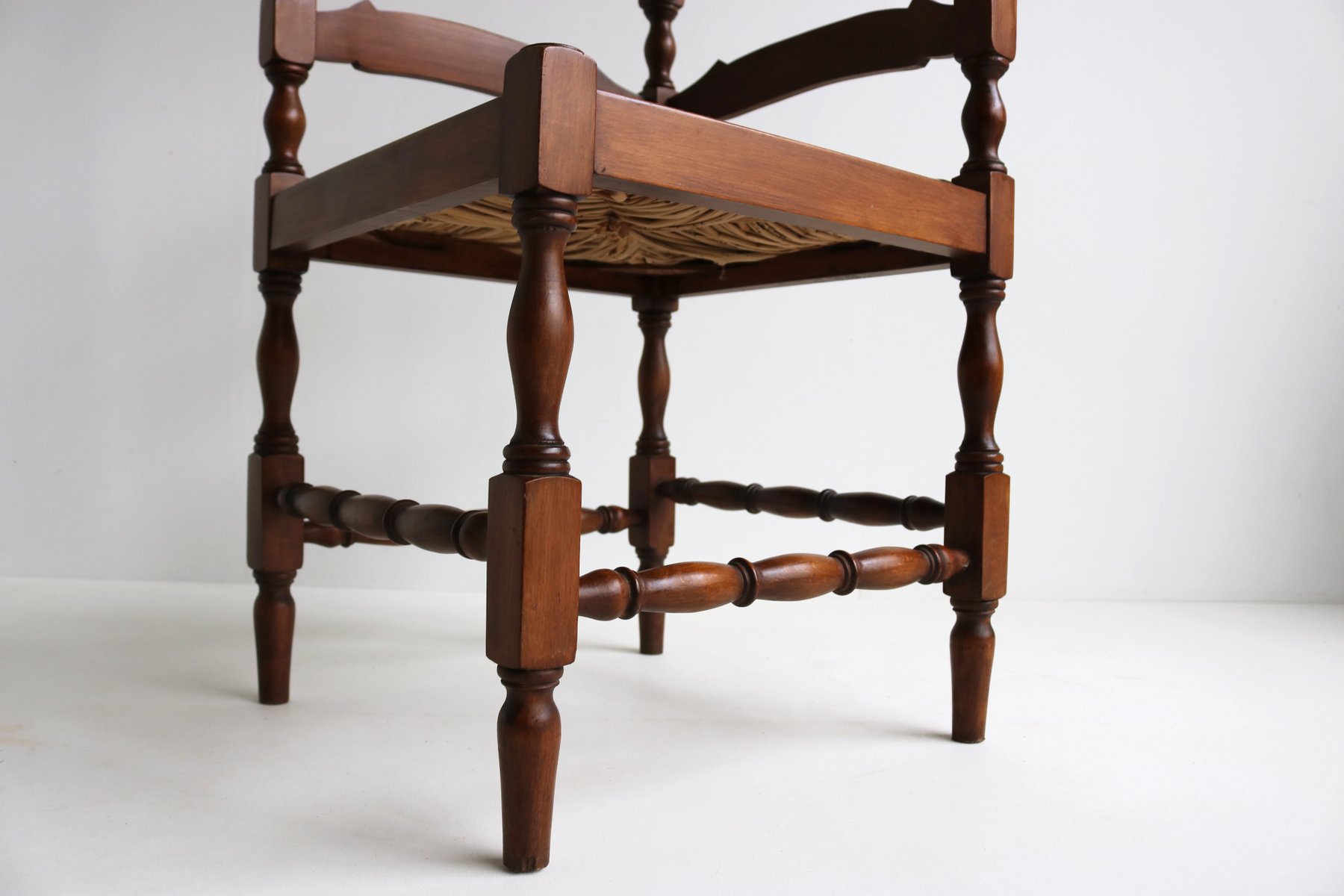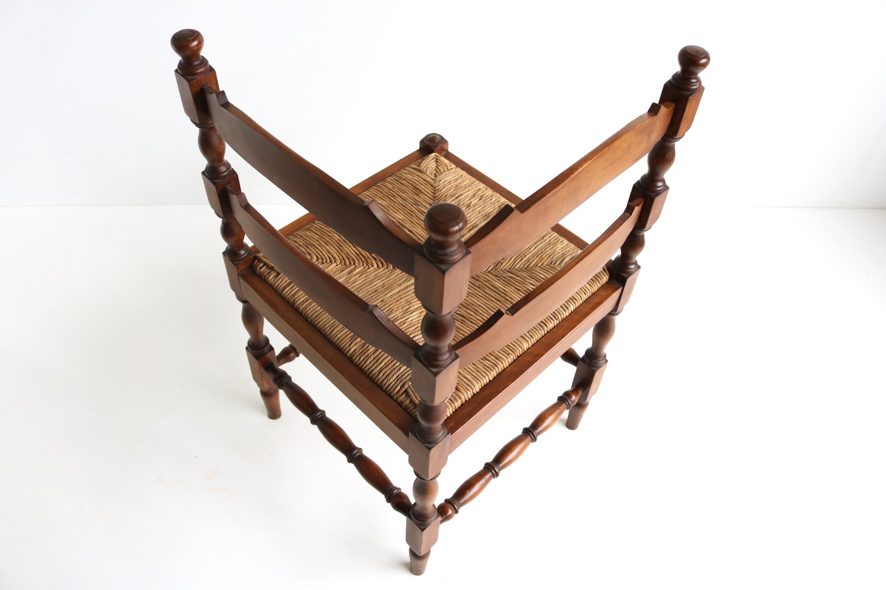 Sedia ad angolo antica in legno tornito con sedile in giunco intrecciato, anni '30
