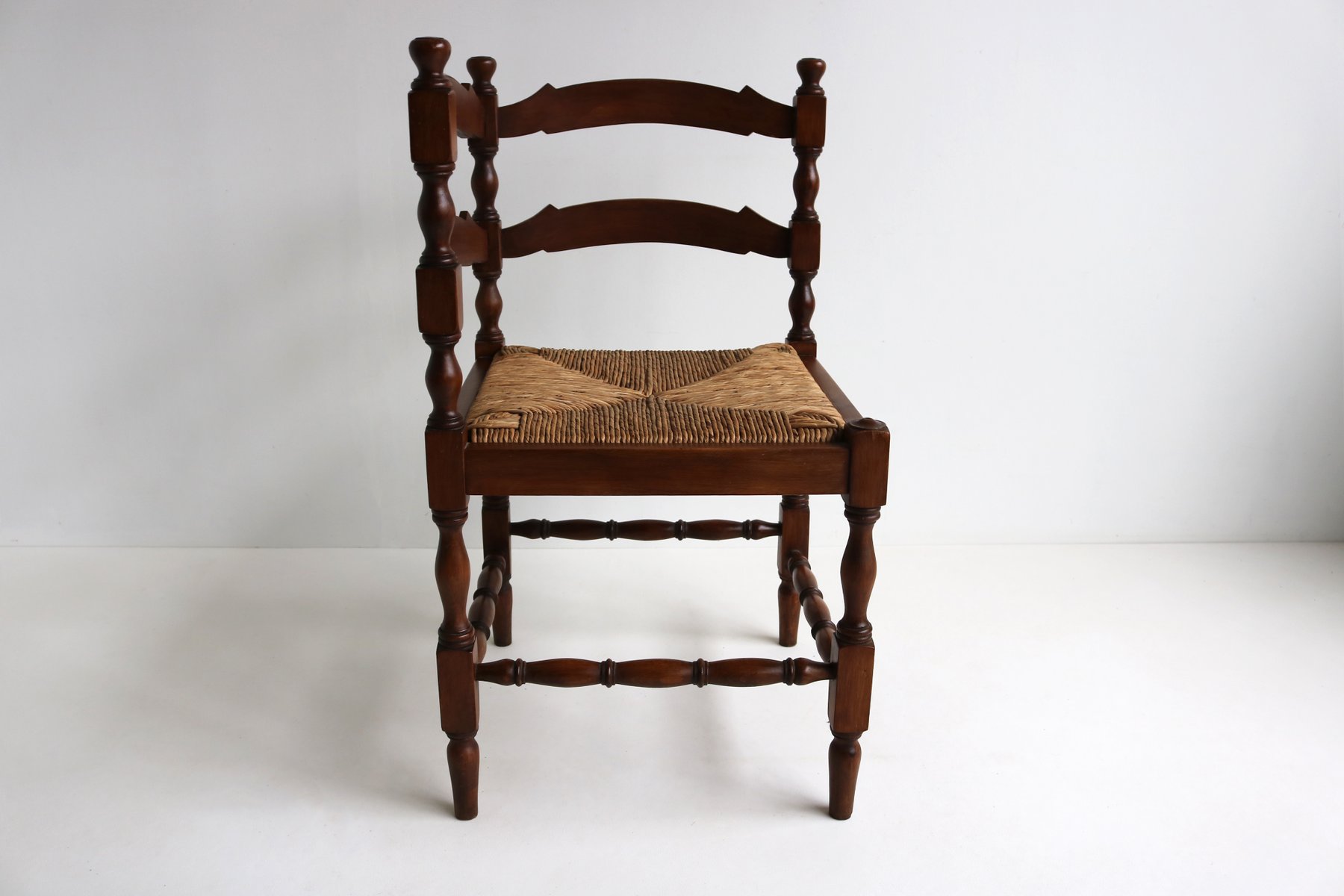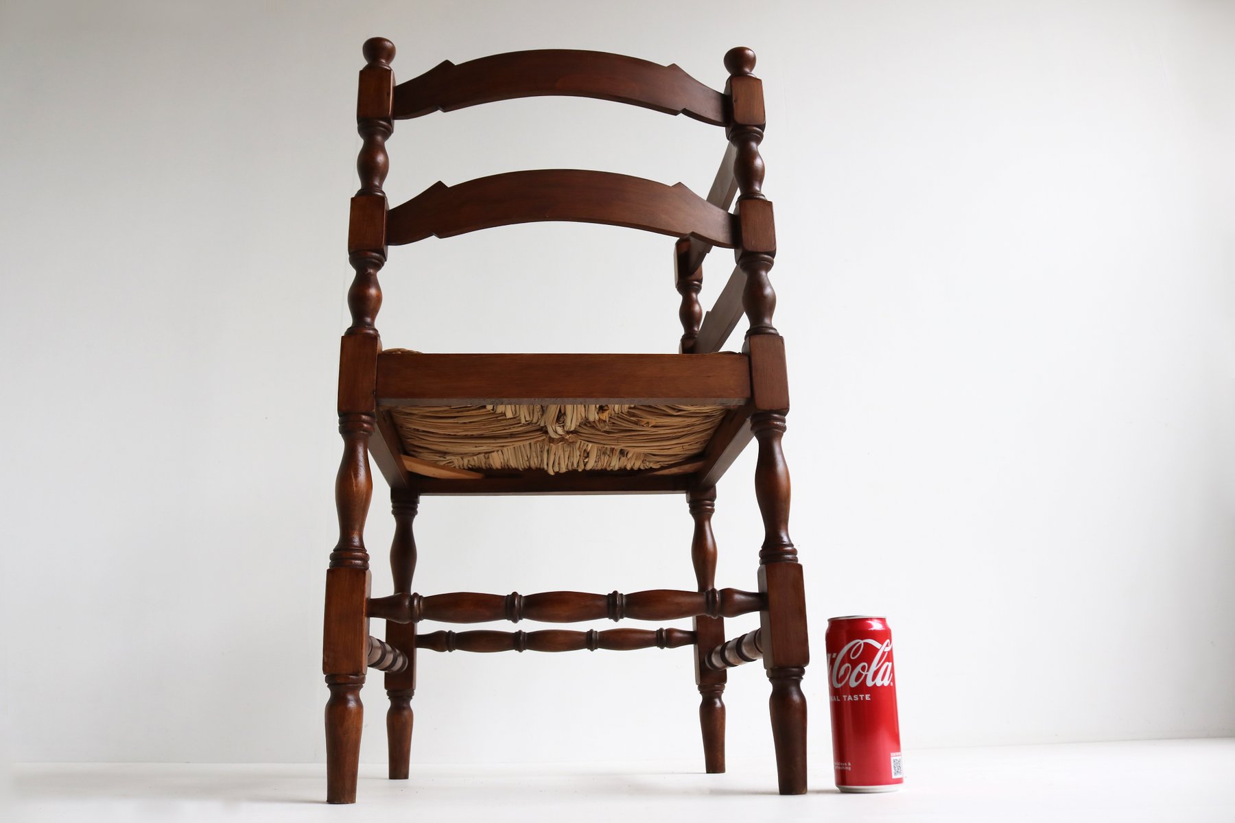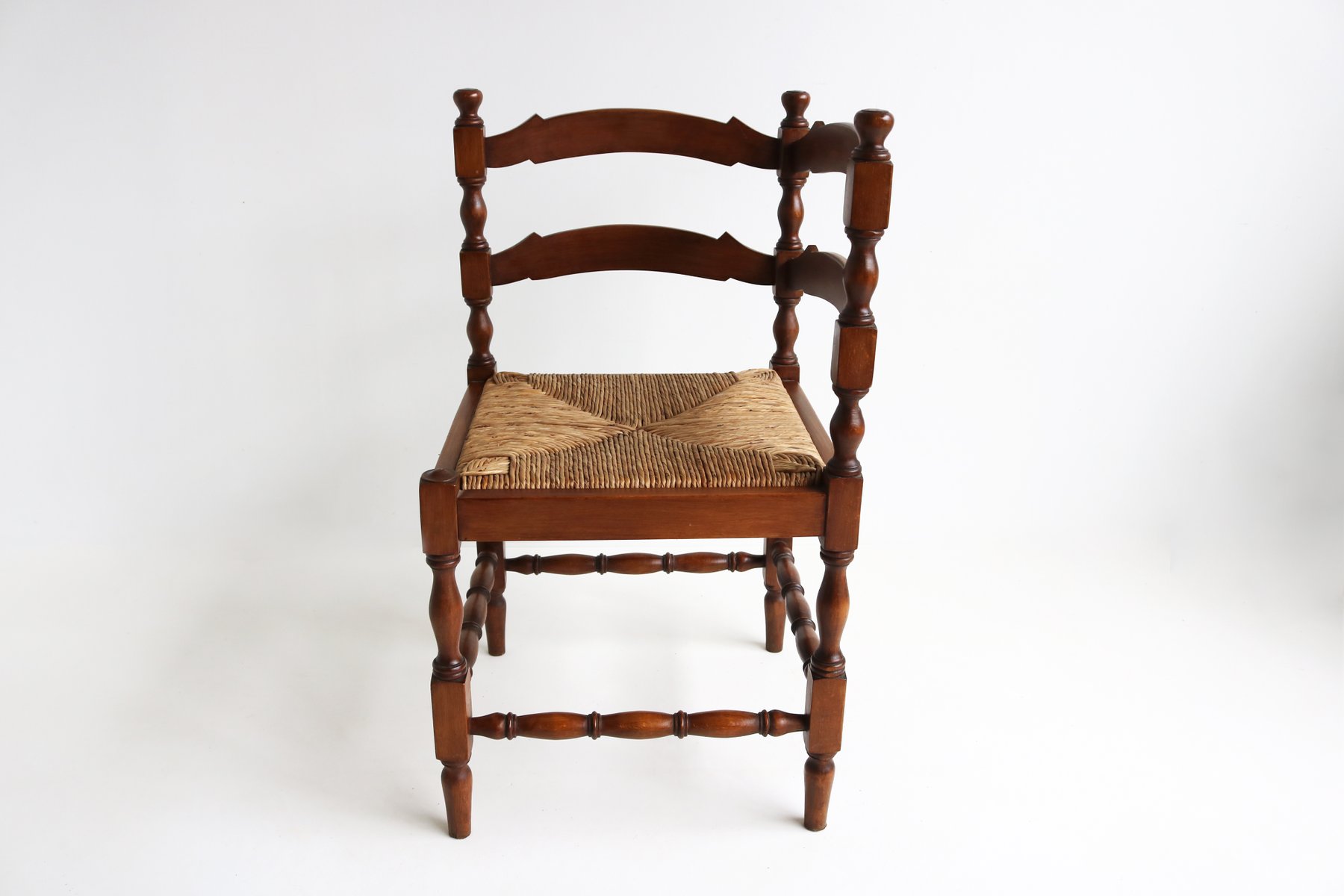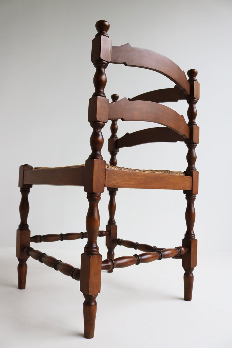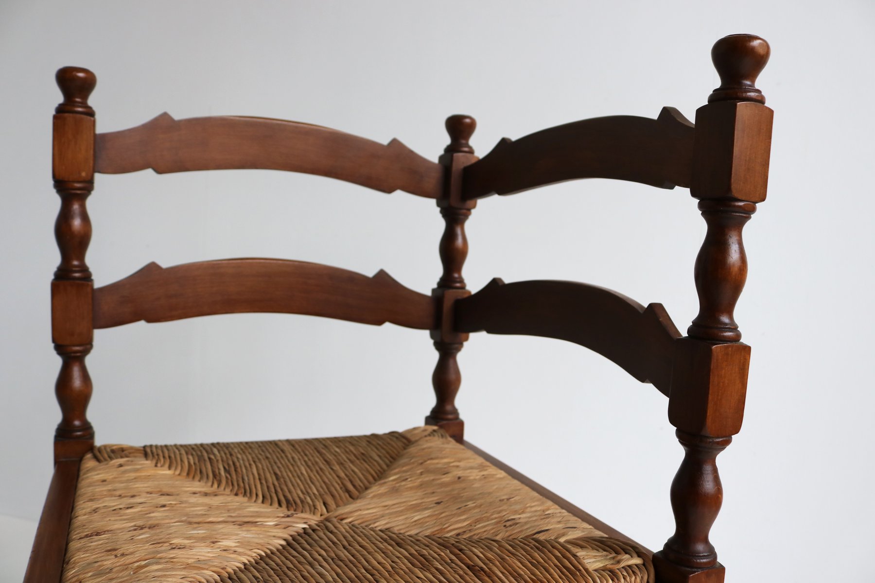 Sedia ad angolo antica in legno tornito con sedile in giunco intrecciato, anni '30