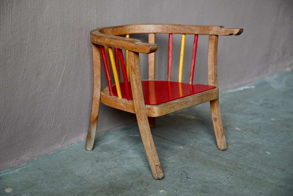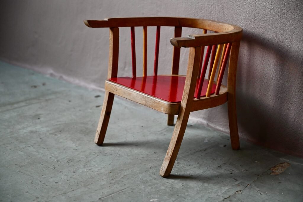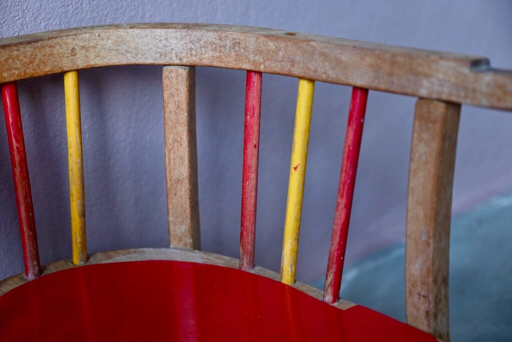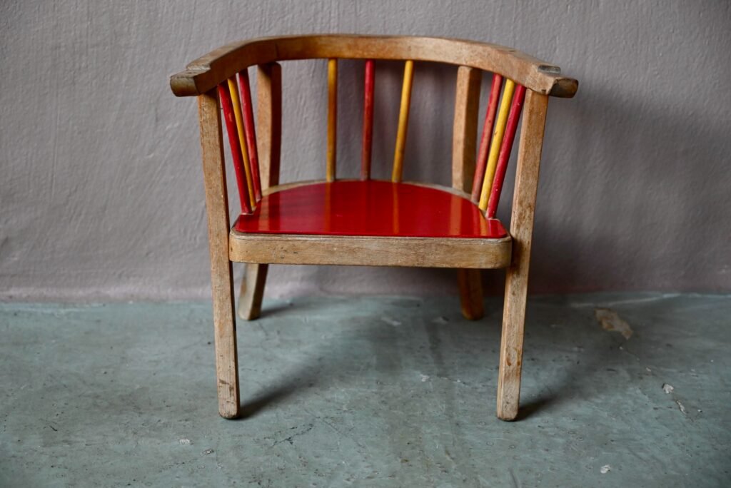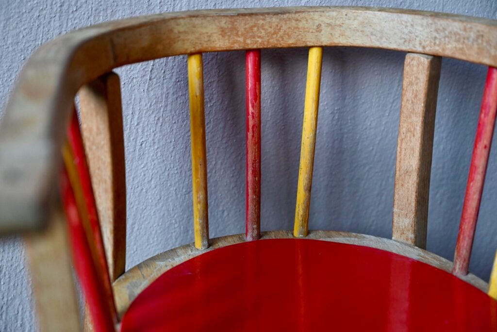 Is it necessary to present it? Here is the famous Baumann toilet chair: a superb vintage piece dating from the 1940s. Entirely in weathered varnished wood, the colored bars and the bright red seat make the whole thing even more charming and sparkling.