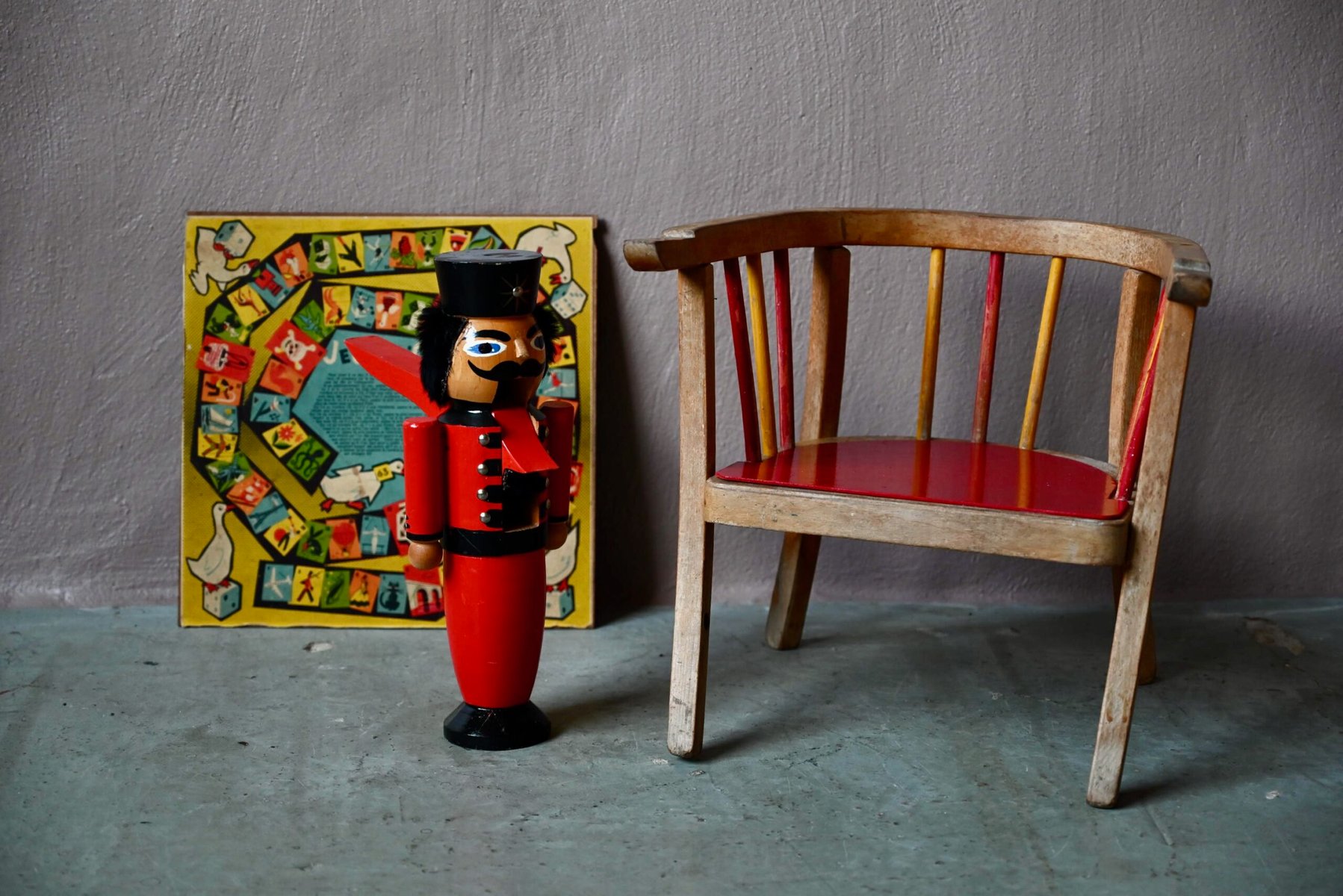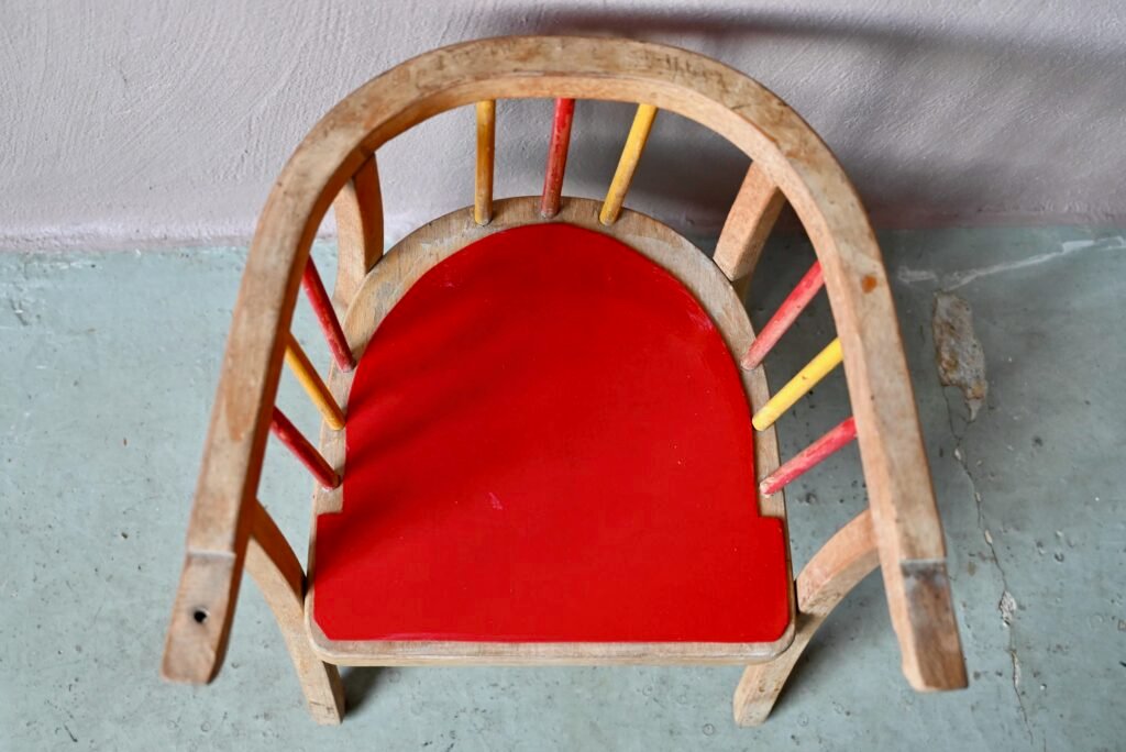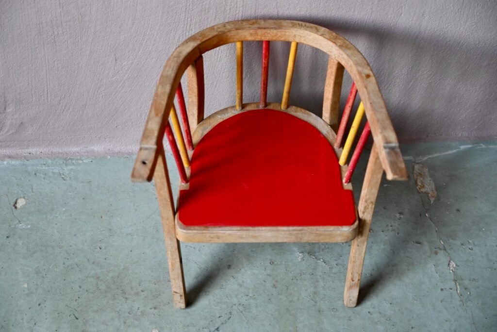 Even if the pot and the shelf are missing, the little chair retains all its retro charm and functionality, and will quickly find its place in a child's bedroom. A very pretty vintage piece, for ages 15 months and up. The base plate has been renovated in lacquered red.