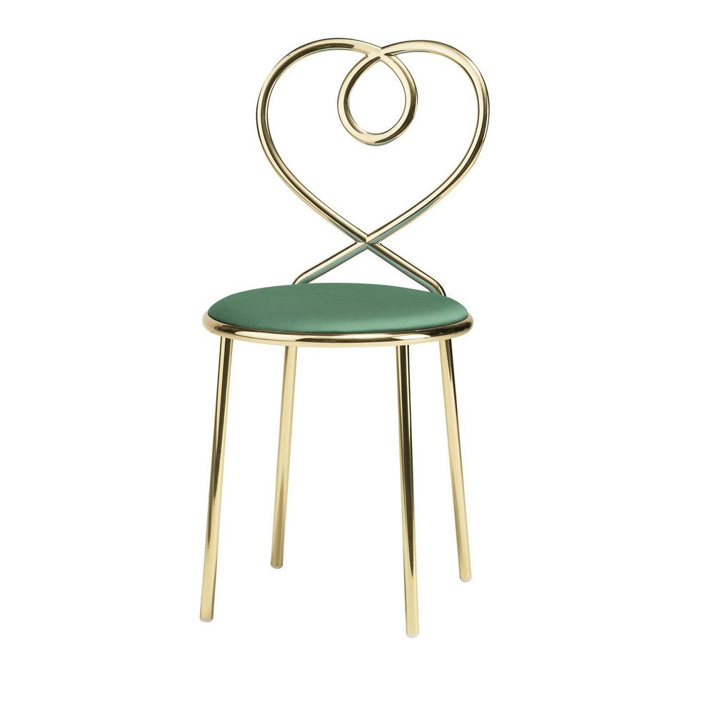 This lovely chair is part of the Love collection introduced at Milan Design Week 2018, distinguished for its elegant curves and the distinctive heart shape of the backrest. The brass structure is simple and light and will enliven a living room, entryway or kid's room. If combined with the other pieces of the same series, it can add a colorful accent to a dining room, thanks to the different cushion covers. In this case, the round cushion is upholstered with a vivid malachite-green fabric that is cheerful and charming.