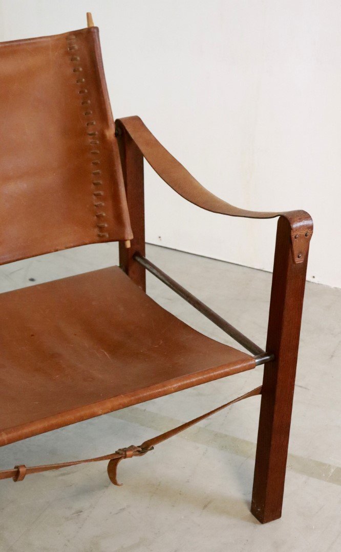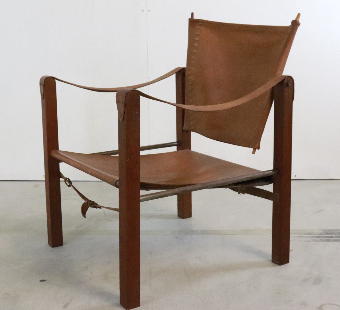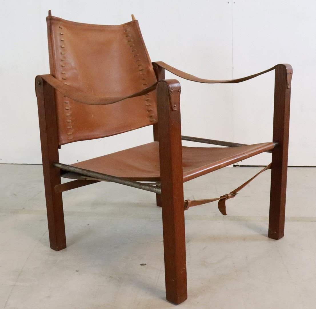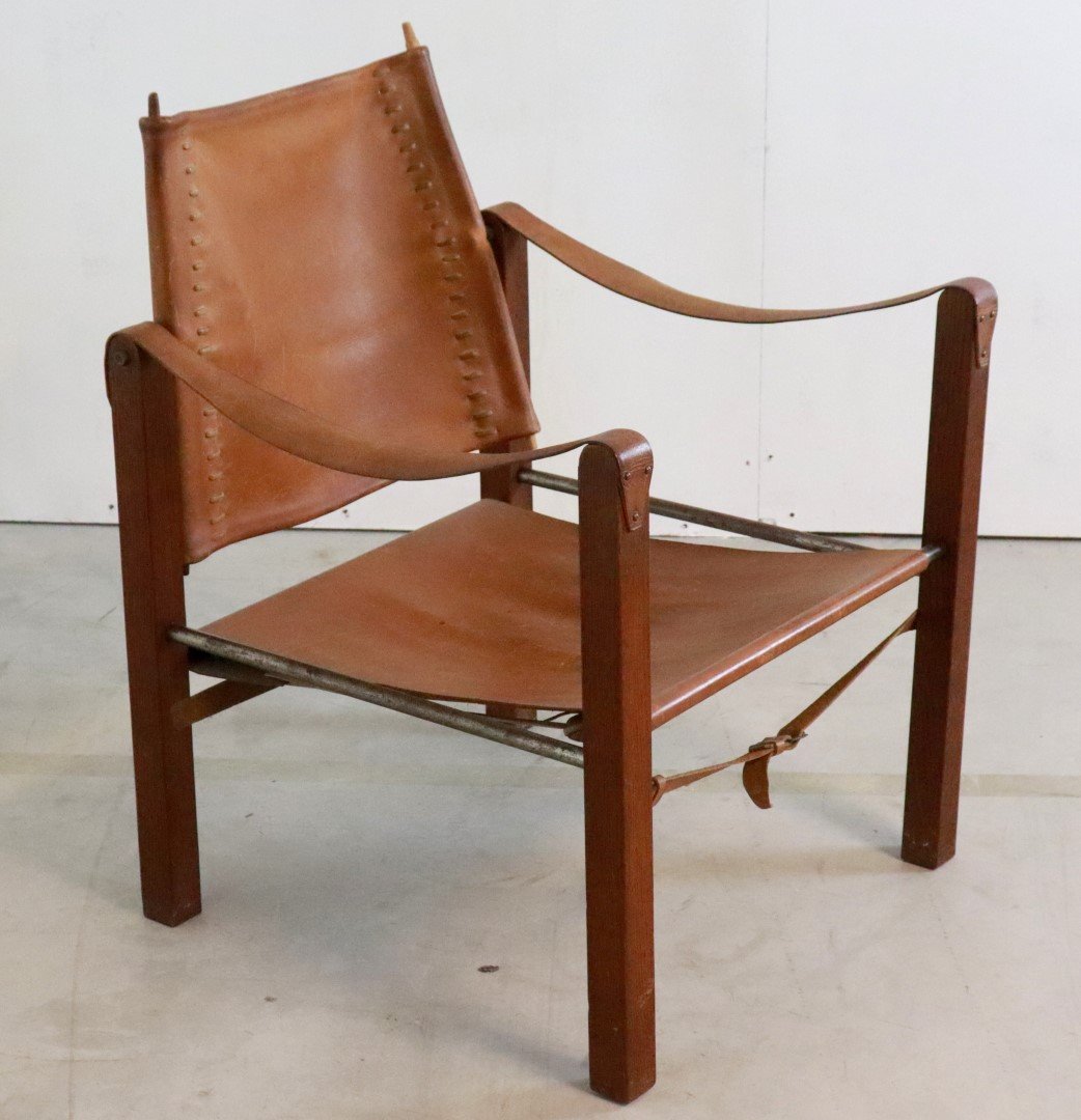 Original, so -called Safari Chair from the early 1960s. Coming from the first owners from Bennekom, who selected a modern interior for their new bungalow in the early 1960s. This so -called Safari Chair was accompanied in their interior by other designer furniture from the Propos series by top manufacturer Hulmefa. Very special is that this Safari Chair is equipped with square and right -to -tissue legs, in combination with metal tubes and a very sturdy "lace" through the brown leather. Through these details, this copy knows how to distinguish itself from all the other global offer. Another striking detail; The vertical bars that are incorporated in the backrest are very refined in shape and have a dot at the end. The whole is very rare in this appearance, exactly the same as this copy is not a second one in the world. In an original condition, with a beautiful patina, and a unique character, a true lovers object! Height: 74.5 cm Seat height: 32 cm Width: 57 cm Seat width: 46 cm Depth: 60 cm Seaty: 51 cm