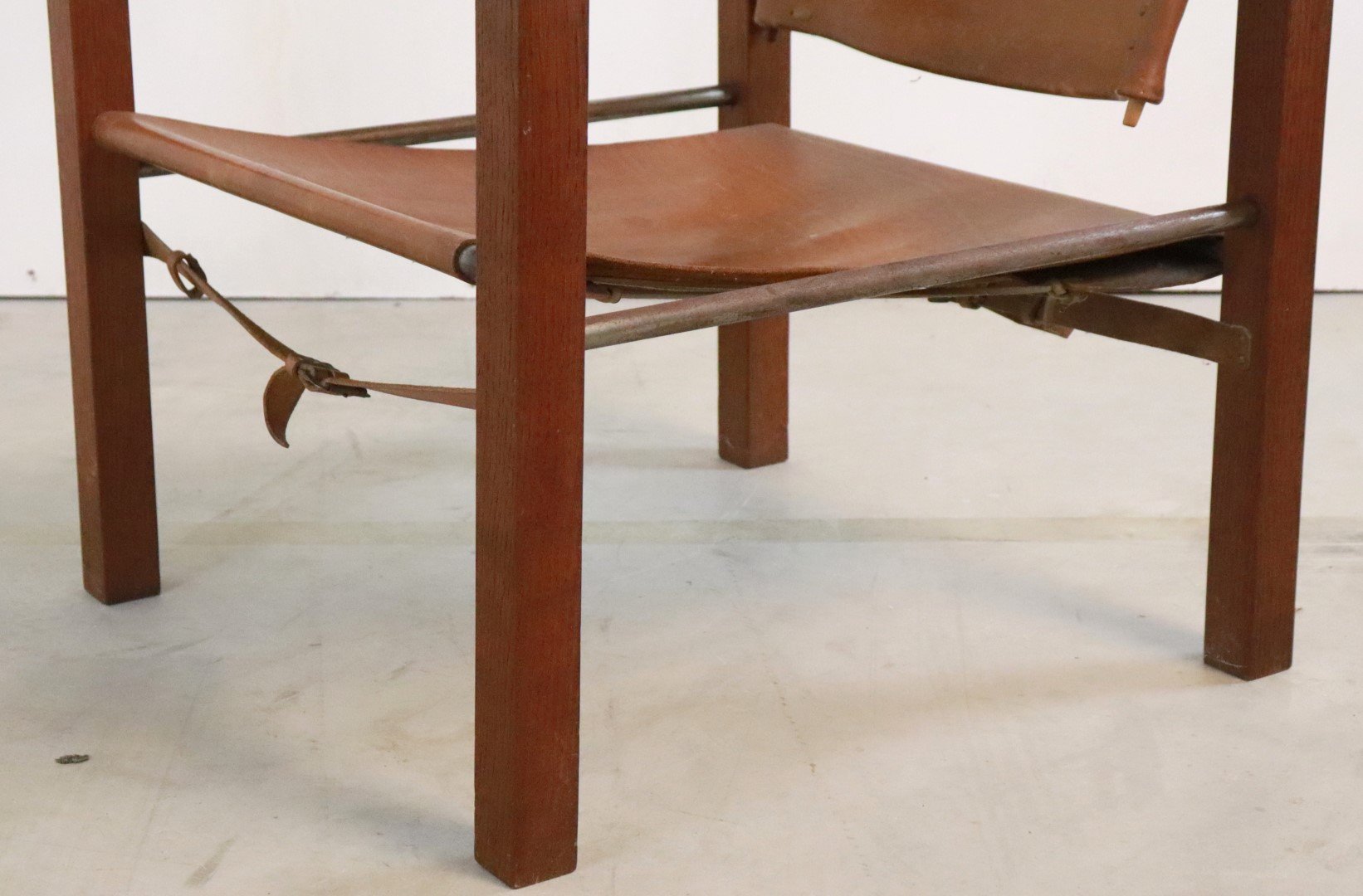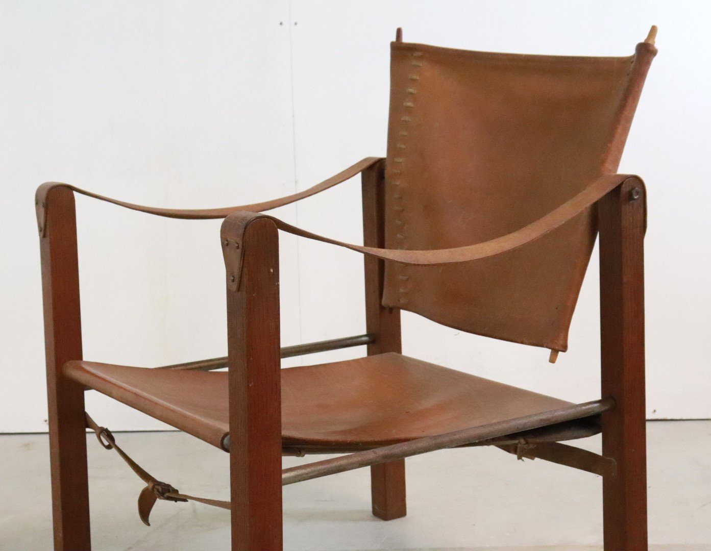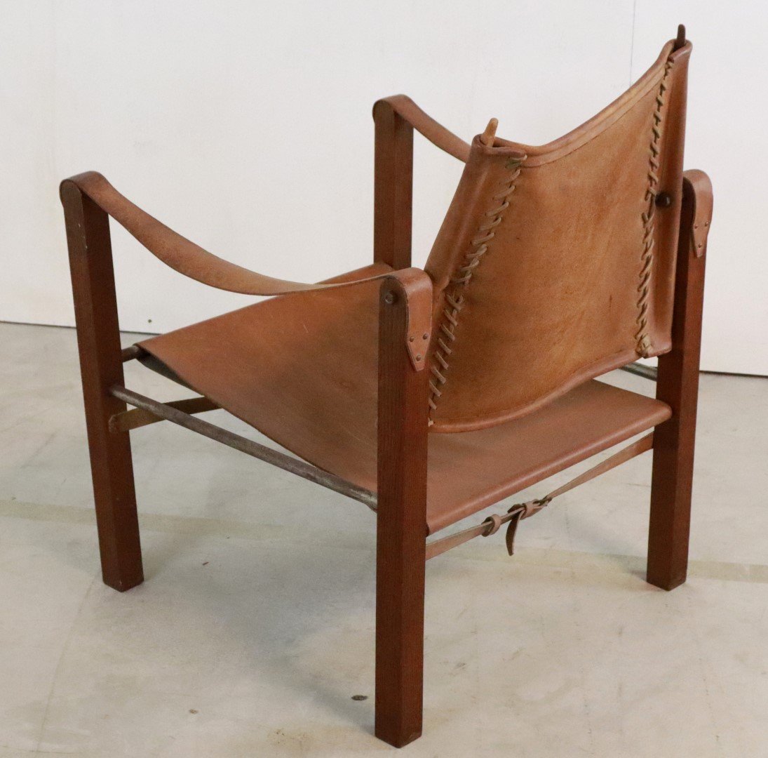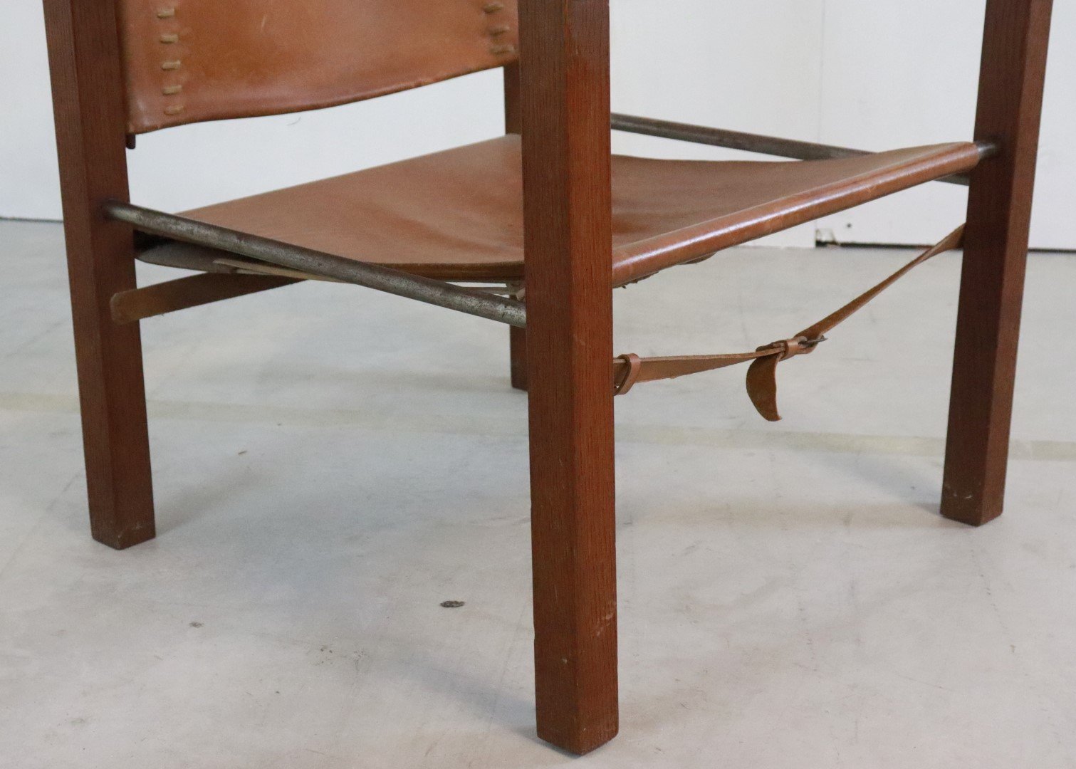 Original, so -called Safari Chair from the early 1960s. Coming from the first owners from Bennekom, who selected a modern interior for their new bungalow in the early 1960s. This so -called Safari Chair was accompanied in their interior by other designer furniture from the Propos series by top manufacturer Hulmefa. Very special is that this Safari Chair is equipped with square and right -to -tissue legs, in combination with metal tubes and a very sturdy "lace" through the brown leather. Through these details, this copy knows how to distinguish itself from all the other global offer. Another striking detail; The vertical bars that are incorporated in the backrest are very refined in shape and have a dot at the end. The whole is very rare in this appearance, exactly the same as this copy is not a second one in the world. In an original condition, with a beautiful patina, and a unique character, a true lovers object! Height: 74.5 cm Seat height: 32 cm Width: 57 cm Seat width: 46 cm Depth: 60 cm Seaty: 51 cm