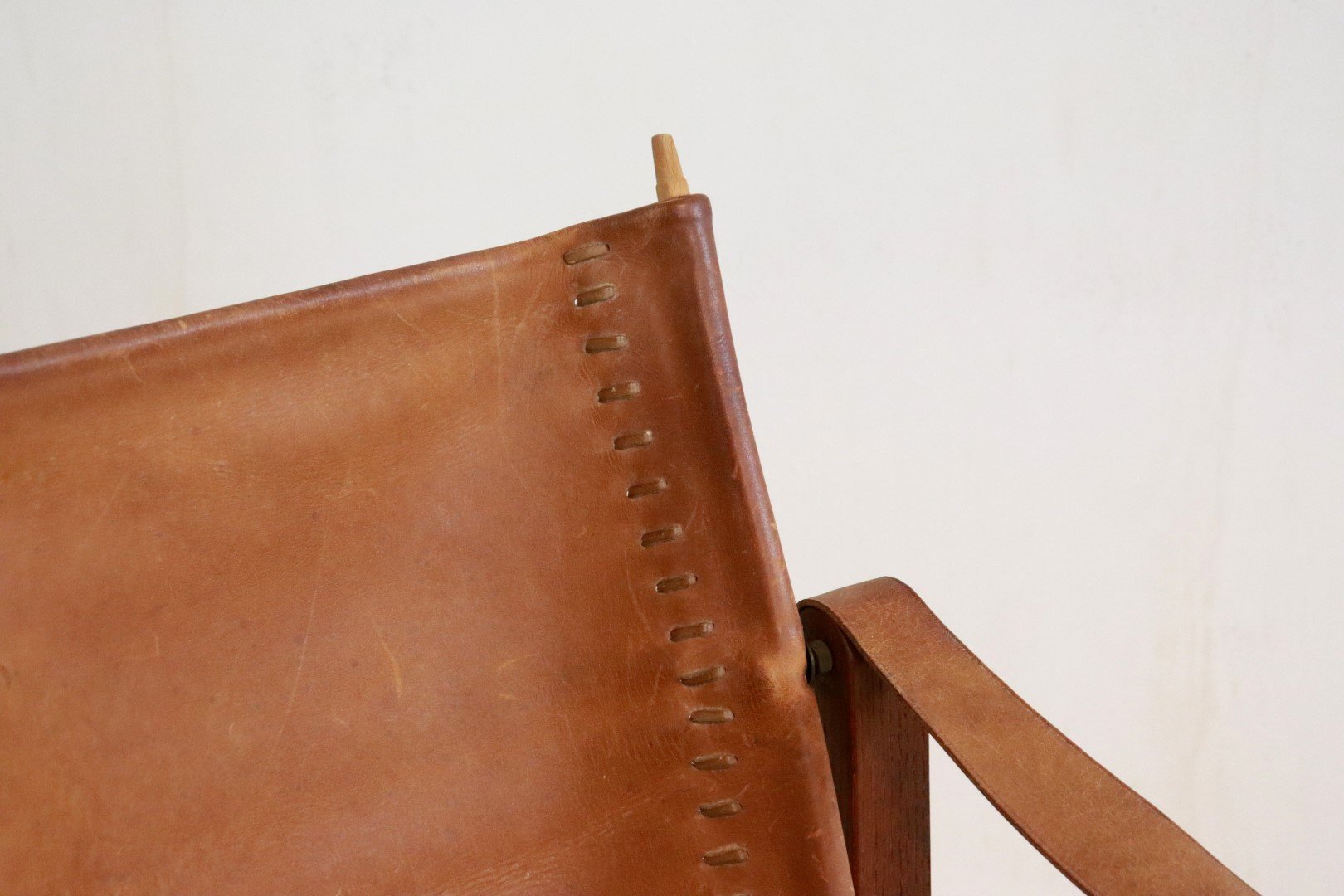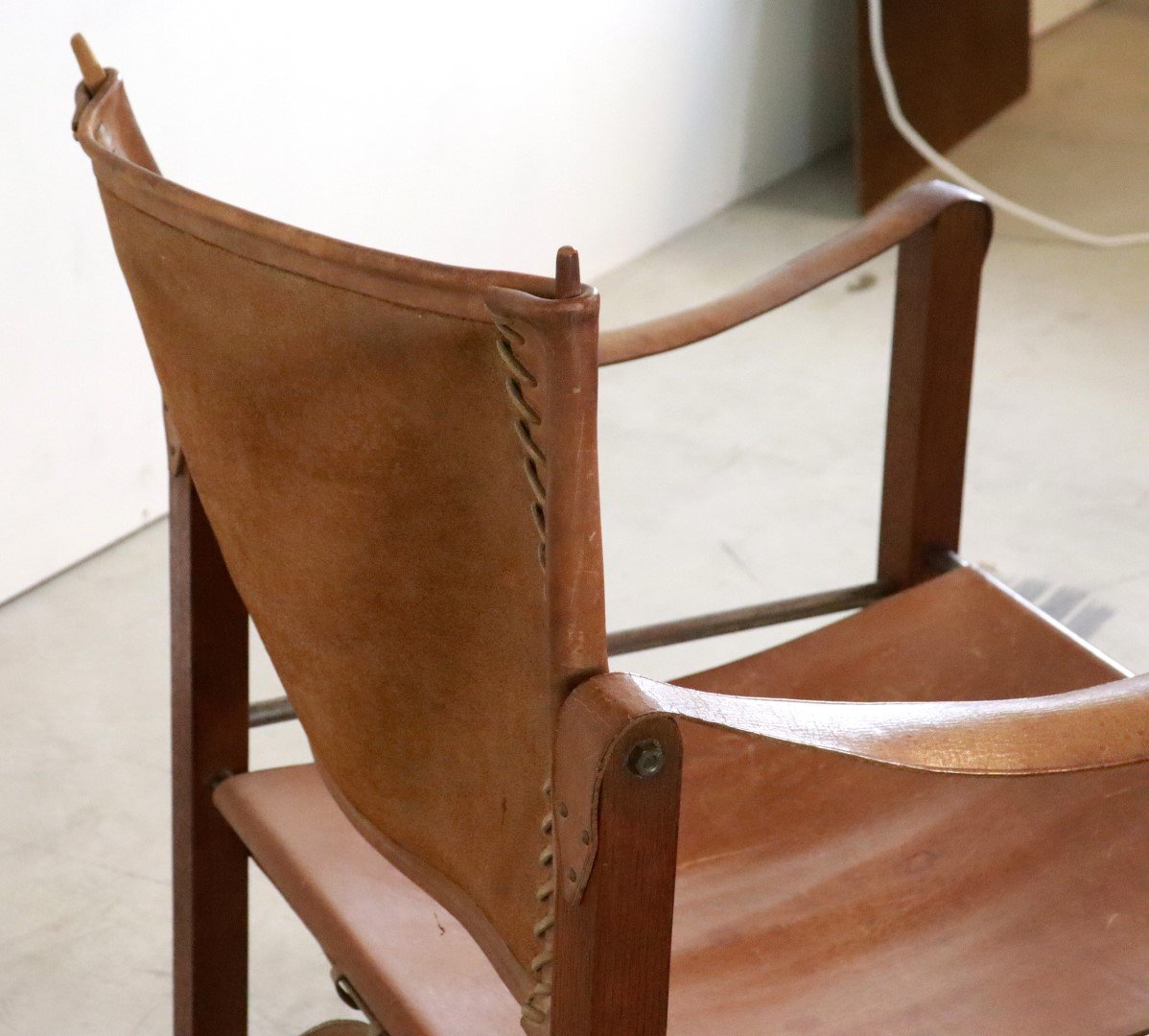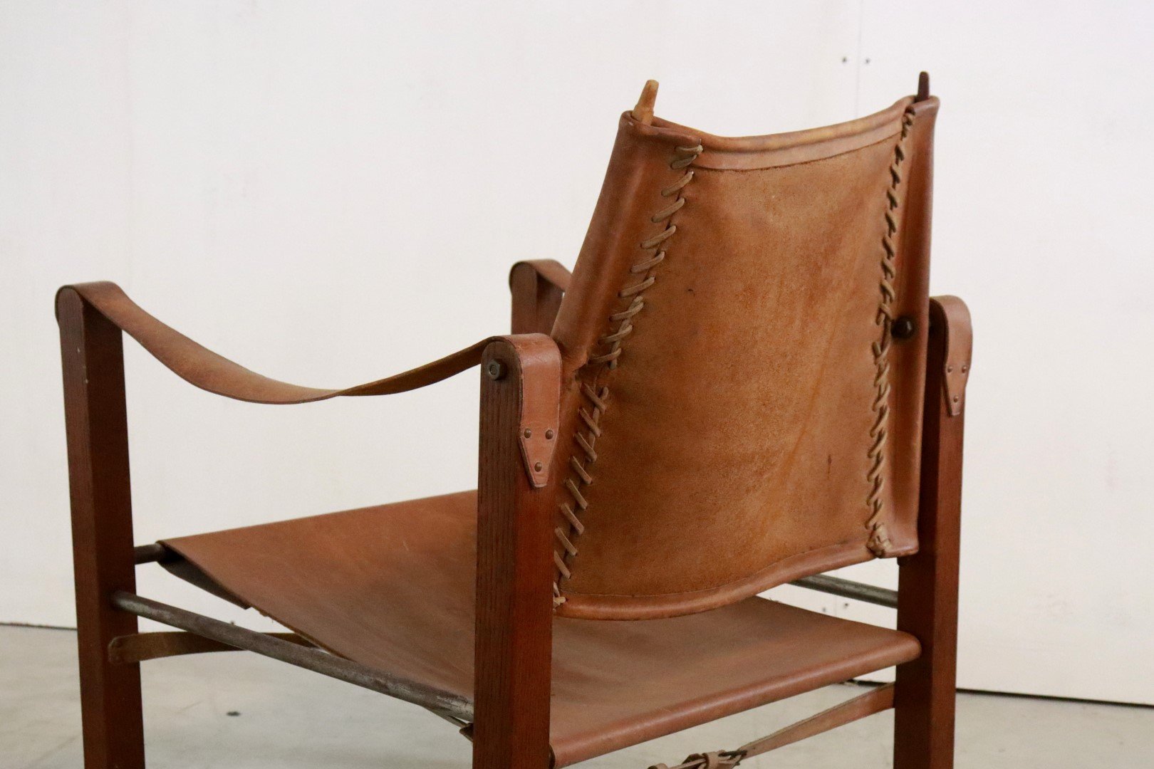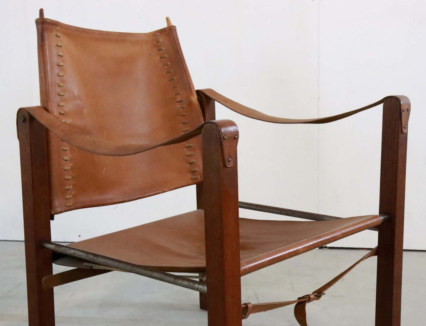 Original, so -called Safari Chair from the early 1960s. Coming from the first owners from Bennekom, who selected a modern interior for their new bungalow in the early 1960s. This so -called Safari Chair was accompanied in their interior by other designer furniture from the Propos series by top manufacturer Hulmefa. Very special is that this Safari Chair is equipped with square and right -to -tissue legs, in combination with metal tubes and a very sturdy "lace" through the brown leather. Through these details, this copy knows how to distinguish itself from all the other global offer. Another striking detail; The vertical bars that are incorporated in the backrest are very refined in shape and have a dot at the end. The whole is very rare in this appearance, exactly the same as this copy is not a second one in the world. In an original condition, with a beautiful patina, and a unique character, a true lovers object! Height: 74.5 cm Seat height: 32 cm Width: 57 cm Seat width: 46 cm Depth: 60 cm Seaty: 51 cm