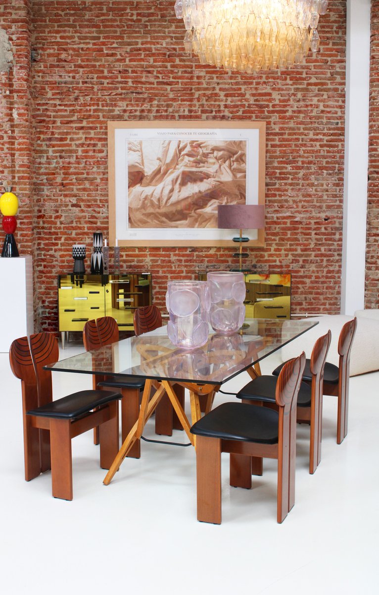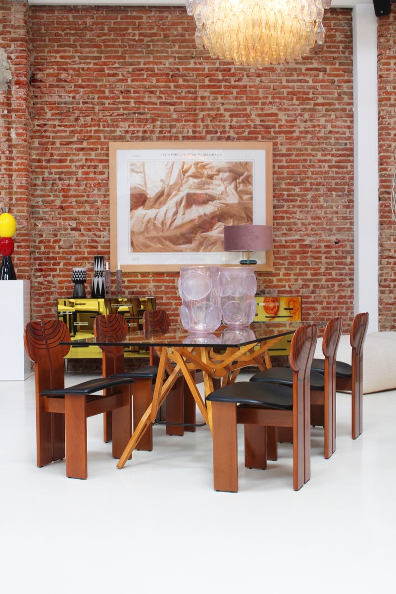 Set di sei sedie modello "Africa" disegnate da Afra & Tobia Scarpa, della serie "Artona" prodotta da Maxalto. Realizzate in noce con intarsi ebanizzati, rivestimento in pelle nera e dettagli in ottone. Italia anni '70.