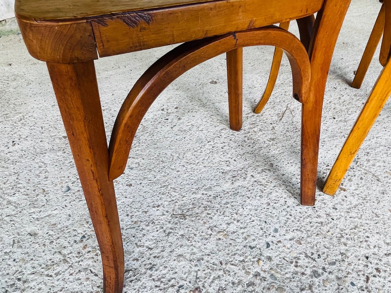 Le sedie sono complessivamente in buone condizioni, originali e d'epoca, con alcuni leggeri segni, segni dell'età e dell'uso precedente commisurati al tempo, come ci si può aspettare per le sedie da bistrot di questa età, sulle strutture complessive, sulle sedute e sulle gambe, così come una patina dell'età e del tempo, con alcune aree di colore leggermente sbiadito (vedi foto). Piccoli segni d'uso sul lato destro del bordo della seduta della sedia sinistra (vedi foto), e un segno leggero e sottile sul legno curvo dello stesso lato, della stessa sedia (vedi foto)