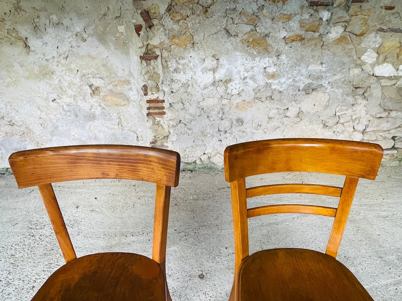 Both chairs are structurally identical. The only difference, is that chair N° 54 (on the left), has no slats on the backrest, and the maximum width of the upper backrest measures at 40 cm, versus 38 cm for the other chair, N° 89 (on the right.) Everything else, from height of the chairs, width and height of the seats, and depth of the chairs, is the same.