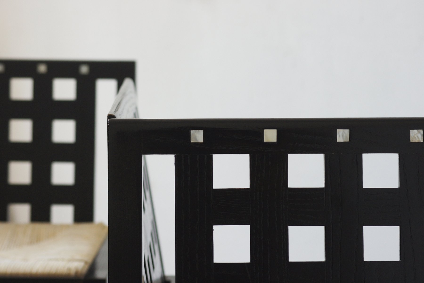The distinctive geometric backrest with vertical and horizontal elements creates a harmonious, rhythmic structure, typical of Mackintosh aesthetics and the Arts and Crafts movement.