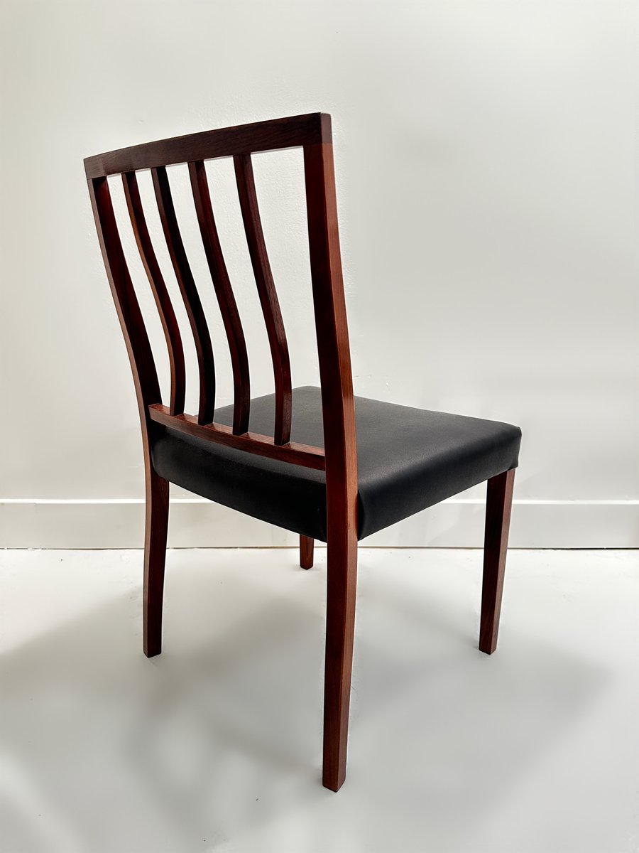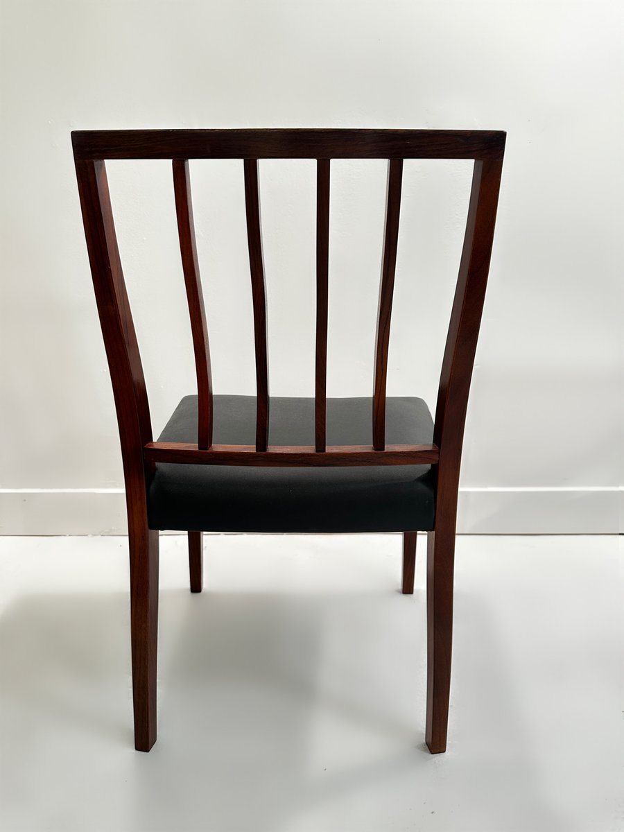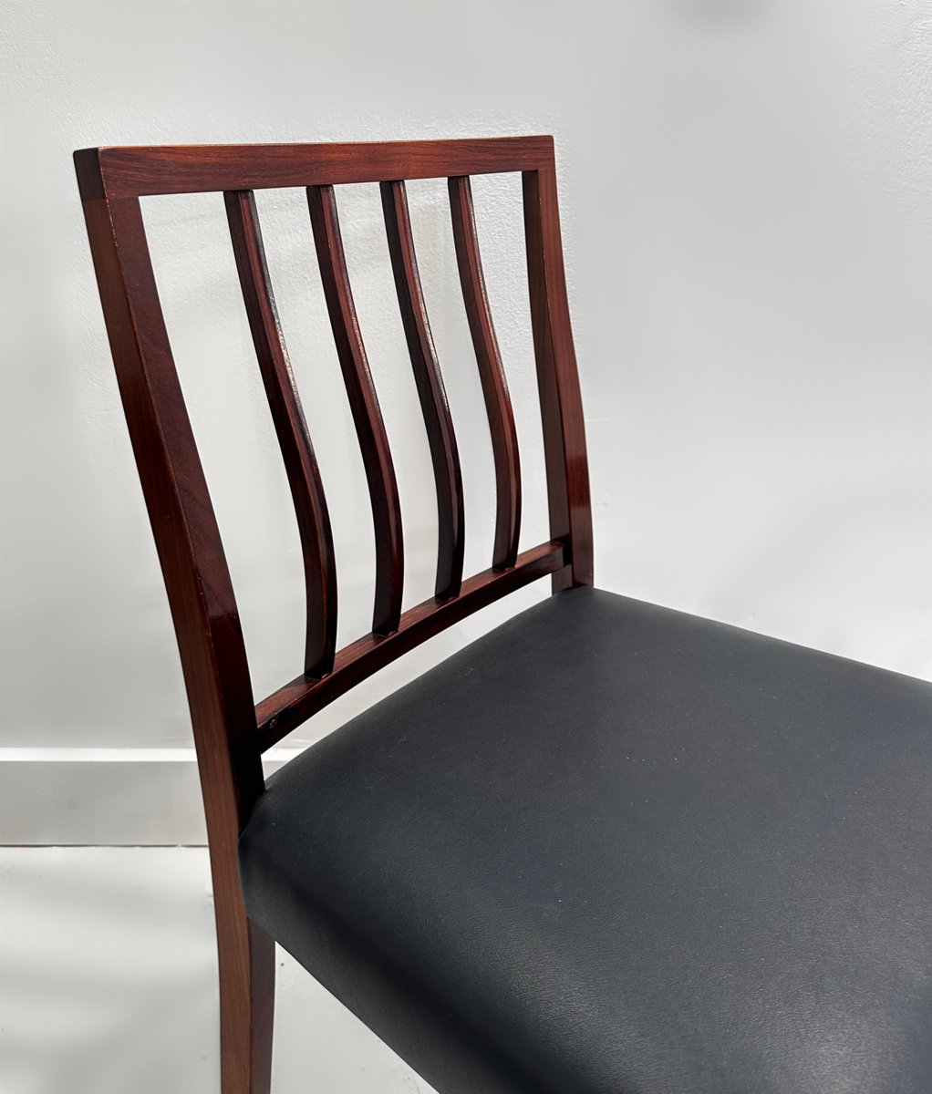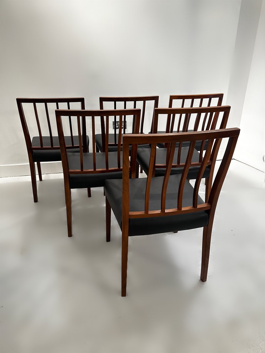 Un meraviglioso e raro set di 6 sedie da pranzo in palissandro massiccio disegnate da Robert Heritage per Archie Shine nel 1970 circa. Il set è composto da 6 sedie da pranzo standard e viene offerto al mercato completamente rifinito con olio danese e le sedute sono state interamente ritessute e poi rivestite con la pelle vinilica originale, di qualità così elevata da essere quasi immacolata.