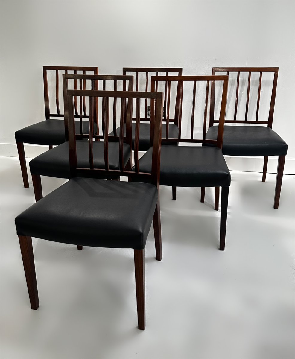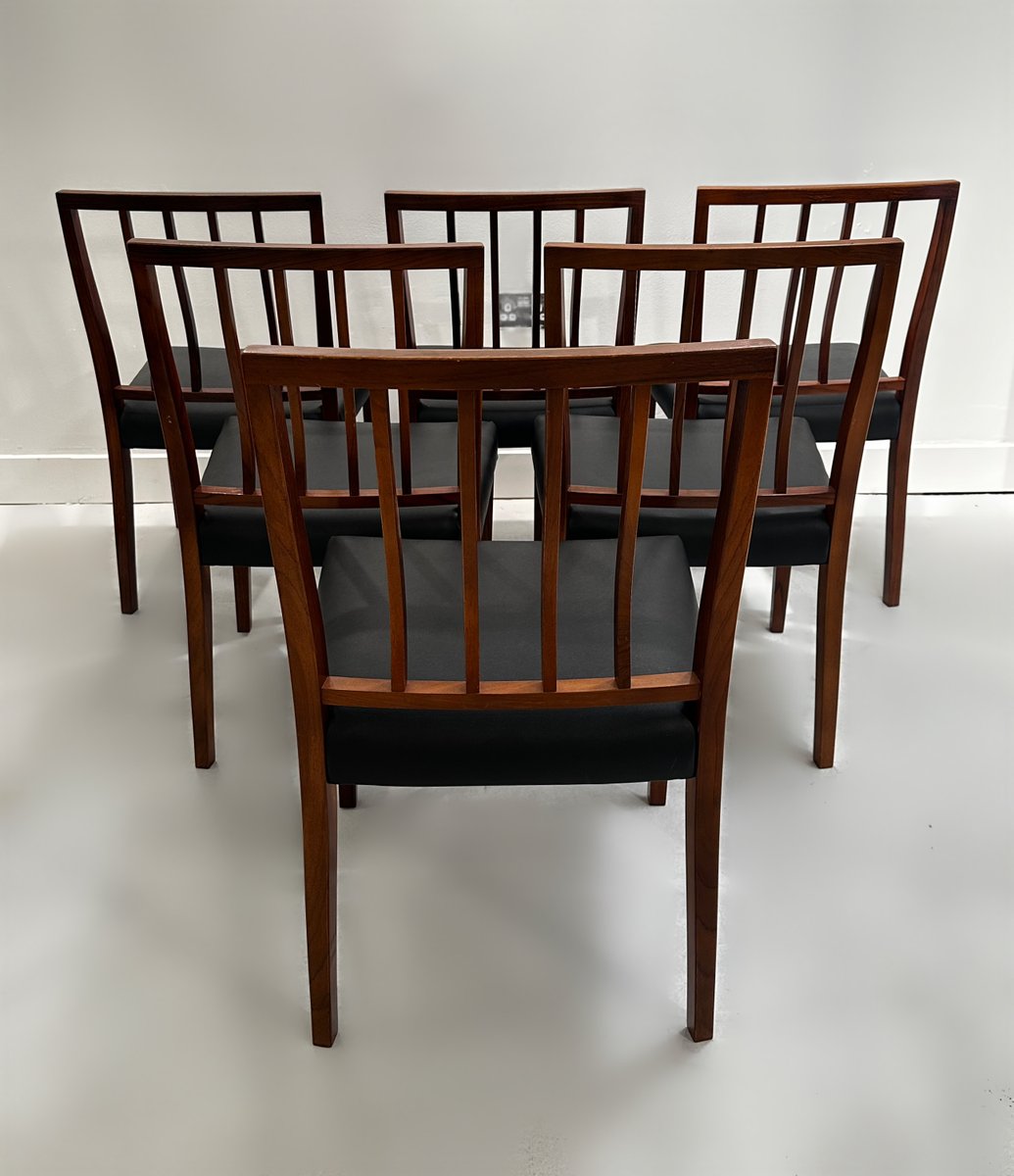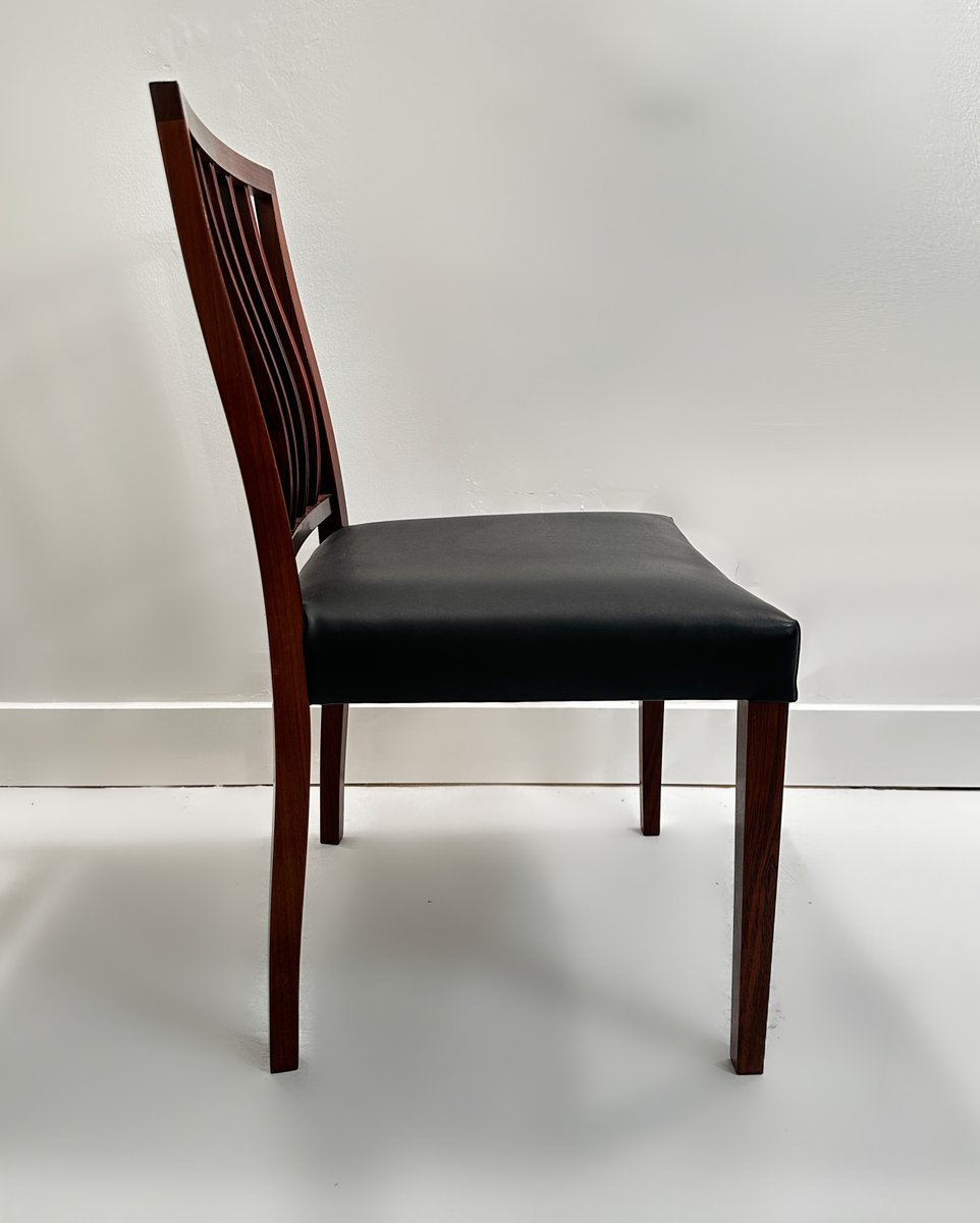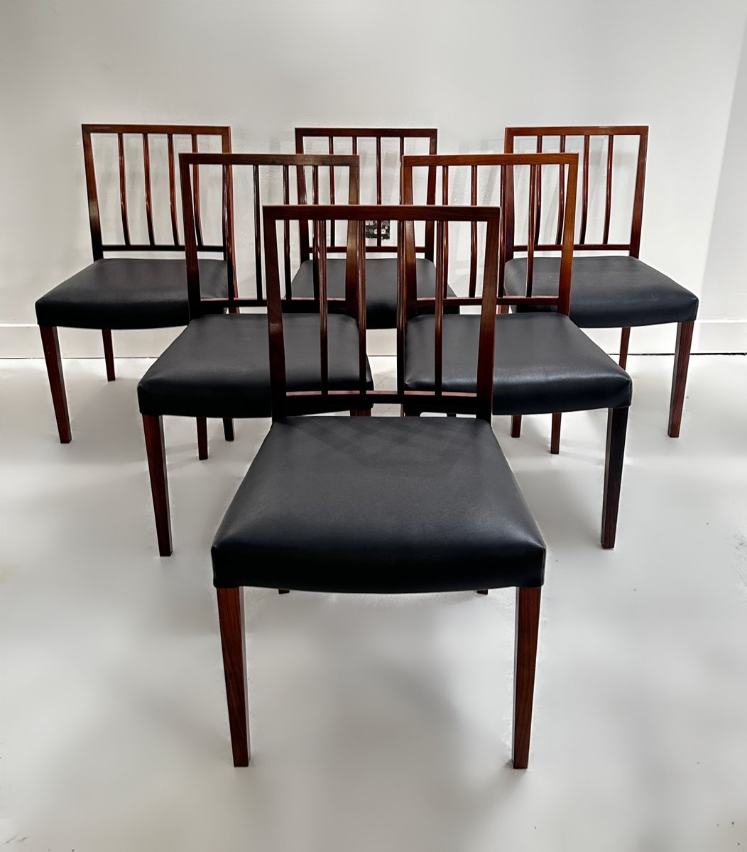Un meraviglioso e raro set di 6 sedie da pranzo in palissandro massiccio disegnate da Robert Heritage per Archie Shine nel 1970 circa. Il set è composto da 6 sedie da pranzo standard e viene offerto al mercato completamente rifinito con olio danese e le sedute sono state interamente ritessute e poi rivestite con la pelle vinilica originale, di qualità così elevata da essere quasi immacolata.