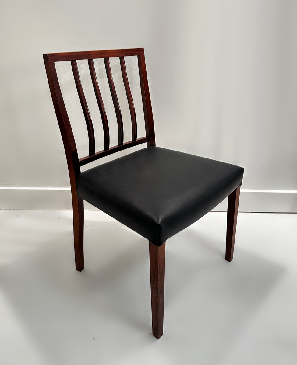 A wonderful and seldom seen set of 6 solid rosewood dining chairs designed by Robert Heritage for Archie Shine c.1970. The set features 6 standard dining chairs and are offered to market fully refinished with Danish oil and the seats have been fully re-webbed and then laid with the original vinyl leather as it’s such high quality it is almost immaculate.