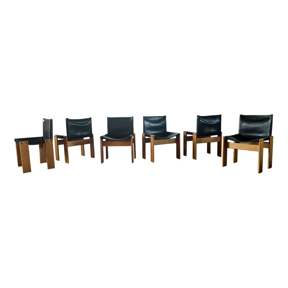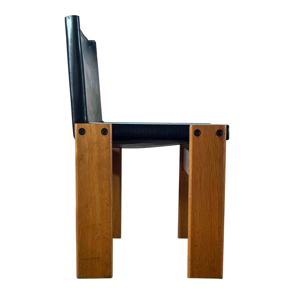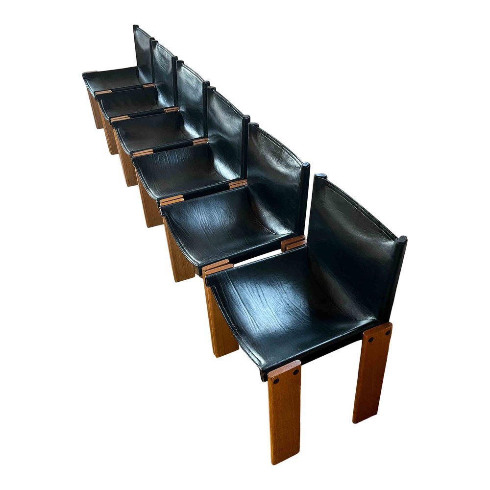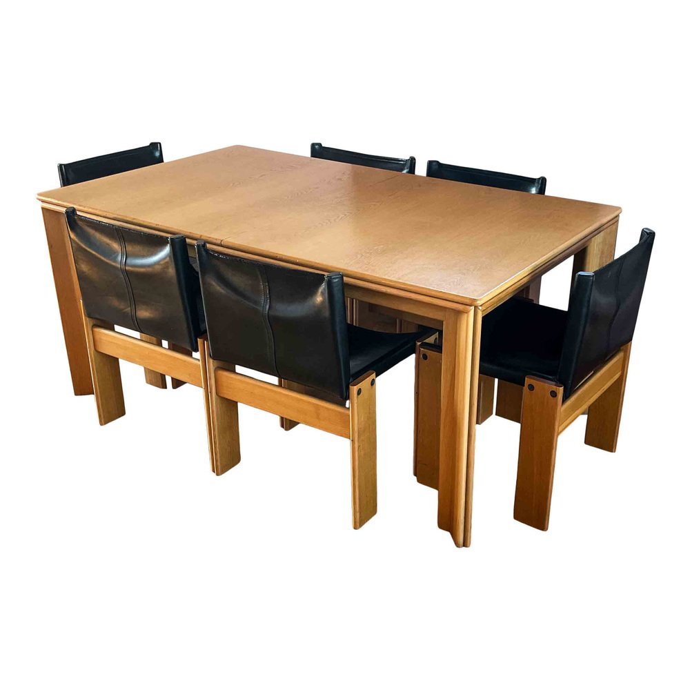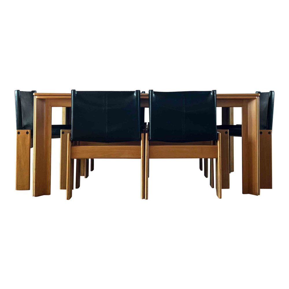 Afra & Tobia Scarpa, 6 sedie da pranzo e tavolo Monk, faggio e pelle nera, Italia, 1973.