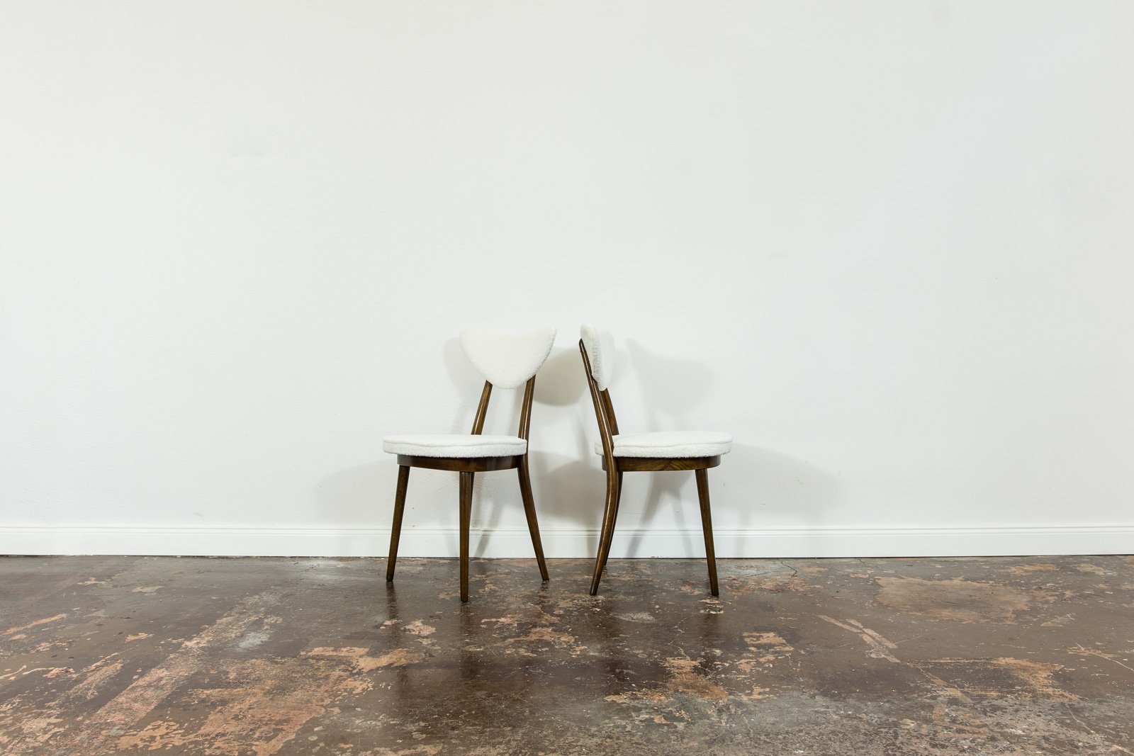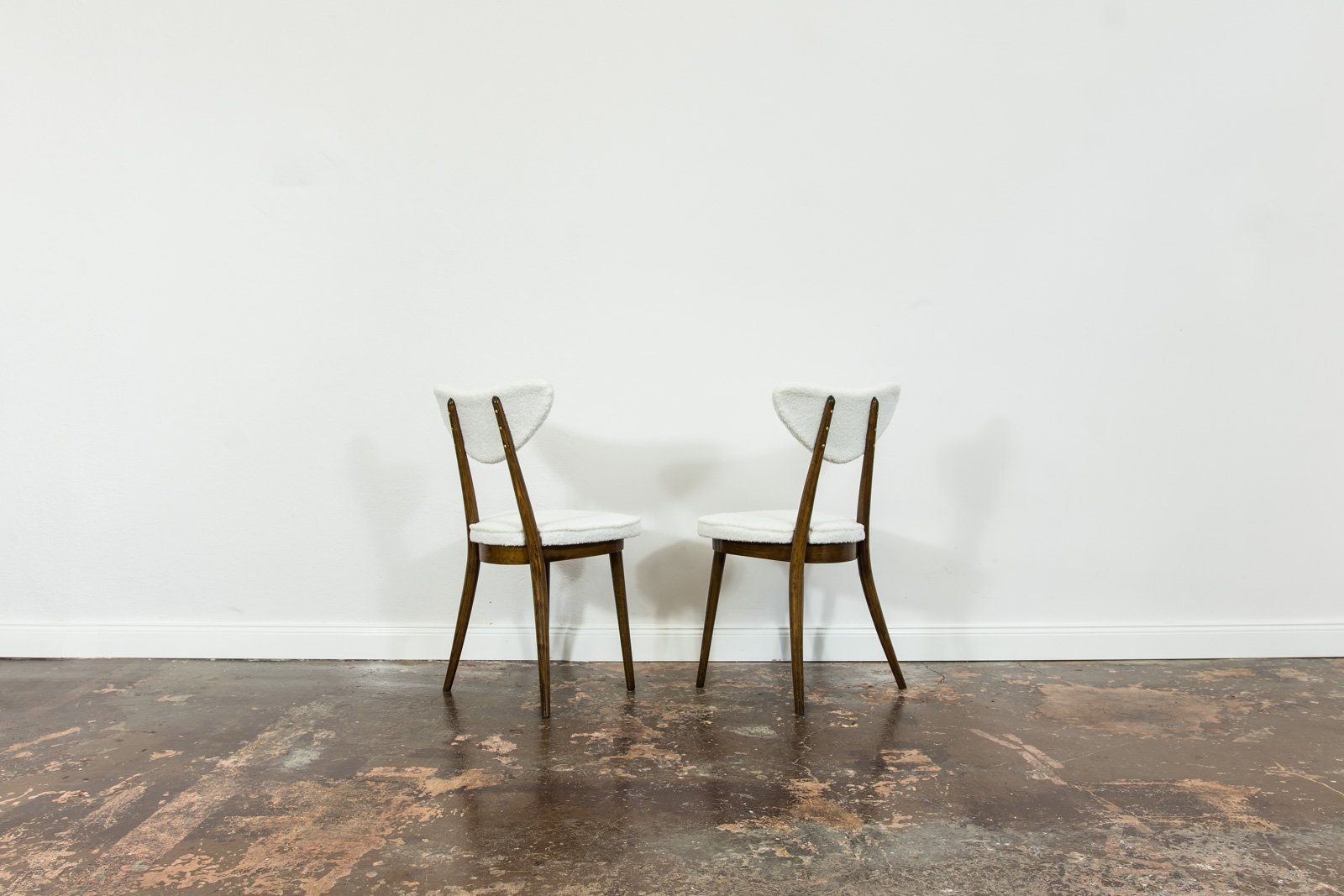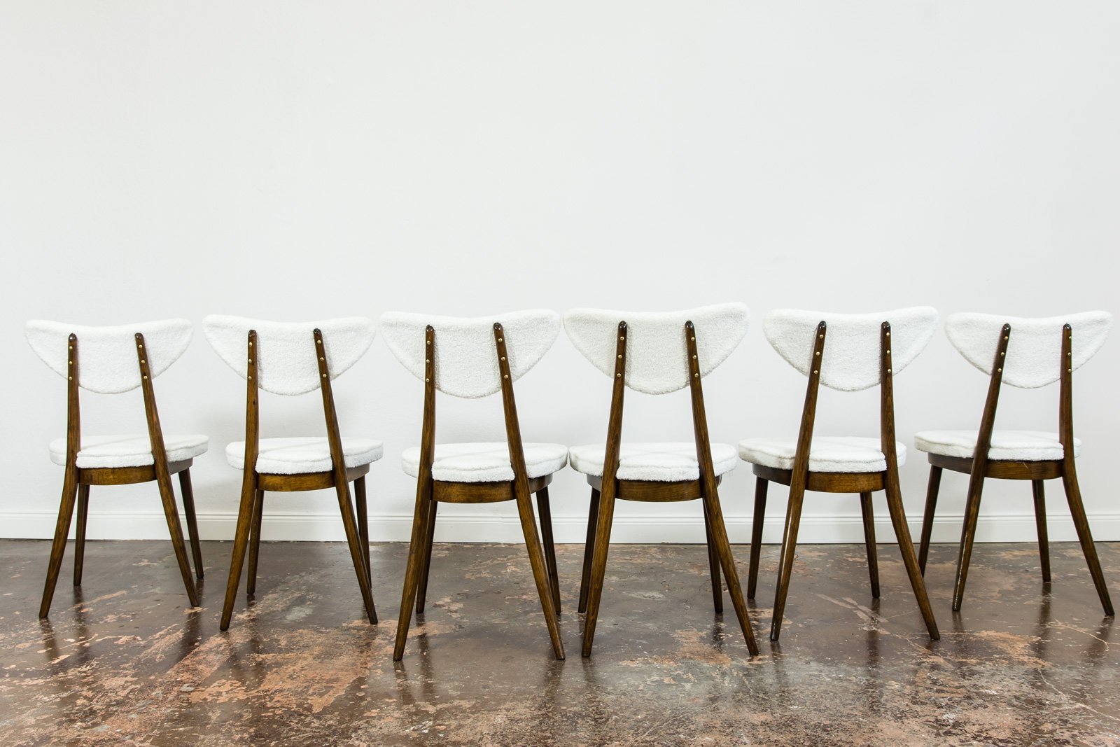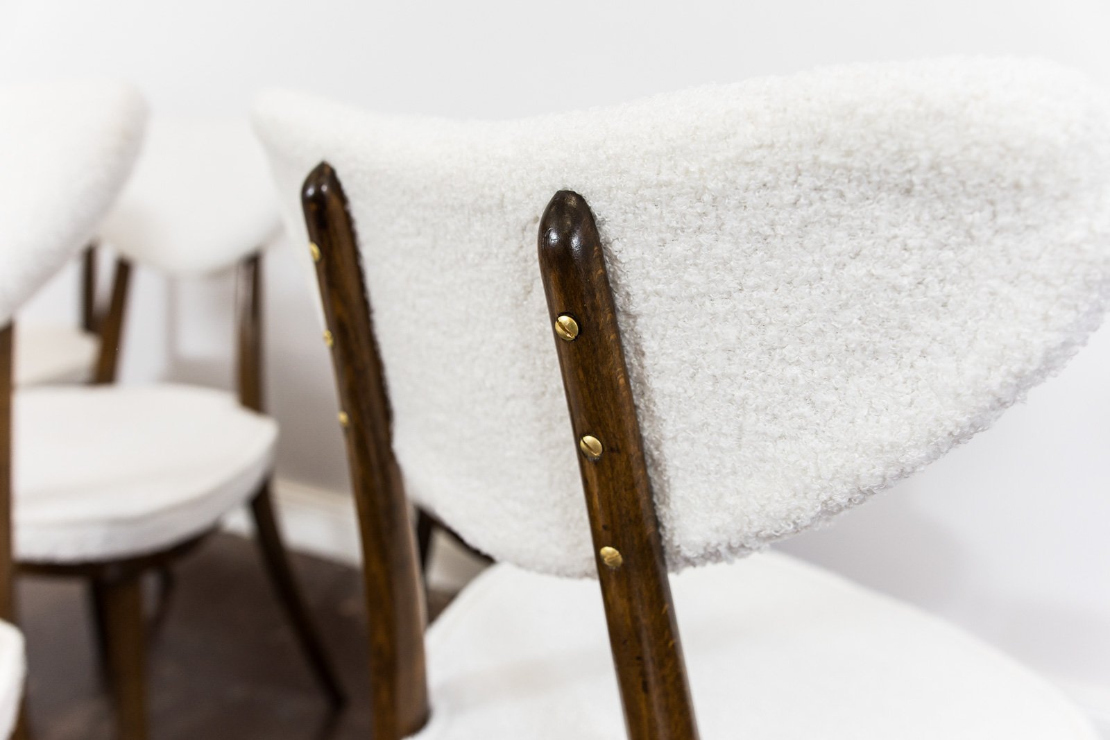 A set of six dining chairs, model 124, designed by Helena and Jerzy Kurmanowicz and manufactured by Radomszczańskie Zakłady Przemysłu Drzewnego in the 1950s. In 1959, this design won first prize in a competition organized by PAGED (Polish Wood Export Agency). Known as “hearts,” these dining chairs are distinguished by their heart-shaped backrests, crafted from bent plywood. The craftsmanship of model 124 highlights a consistent use of advanced bending techniques, with each wooden component, including the ring supporting the seat, made from a single bent piece. The bent legs further enhance the cohesive aesthetic of the “hearts” design. The seats and backrests are upholstered in soft, white fabric. Although the chairs are part of a single set, slight variations in leg width or bend curvature from the manufacturing process lend a unique character to each piece.