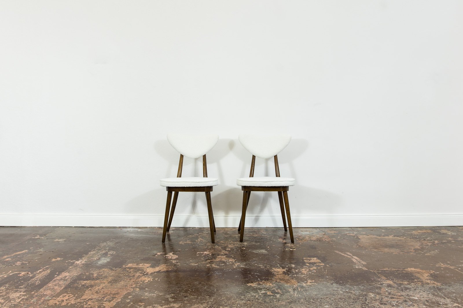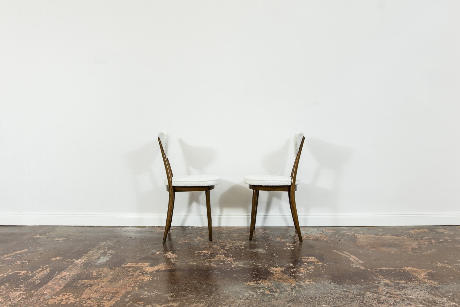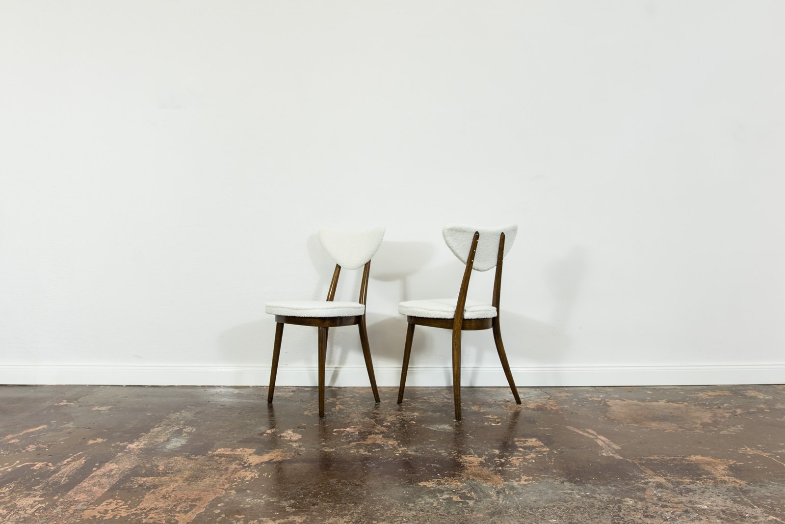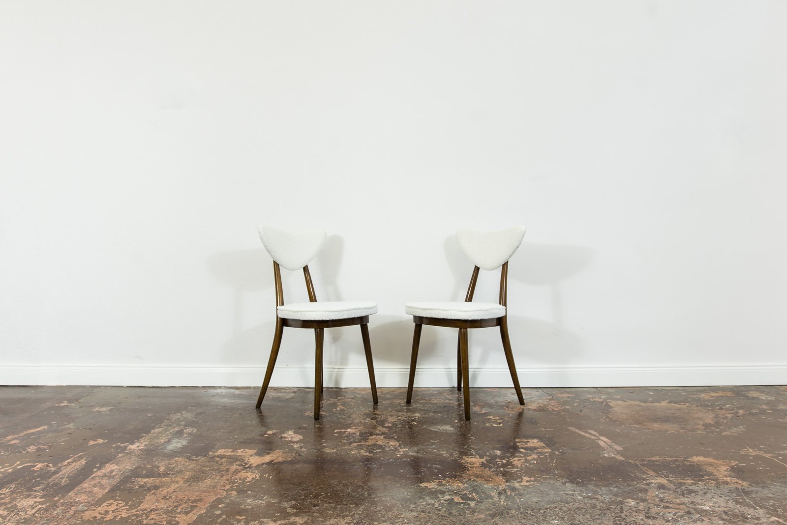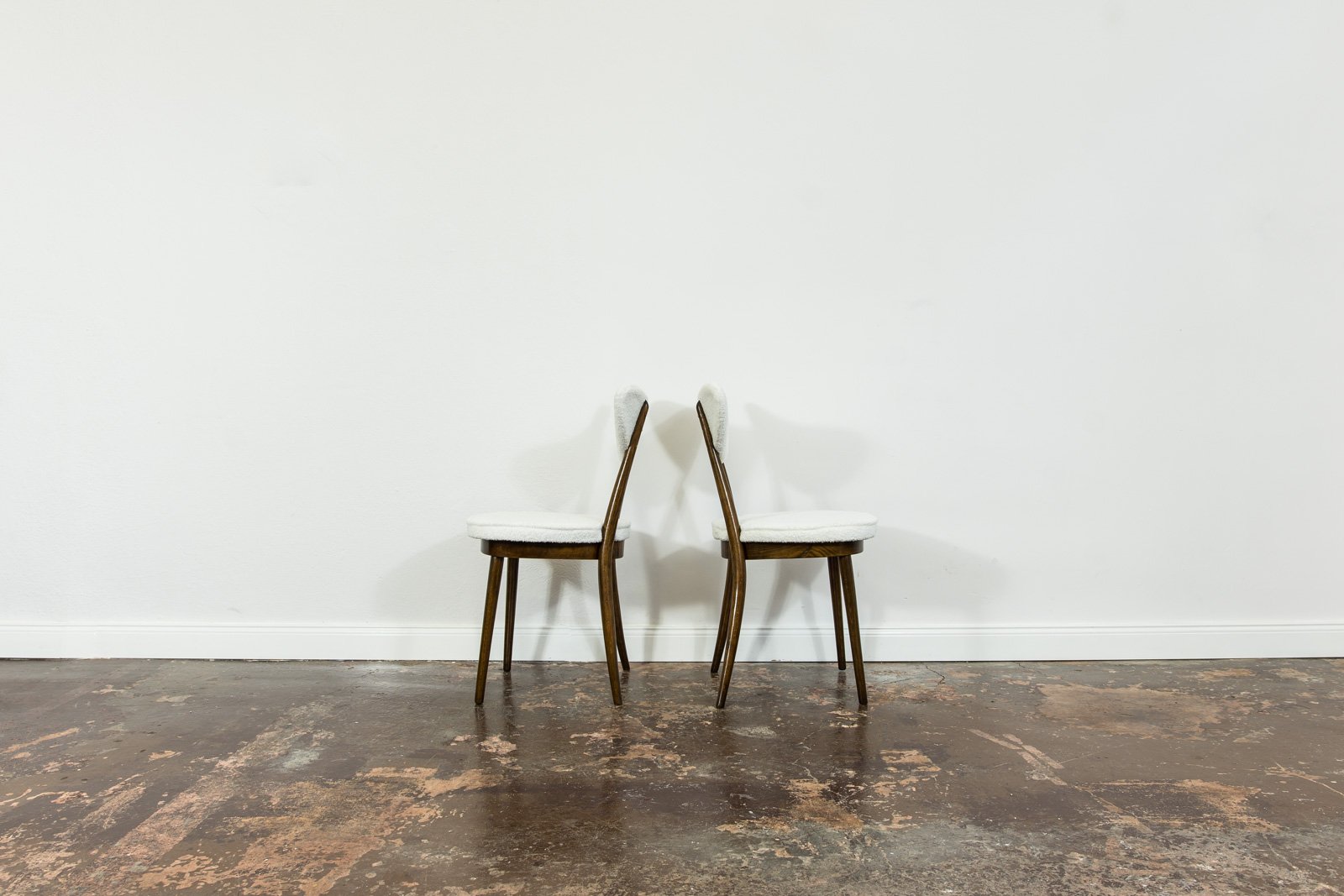 A set of six dining chairs, model 124, designed by Helena and Jerzy Kurmanowicz and manufactured by Radomszczańskie Zakłady Przemysłu Drzewnego in the 1950s. In 1959, this design won first prize in a competition organized by PAGED (Polish Wood Export Agency). Known as “hearts,” these dining chairs are distinguished by their heart-shaped backrests, crafted from bent plywood. The craftsmanship of model 124 highlights a consistent use of advanced bending techniques, with each wooden component, including the ring supporting the seat, made from a single bent piece. The bent legs further enhance the cohesive aesthetic of the “hearts” design. The seats and backrests are upholstered in soft, white fabric. Although the chairs are part of a single set, slight variations in leg width or bend curvature from the manufacturing process lend a unique character to each piece.