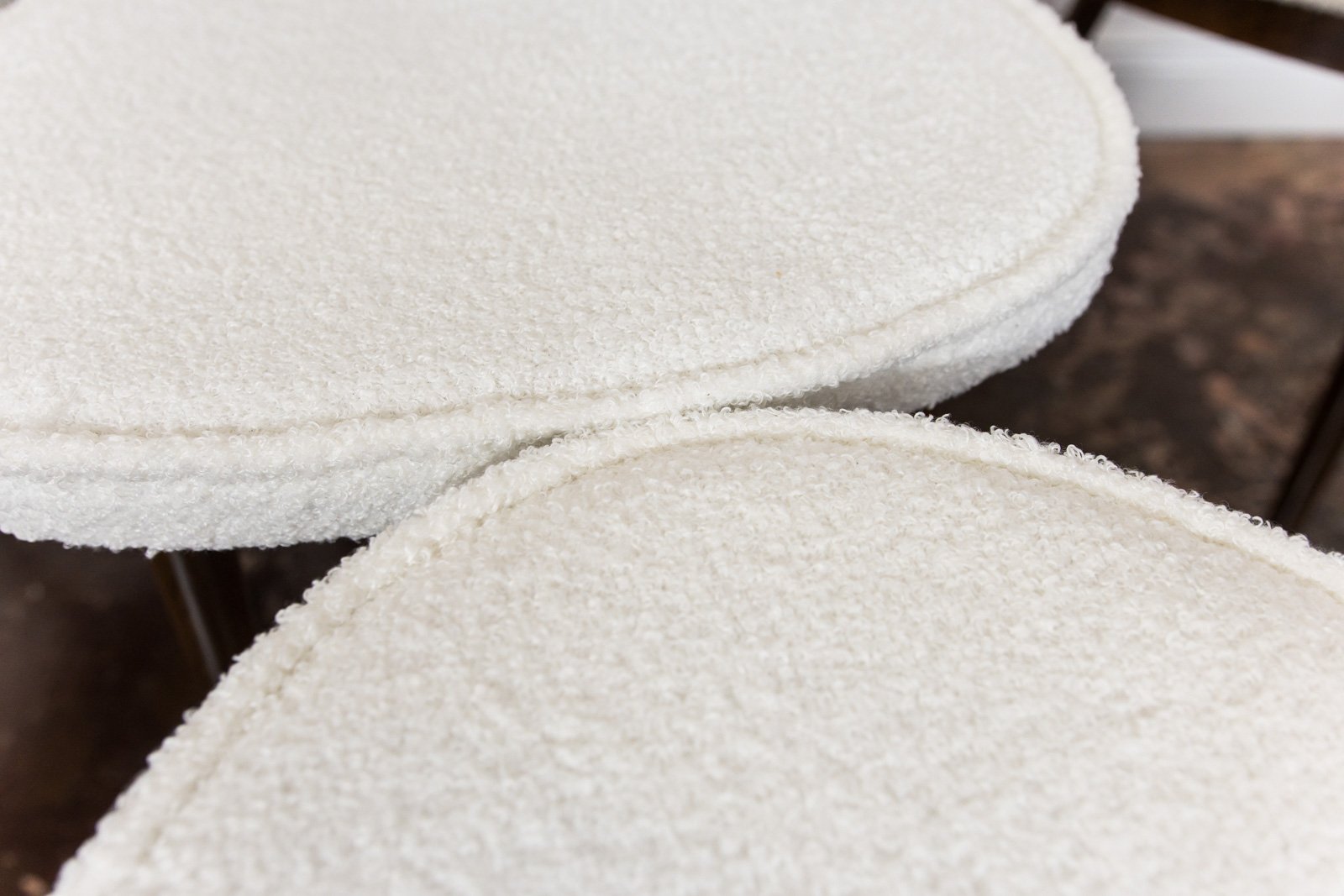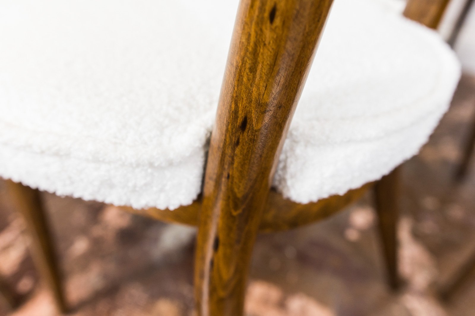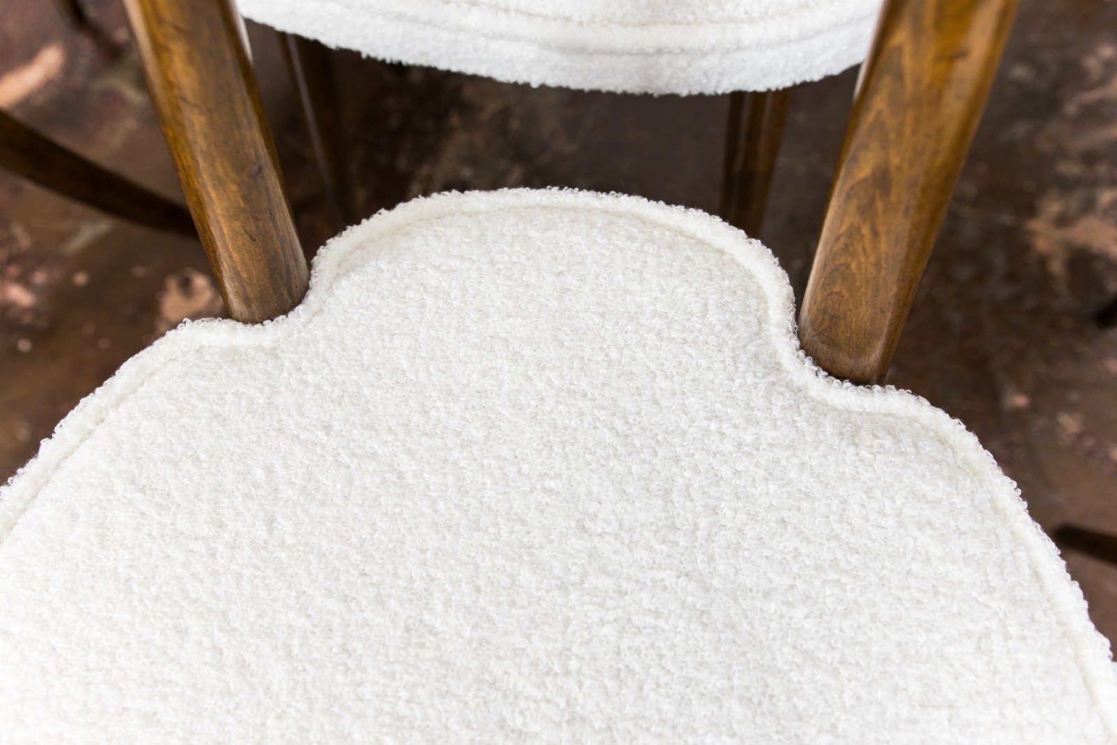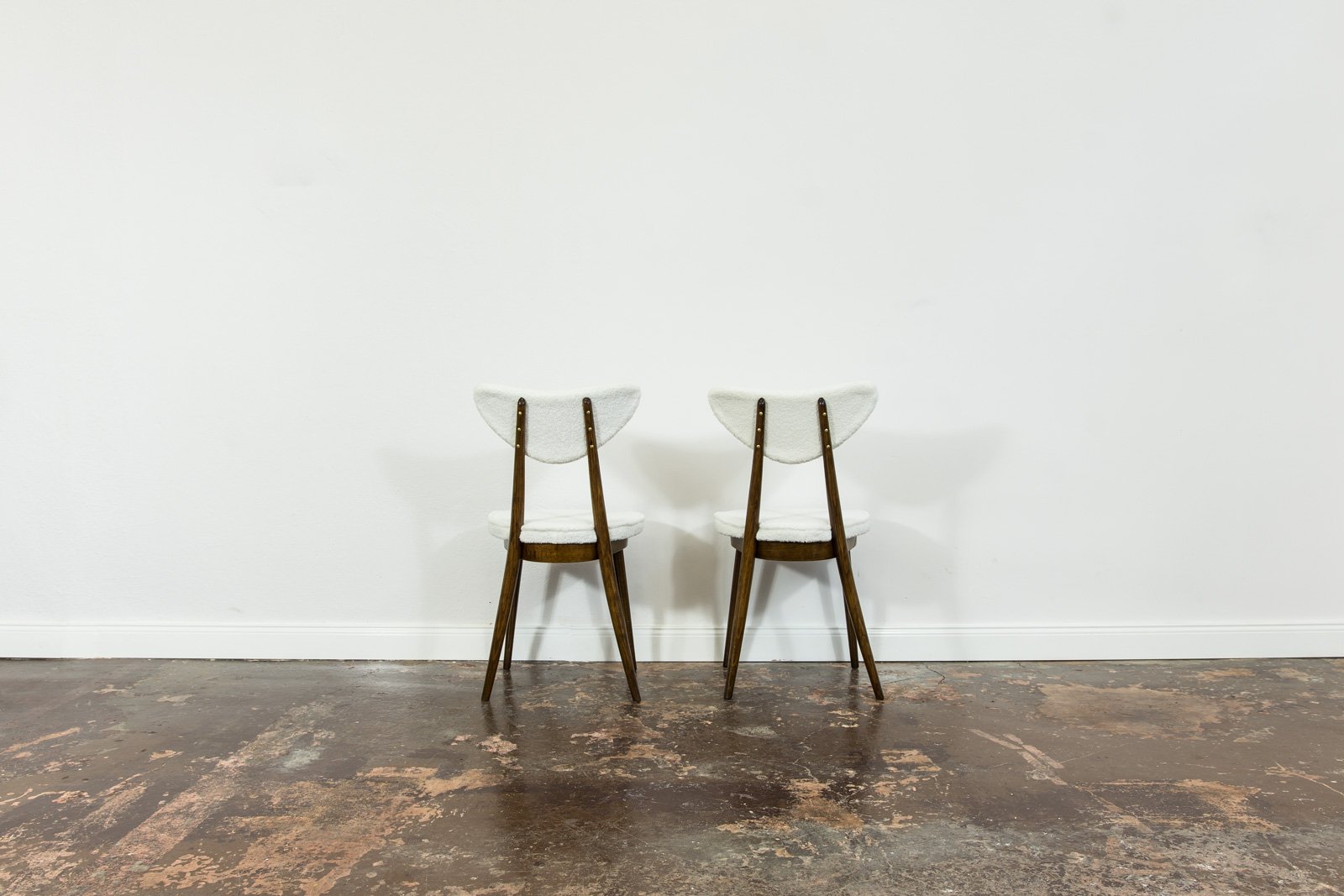 A set of six dining chairs, model 124, designed by Helena and Jerzy Kurmanowicz and manufactured by Radomszczańskie Zakłady Przemysłu Drzewnego in the 1950s. In 1959, this design won first prize in a competition organized by PAGED (Polish Wood Export Agency). Known as “hearts,” these dining chairs are distinguished by their heart-shaped backrests, crafted from bent plywood. The craftsmanship of model 124 highlights a consistent use of advanced bending techniques, with each wooden component, including the ring supporting the seat, made from a single bent piece. The bent legs further enhance the cohesive aesthetic of the “hearts” design. The seats and backrests are upholstered in soft, white fabric. Although the chairs are part of a single set, slight variations in leg width or bend curvature from the manufacturing process lend a unique character to each piece.