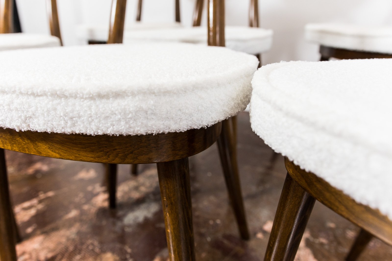 Un set di sei sedie da pranzo, modello 124, disegnato da Helena e Jerzy Kurmanowicz e prodotto da Radomszczańskie Zakłady Przemysłu Drzewnego negli anni Cinquanta. Nel 1959, questo design vinse il primo premio in un concorso organizzato dalla PAGED (Agenzia polacca per l'esportazione del legno). Conosciute come "cuori", queste sedie da pranzo si distinguono per gli schienali a forma di cuore, realizzati in compensato curvato. L'artigianato del modello 124 evidenzia l'uso costante di tecniche di piegatura avanzate, con ogni componente in legno, compreso l'anello che sostiene la seduta, realizzato da un unico pezzo piegato. Le gambe piegate esaltano ulteriormente l'estetica coesiva del design "a cuore". I sedili e gli schienali sono rivestiti in morbido tessuto bianco. Sebbene le sedie facciano parte di un unico set, lievi variazioni nella larghezza delle gambe o nella curvatura delle stesse, dovute al processo di produzione, conferiscono un carattere unico a ciascun pezzo.