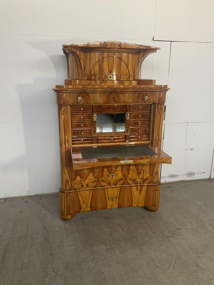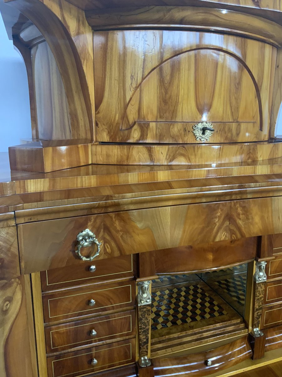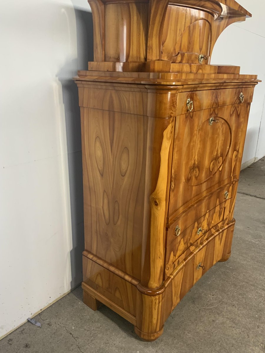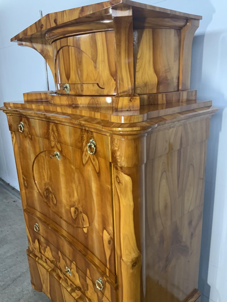 Mobile magistrale ricavato dal durame del ciliegio, architettura eccellente, aspetto eccezionale dell'impiallacciatura, piano a gradini, con timpano, porta con pannello, con serratura, cassetto sottostante con ferramenta in ottone, bellissimo mobile, intarsiato al centro, specchiato. cassetto a gradini, molti piccoli cassetti, sportello di scrittura a doppia chiusura, compresi 2 grandi cassetti con serratura a scatola, tutte le chiavi incluse, accuratamente restaurato e lucidato a mano con gommalacca, il corpo poggia su piedi a blocco.