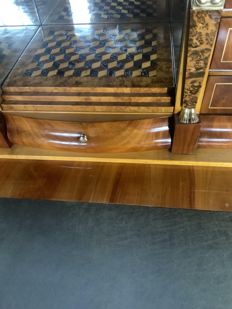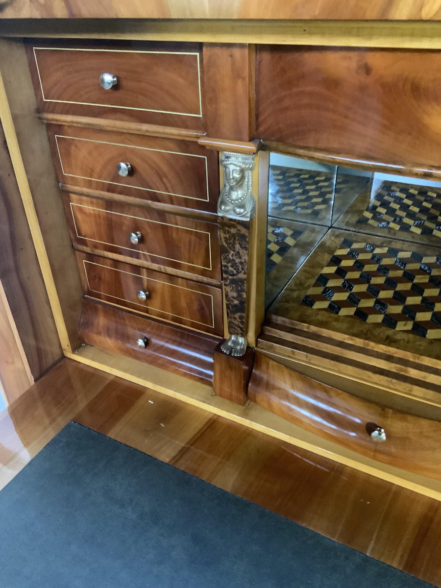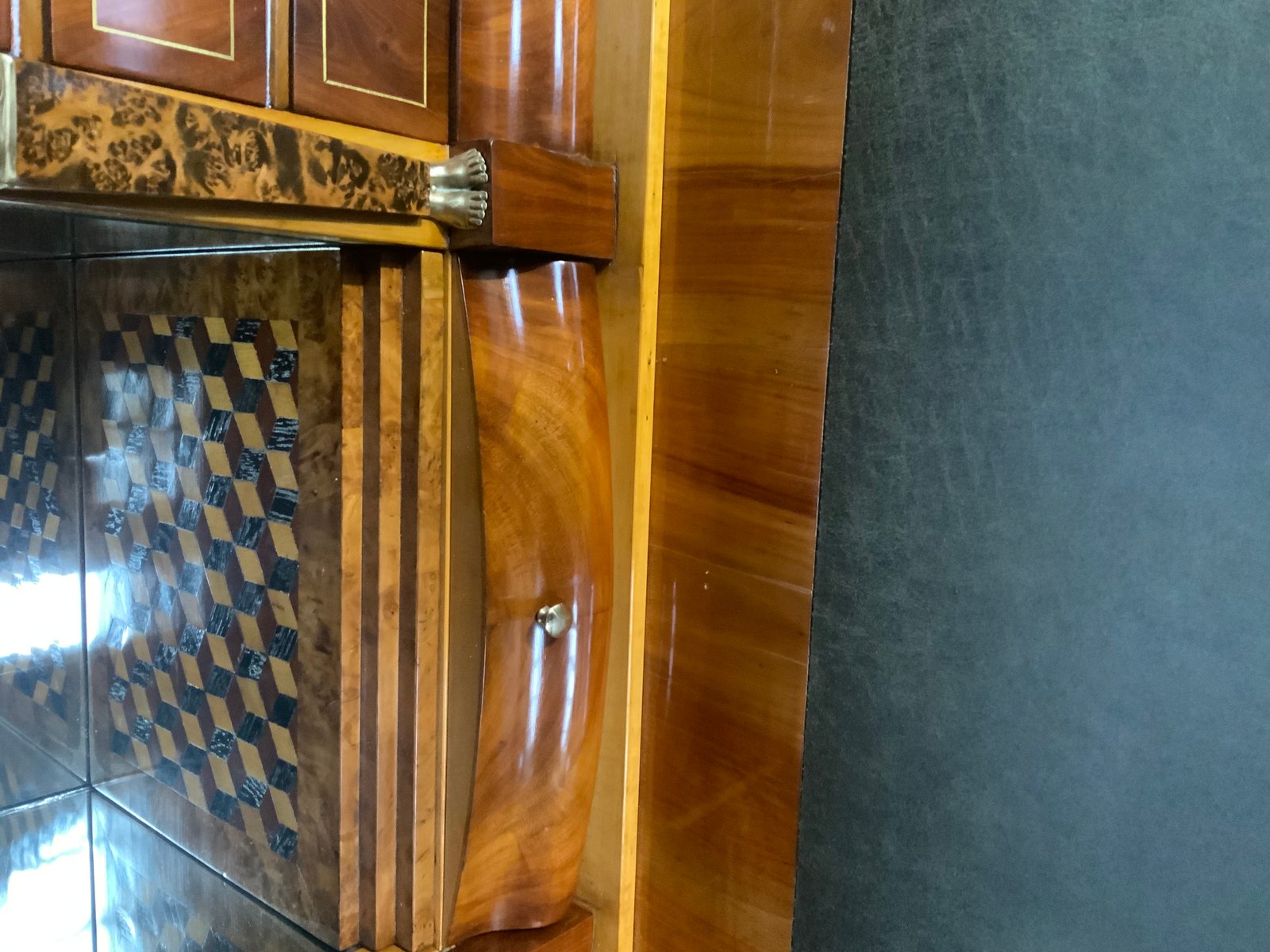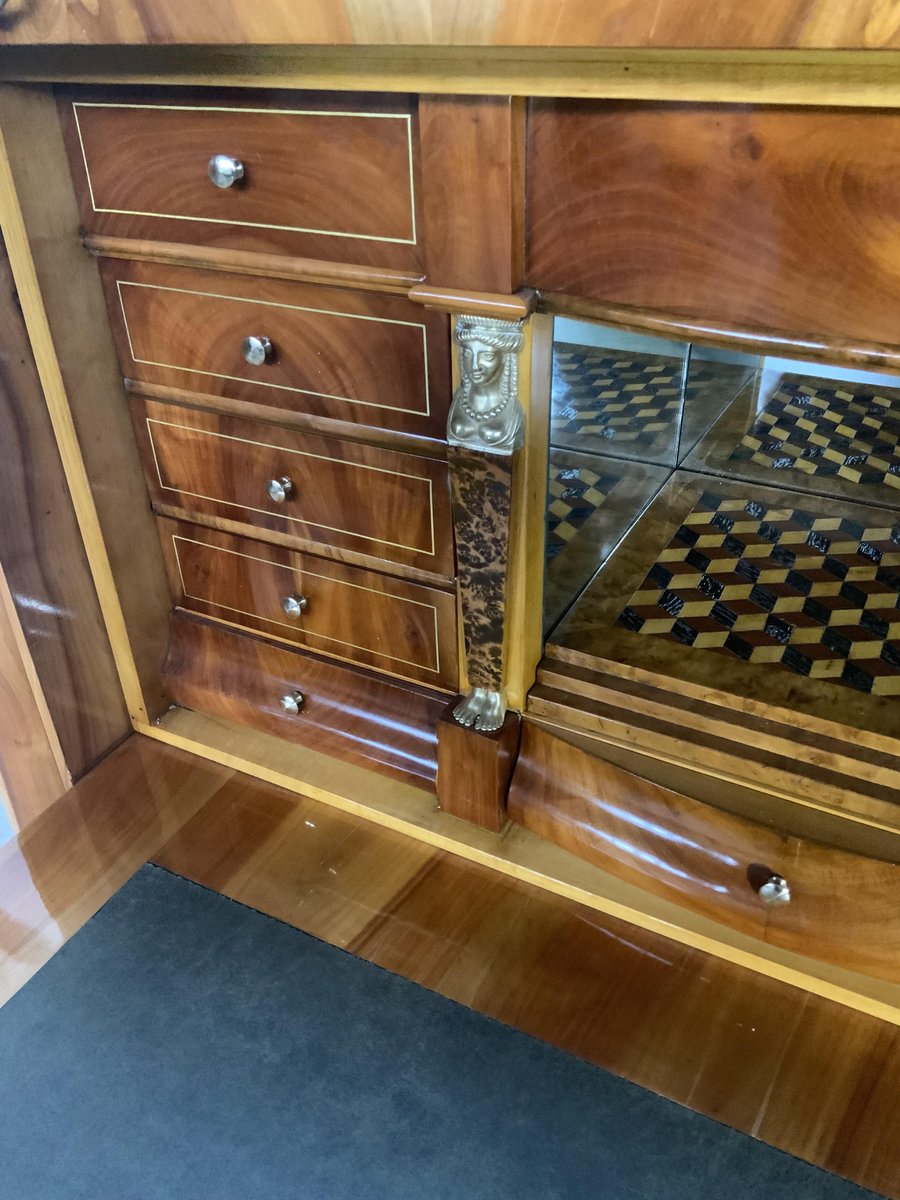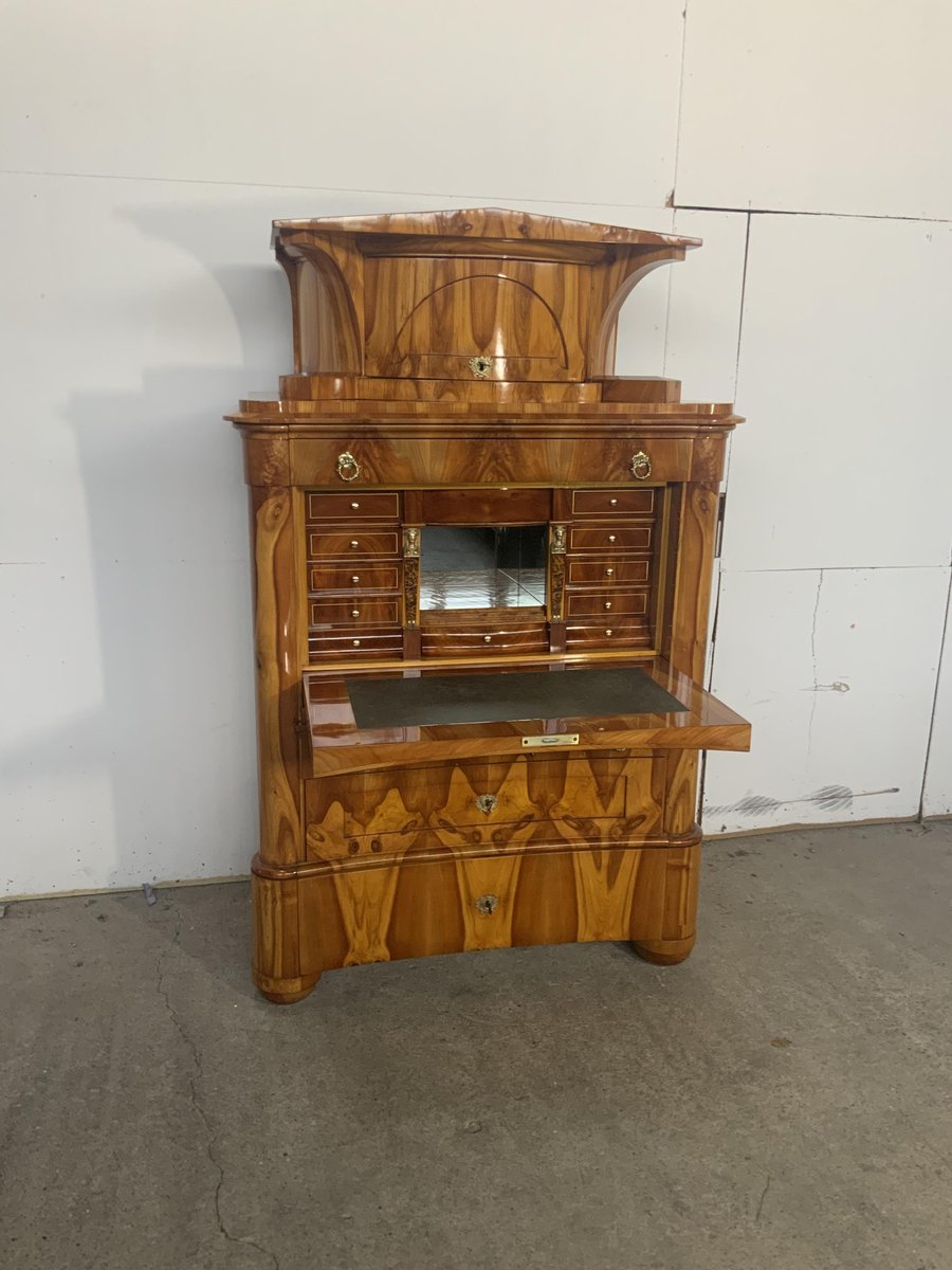 Mobile magistrale ricavato dal durame del ciliegio, architettura eccellente, aspetto eccezionale dell'impiallacciatura, piano a gradini, con timpano, porta con pannello, con serratura, cassetto sottostante con ferramenta in ottone, bellissimo mobile, intarsiato al centro, specchiato. cassetto a gradini, molti piccoli cassetti, sportello di scrittura a doppia chiusura, compresi 2 grandi cassetti con serratura a scatola, tutte le chiavi incluse, accuratamente restaurato e lucidato a mano con gommalacca, il corpo poggia su piedi a blocco.