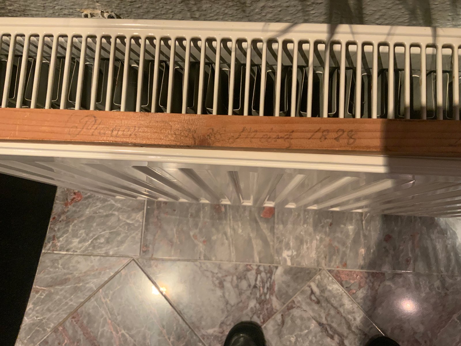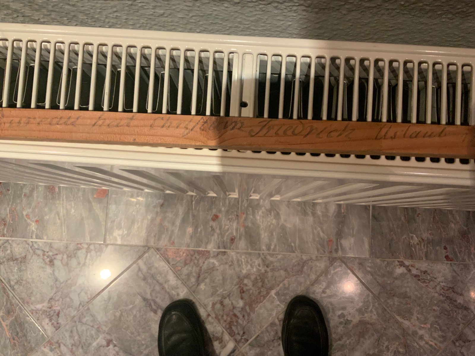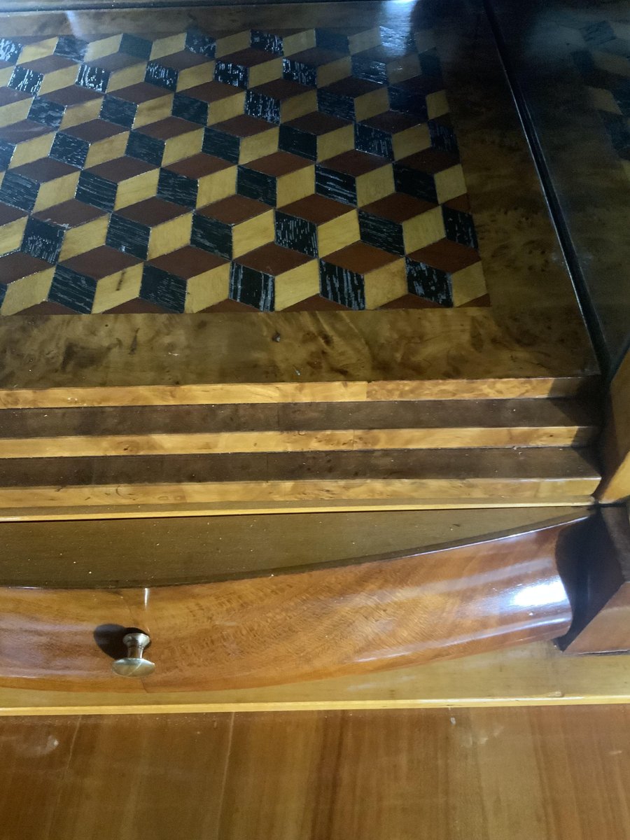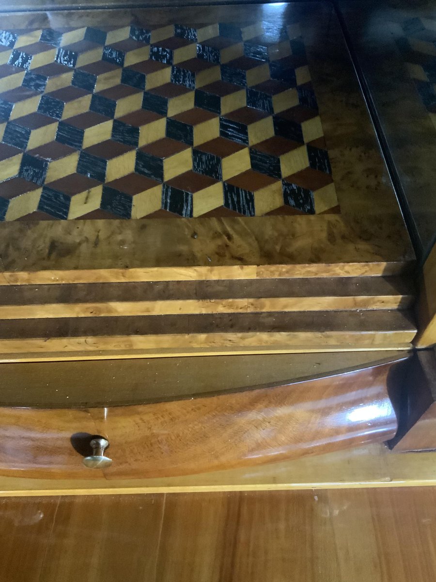Mobile magistrale ricavato dal durame del ciliegio, architettura eccellente, aspetto eccezionale dell'impiallacciatura, piano a gradini, con timpano, porta con pannello, con serratura, cassetto sottostante con ferramenta in ottone, bellissimo mobile, intarsiato al centro, specchiato. cassetto a gradini, molti piccoli cassetti, sportello di scrittura a doppia chiusura, compresi 2 grandi cassetti con serratura a scatola, tutte le chiavi incluse, accuratamente restaurato e lucidato a mano con gommalacca, il corpo poggia su piedi a blocco.