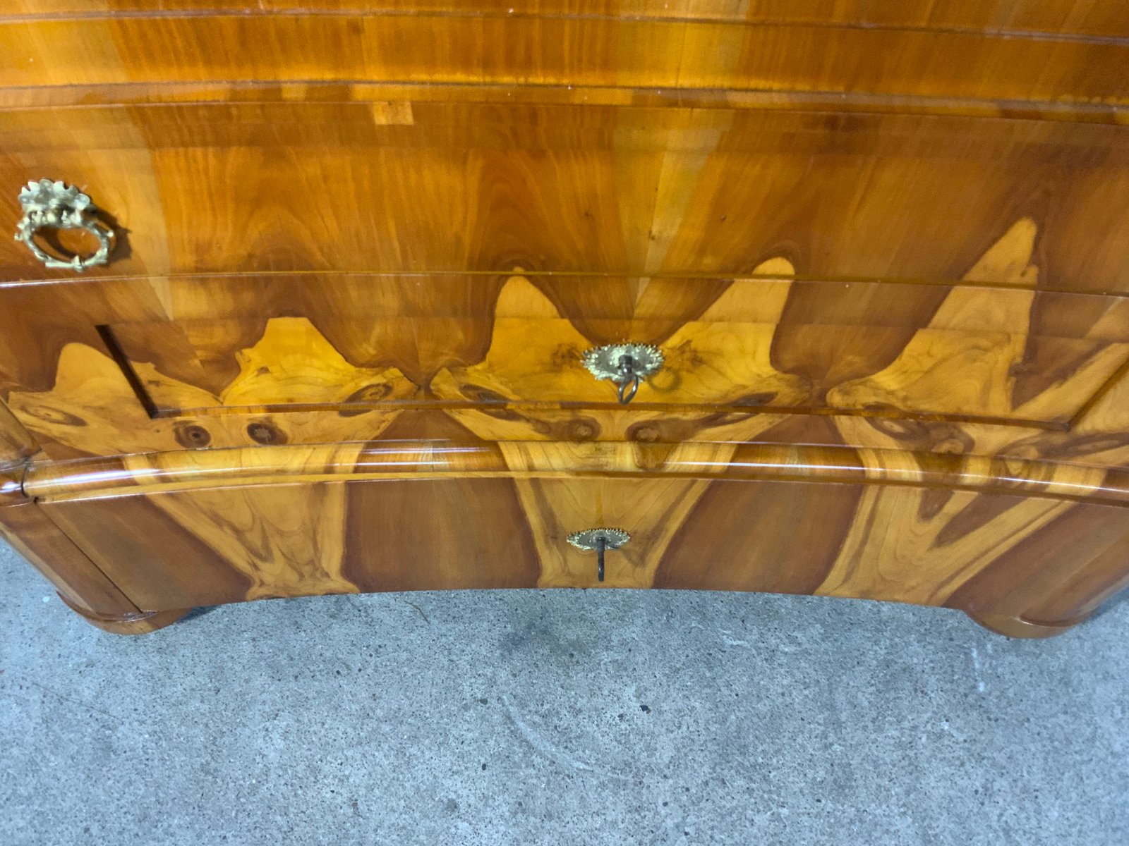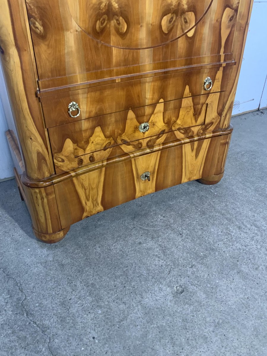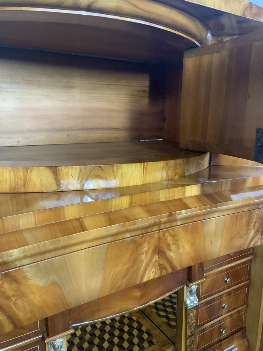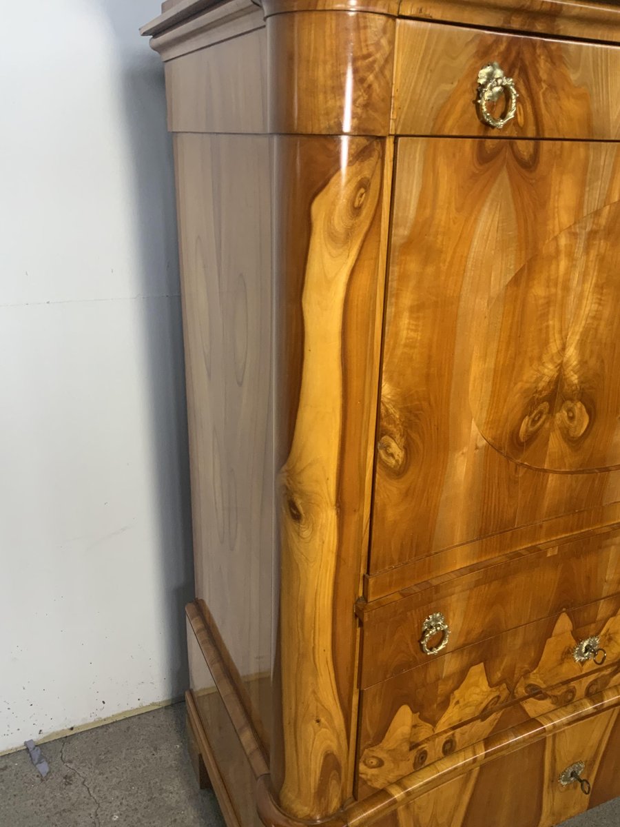 Masterful furniture made from cherry tree heartwood, excellent architecture, outstanding veneer appearance, stepped top, with gable, door with panel, lockable, drawer underneath with brass fittings, beautiful cabinet, marquetry in the middle, mirrored. stepped drawer, many small drawers, double locking writing flap, including 2 large drawers with box locks, all keys included, carefully restored and hand-polished with shellac, body rests on block feet.