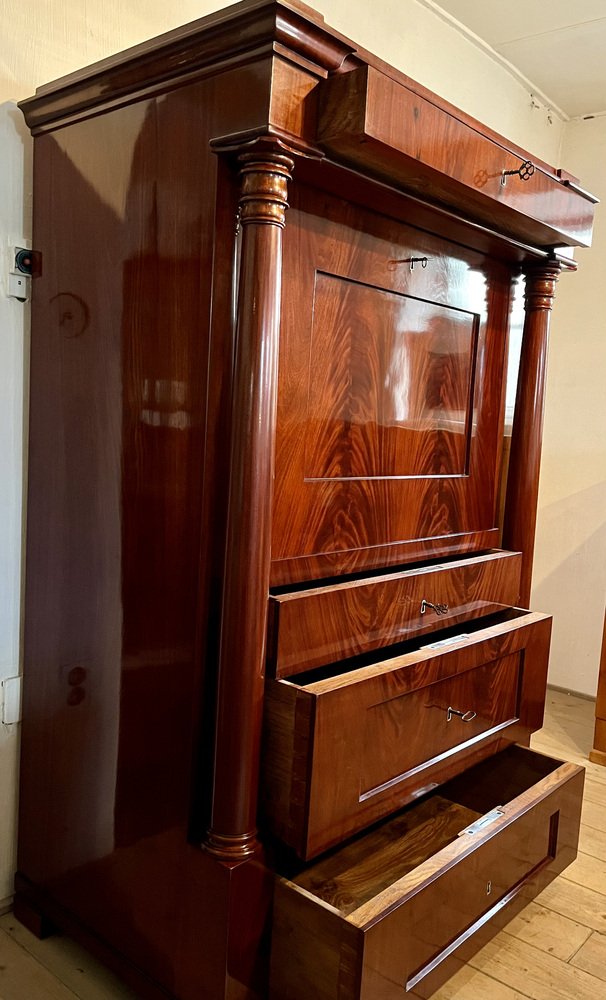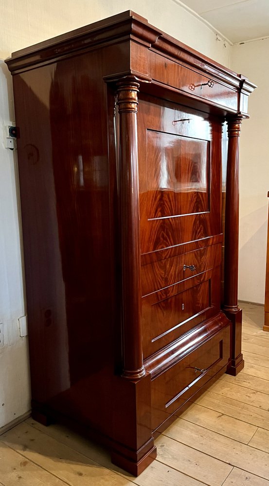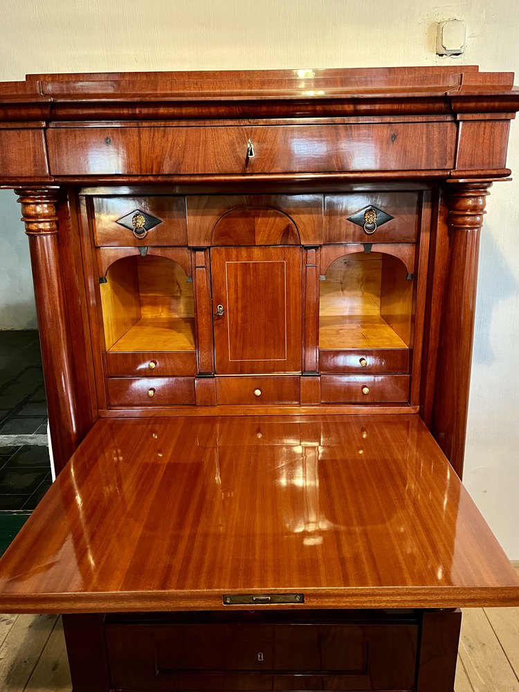 This impressive secretary desk from the Biedermeier period captivates with its harmonious proportions and striking mahogany veneer. Two columns give the piece a distinctive architectural presence, highlighting the representative character of its design. The desk features three drawers beneath the writing flap and an additional drawer in the crown. Behind the fold-down writing surface lies a finely arranged interior with five small drawers, one larger drawer, and a central little door. Crafted from mahogany veneer on oak and spruce wood, the piece has been carefully refinished with a traditional hand-polished shellac finish, resulting in an elegant, deep sheen.