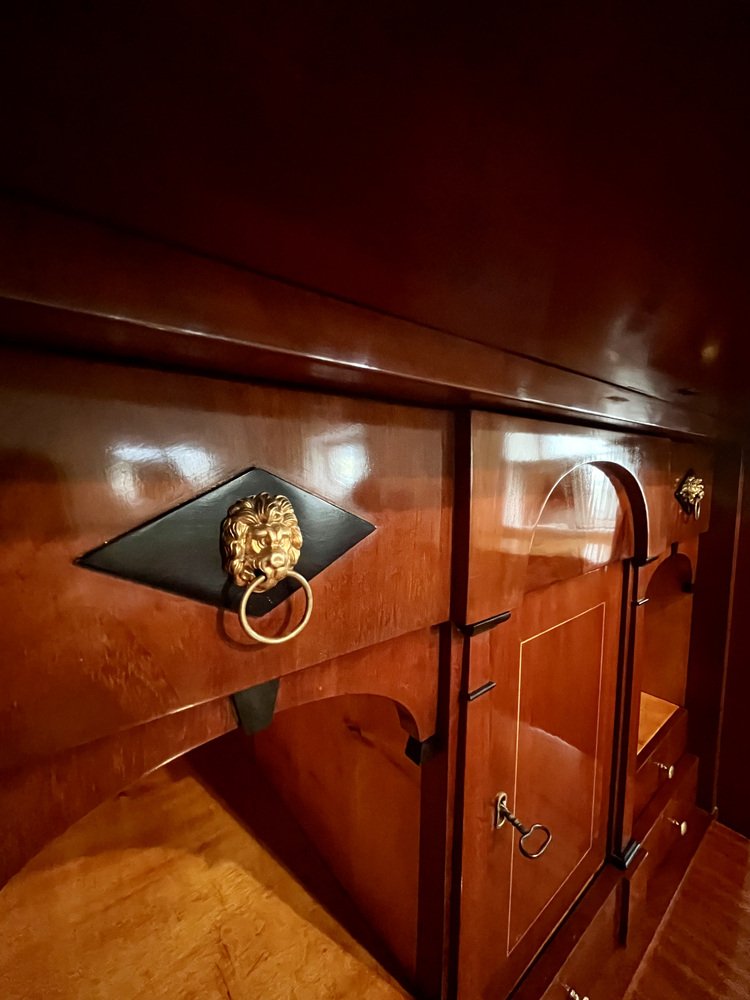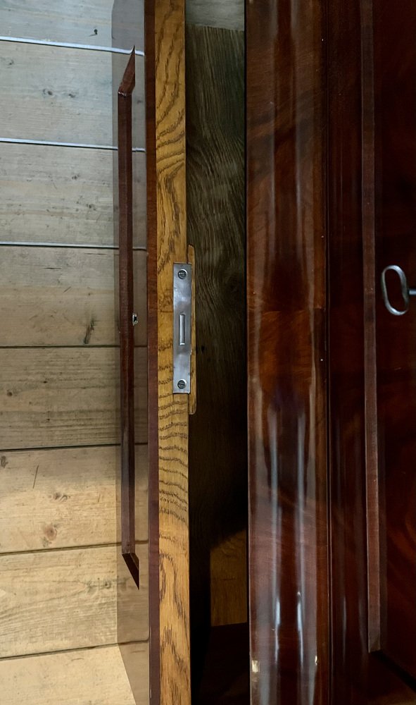 Questo imponente scrittoio del periodo Biedermeier affascina per le sue proporzioni armoniose e l'impiallacciatura in mogano. Due colonne conferiscono al pezzo una presenza architettonica distintiva, evidenziando il carattere rappresentativo del suo design. La scrivania è dotata di tre cassetti sotto la ribalta e di un ulteriore cassetto nella corona. Dietro la superficie di scrittura ribaltabile si trova un interno finemente organizzato con cinque piccoli cassetti, un cassetto più grande e un'antina centrale. Realizzato con impiallacciatura di mogano su legno di quercia e abete rosso, il pezzo è stato accuratamente rifinito con una tradizionale finitura a gommalacca lucidata a mano, che ha conferito una lucentezza elegante e profonda.