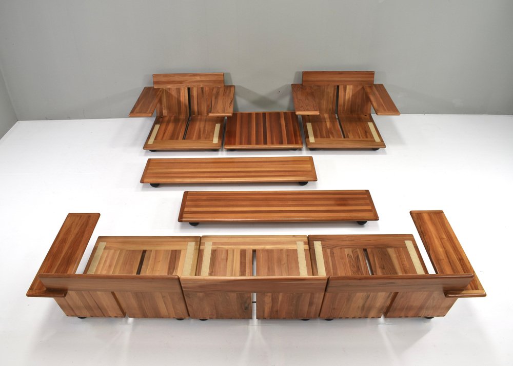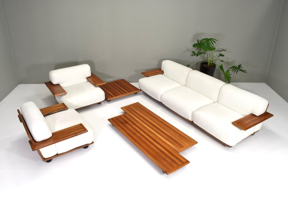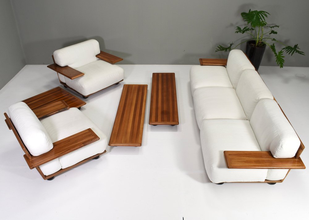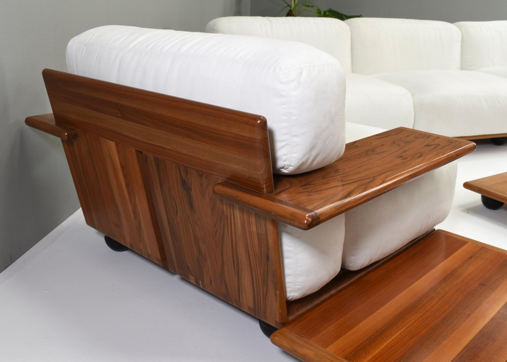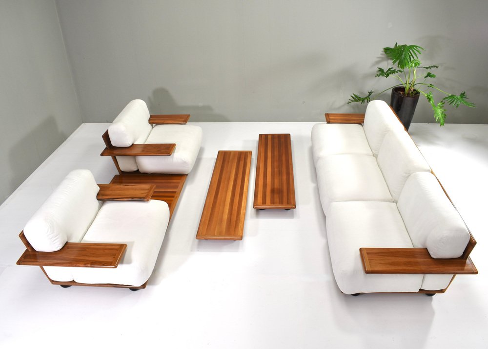 The Pianura living room set by Mario Bellini for CASSINA is a beautifully designed and stylish collection of furniture pieces that can transform your living room into a luxurious and comfortable space. This a very rare and complete set that isn’t on the market often. The set features: - Three piece sofa - Two armchairs - One square coffee table - Two rectangular coffee tables Designer: Mario Bellini is a renowned Italian architect and designer, known for his innovative and timeless creations. Manufacturer: Cassina (some items in this set are still labeled) Country: Italy Model: Pianura living room set Design period: 1971 Date of manufacturing: 1970’s Size WDH in cm: sofa: 265x90x65 Seat height 38 Arm height 42 chairs: 104x90x65 Seat height 38 Arm height 42 rectangular coffee tables: 160x40x11 square coffee table: 80x80x11 Material: Solid Italian Walnut / Fabric Condition: Very good. Some minor signs of age and use. Here’s an overview of the Pianura living room set: Sofa: The centerpiece of the Pianura living room set is a stunning sofa. It features a sleek and elegant design, with clean lines and exceptional craftsmanship. The sofa is designed for comfort, making it the perfect place to relax and entertain guests. Armchairs: To complement the sofa, the Pianura set includes matching armchairs. These armchairs share the same design aesthetics, offering additional seating options and maintaining a cohesive look in your living room. Coffee Tables: The set also includes coffee tables designed to harmonize with the seating elements. It’s a functional and stylish piece that can be used to display decorative items or serve snacks and beverages. Materials and Finishes: Mario Bellini is known for his attention to detail and the use of high-quality materials. The Pianura set features premium upholstery options, and the framework is crafted with precision, ensuring durability and longevity. Versatility: One of the strengths of the Pianura living room set is its versatility. The clean and minimalist design makes it suitable for a wide range of interior styles, from modern and contemporary to more classic and traditional decor. Comfort: Comfort is a top priority in the design of this living room set. The seating is likely to be well-padded and ergonomic, ensuring that you and your guests can enjoy hours of relaxation in style. CASSINA: CASSINA is a renowned Italian furniture manufacturer known for its commitment to quality, craftsmanship, and design excellence. They have collaborated with many iconic designers, including Mario Bellini, to create exceptional furniture collections. The Pianura living room set by Mario Bellini for CASSINA is a testament to the fusion of contemporary design and Italian craftsmanship. It offers a luxurious and inviting atmosphere for your living space, and it’s an investment in both style and comfort.