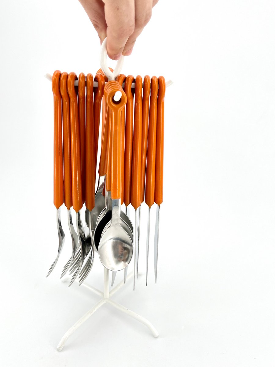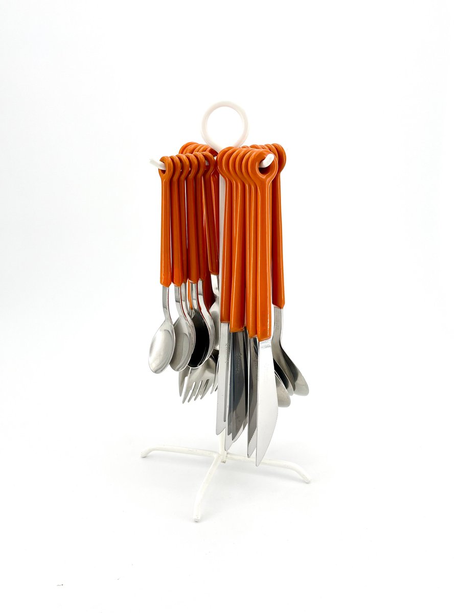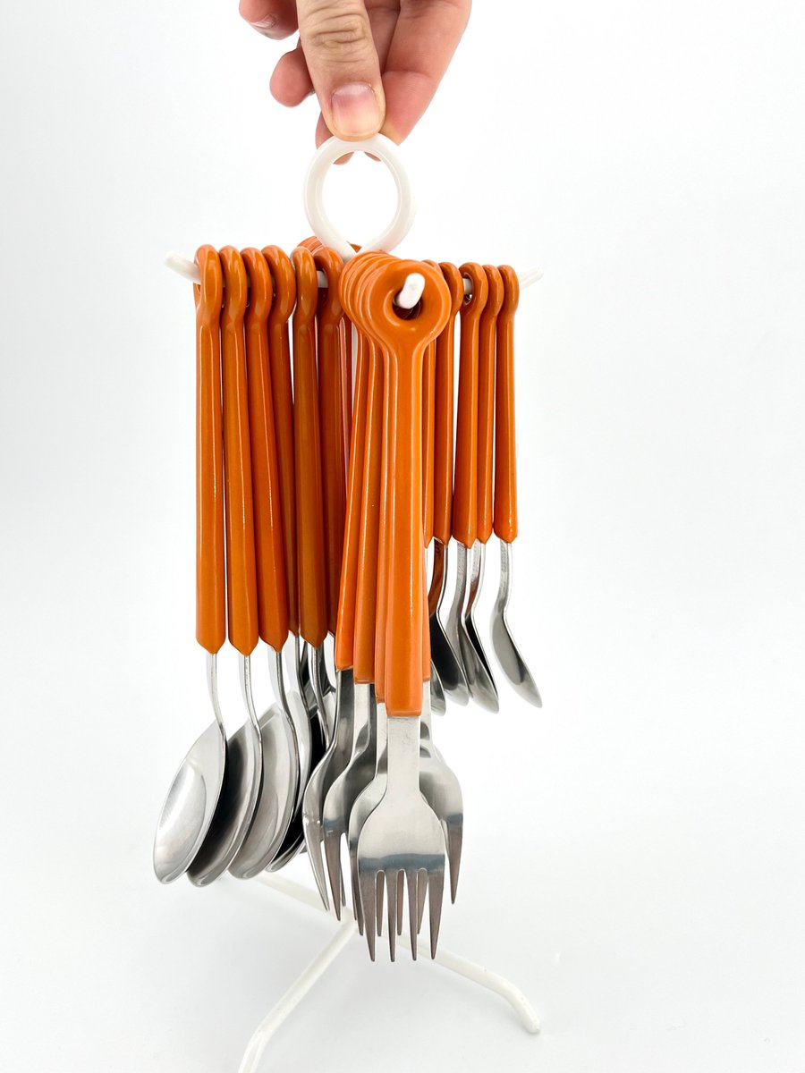 This original Mono Ring cutlery set, designed by Peter Raacke in 1959, includes 6 table forks, 6 table knives, 6 table spoons, and 6 coffee spoons, all elegantly displayed on a white-colored stand. The unique design allows the cutlery to be placed directly on the table as a complete set, rather than stored in a drawer. The set was part of the MoMA collection and was produced until the mid-1990s before being discontinued. Made of stainless steel 18/8 and polyamide, this vintage version is a rare find. It is not dishwasher safe, preserving its original integrity. A true collector’s item for those who appreciate mid-century modern design.