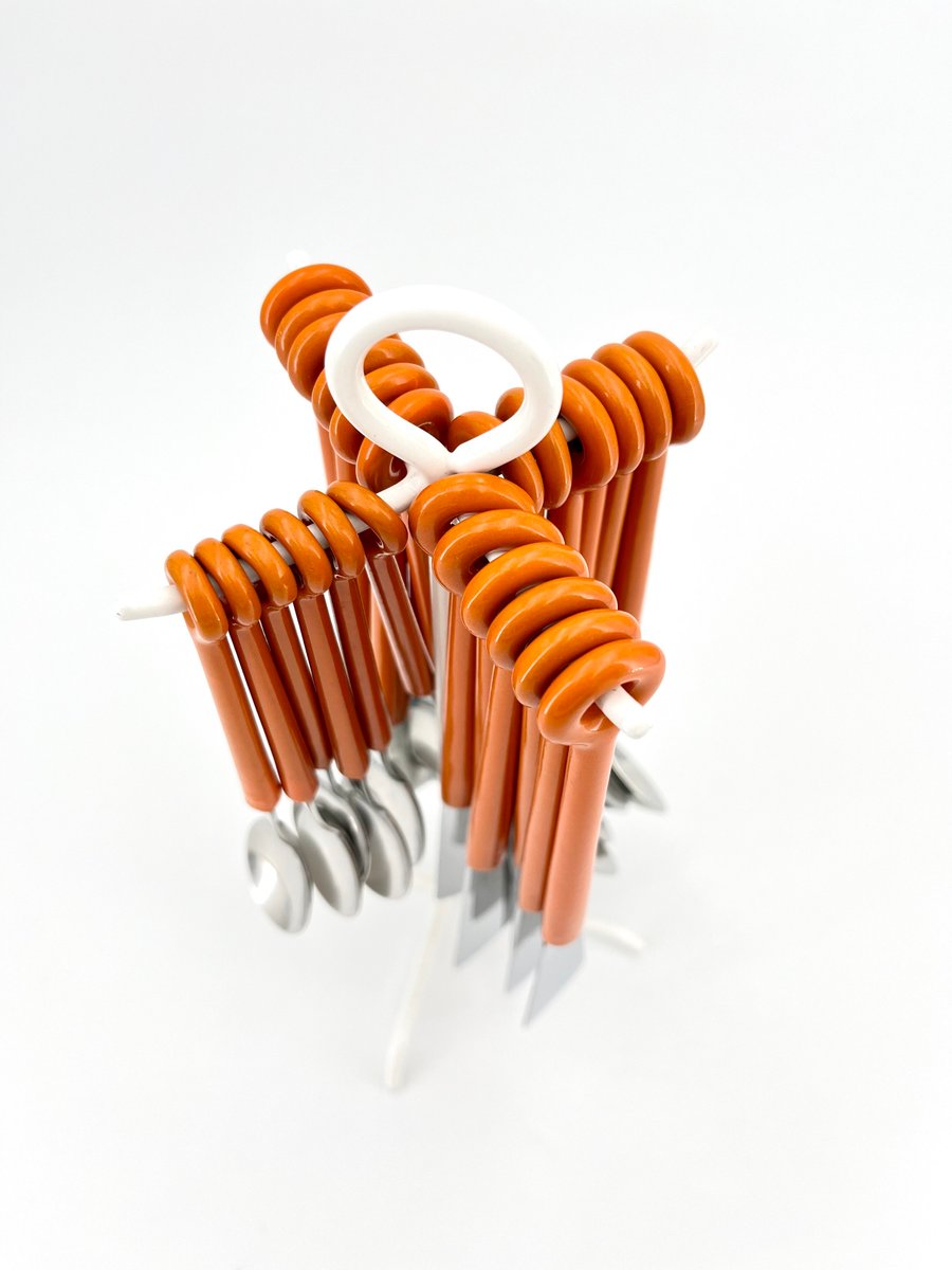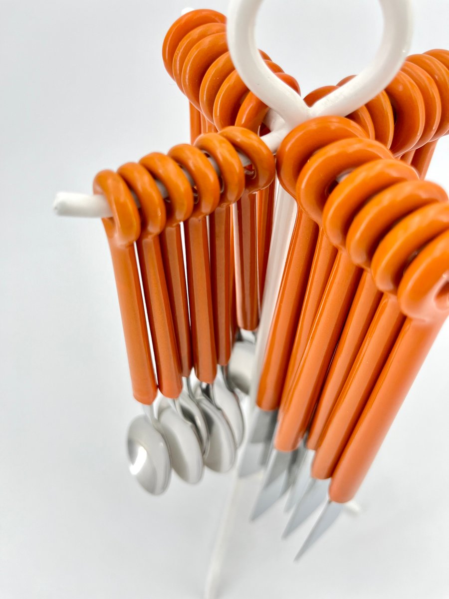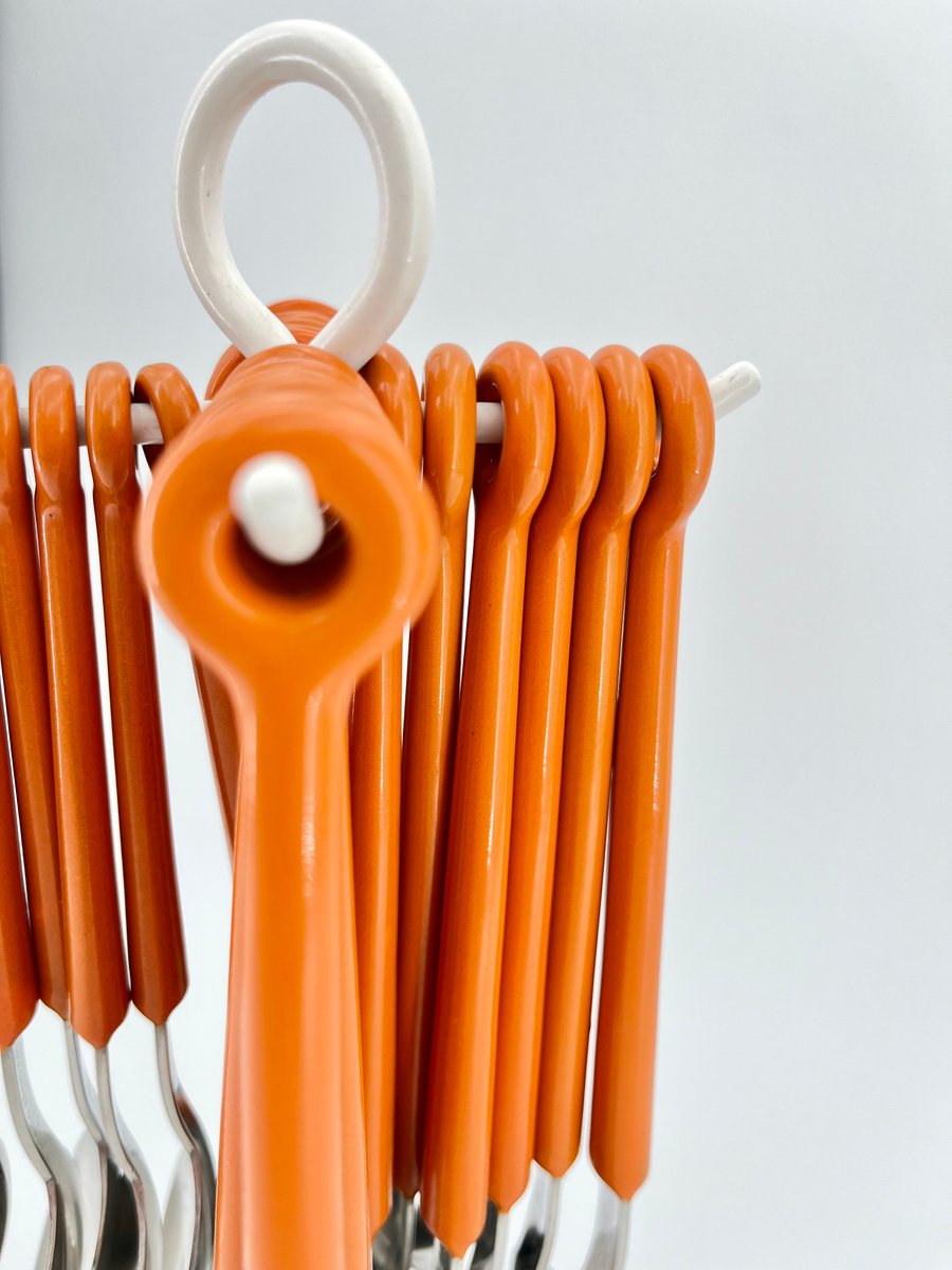 This original Mono Ring cutlery set, designed by Peter Raacke in 1959, includes 6 table forks, 6 table knives, 6 table spoons, and 6 coffee spoons, all elegantly displayed on a white-colored stand. The unique design allows the cutlery to be placed directly on the table as a complete set, rather than stored in a drawer. The set was part of the MoMA collection and was produced until the mid-1990s before being discontinued. Made of stainless steel 18/8 and polyamide, this vintage version is a rare find. It is not dishwasher safe, preserving its original integrity. A true collector’s item for those who appreciate mid-century modern design.