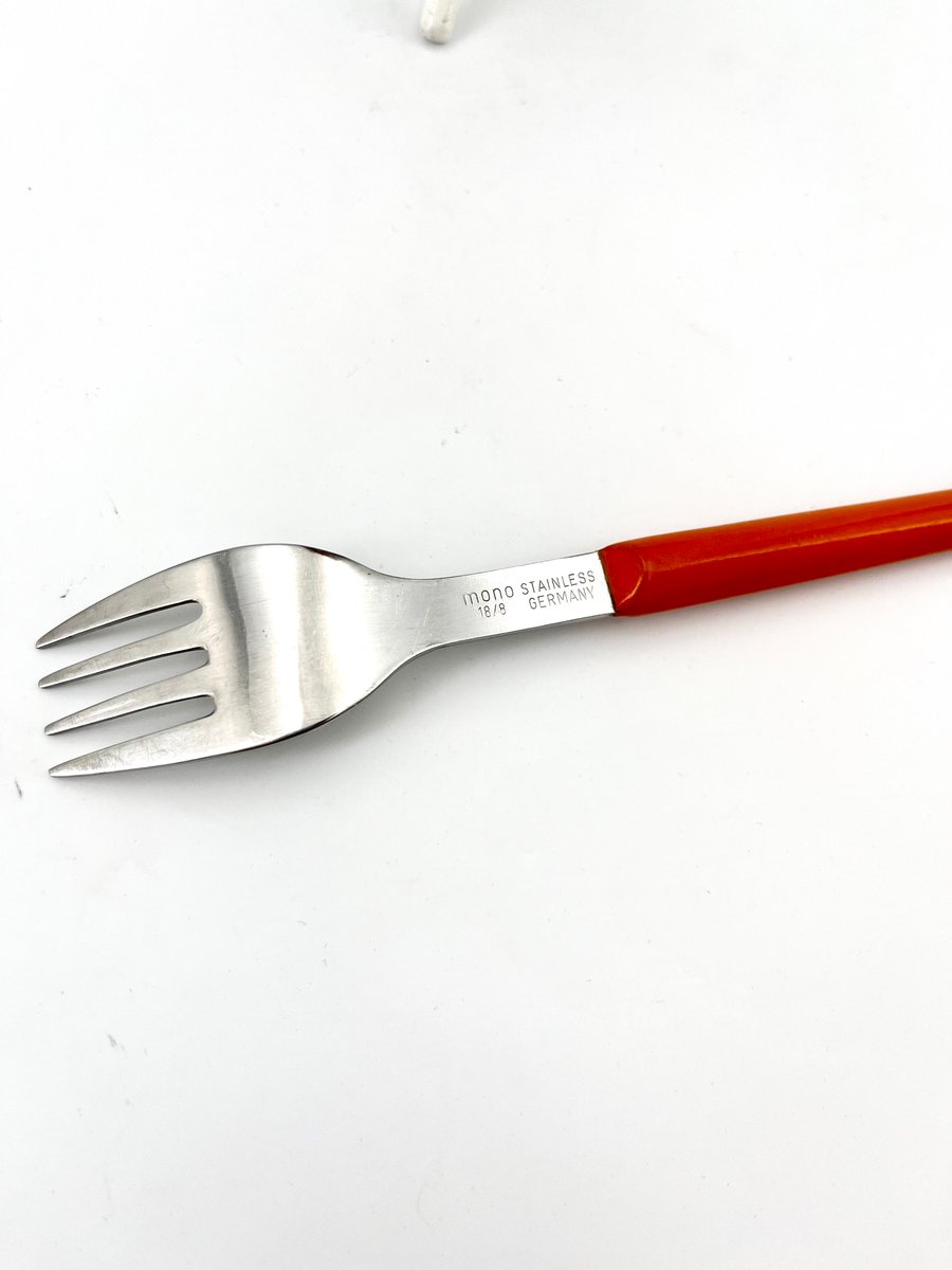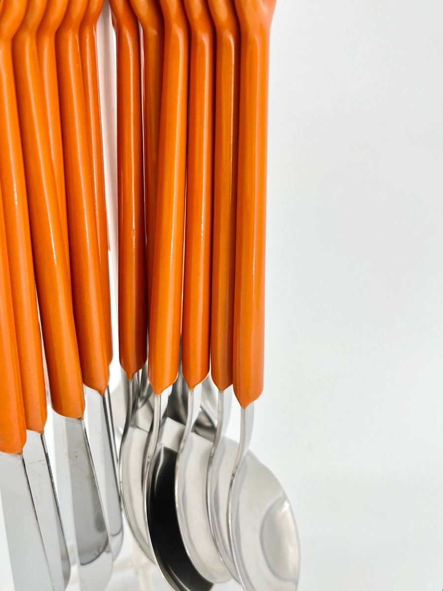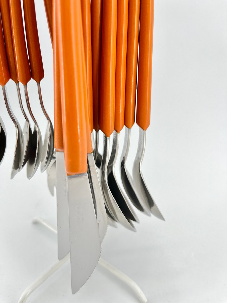Questo originale set di posate Mono Ring, disegnato da Peter Raacke nel 1959, comprende 6 forchette da tavola, 6 coltelli da tavola, 6 cucchiai da tavola e 6 cucchiaini da caffè, tutti elegantemente esposti su un supporto bianco. Il design unico consente di appoggiare le posate direttamente sul tavolo come un set completo, anziché riporle in un cassetto. Il set faceva parte della collezione del MoMA ed è stato prodotto fino alla metà degli anni '90 prima di essere dismesso. Realizzata in acciaio inossidabile 18/8 e poliammide, questa versione vintage è un reperto raro. Non è lavabile in lavastoviglie e conserva la sua integrità originale. Un vero oggetto da collezione per chi apprezza il design moderno della metà del secolo scorso.