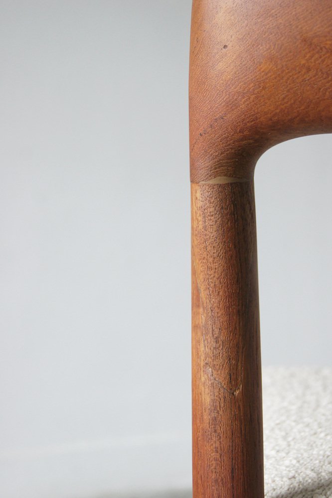 Timeless Danish dining chairs in Mid Century style designed by Niels Otto Møller. These beautifully carved, comfortable pieces feature typical Danish organic design, solid teak frames and boucle upholstery.