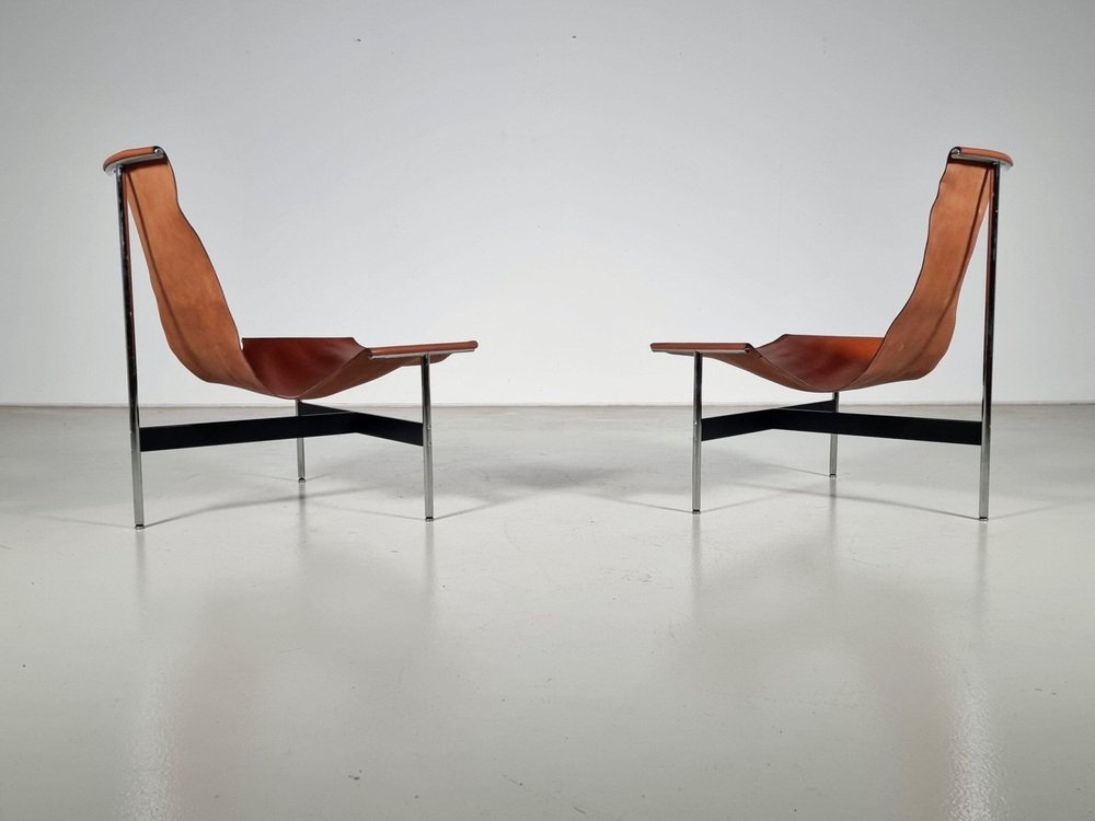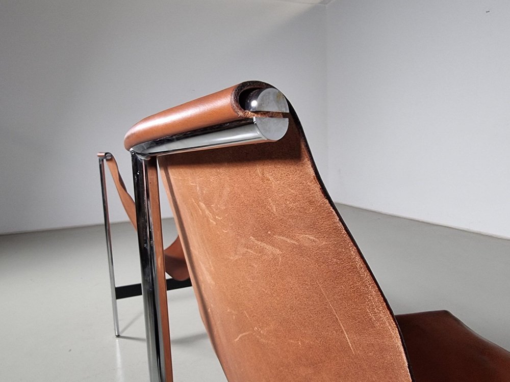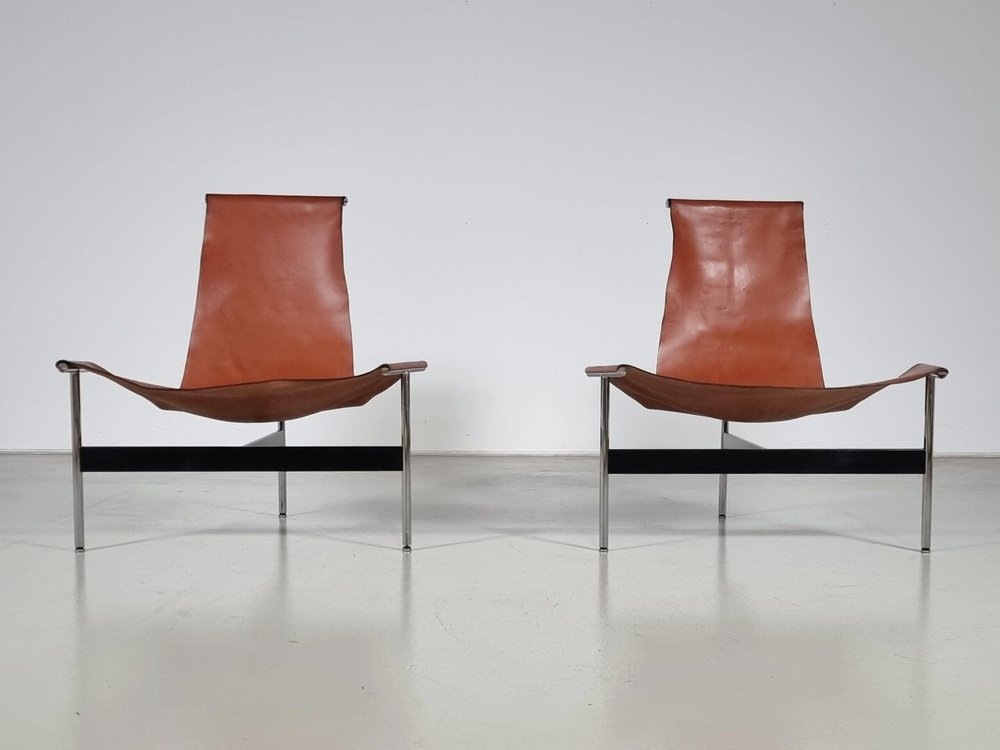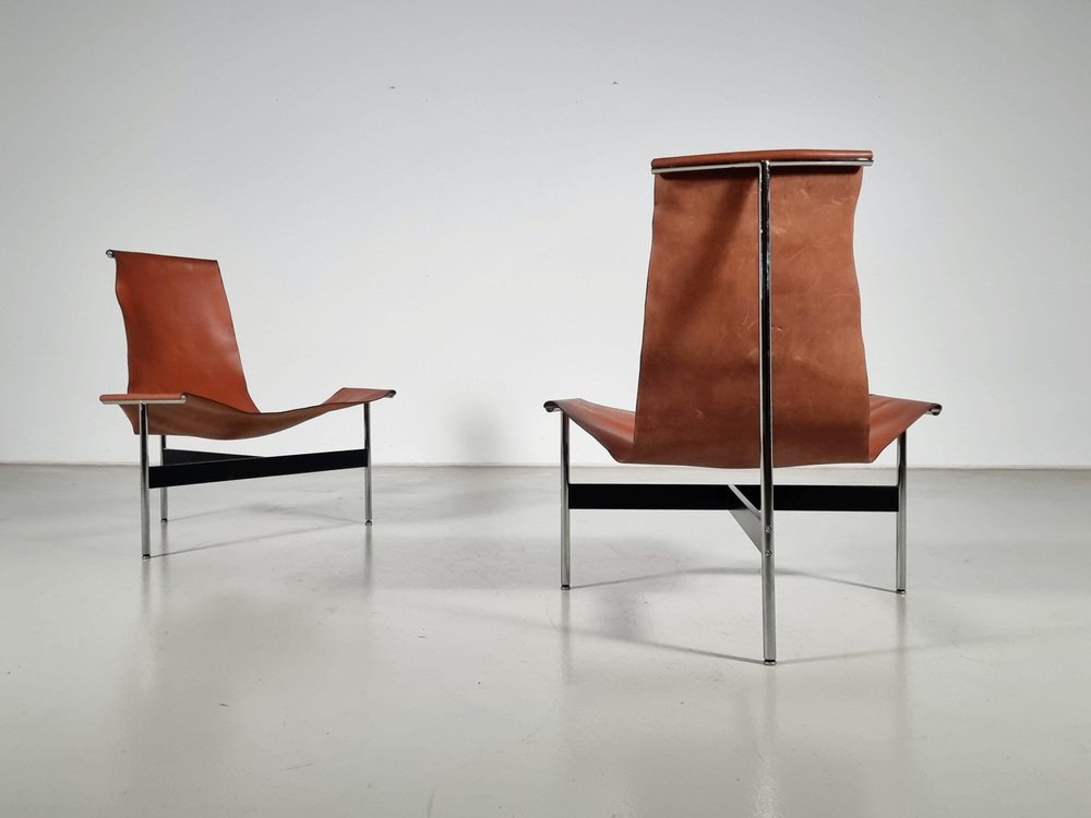 Rare lounge versions of the 3LC chairs, better known as T-chairs. Chrome-plated and enameled steel with original cognac leather sling, designed by William Katavolos, Ross Littell, and Douglas Kelley. By Laverne International’s “New Furniture” collection of 1952. with hidden screws, the leather seat is attached to a frame of chromed tubular steel and black-lacquered flat steel to create a striking three-legged chair. The steel frame creates an open look and a floating appearance of the seating. The T chair can be found in the permanent collection of the Museum of Modern Art in New York and other top museums worldwide. Patinated leather, some signs on the frames.