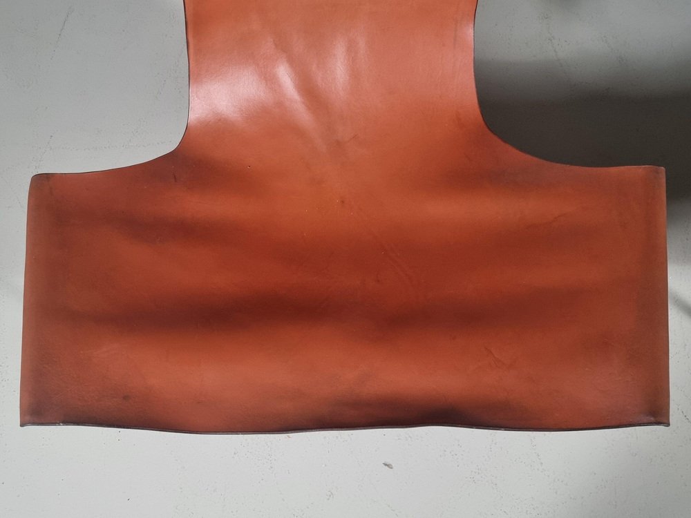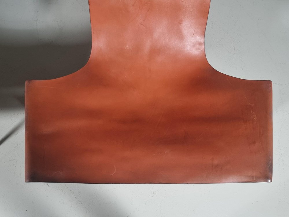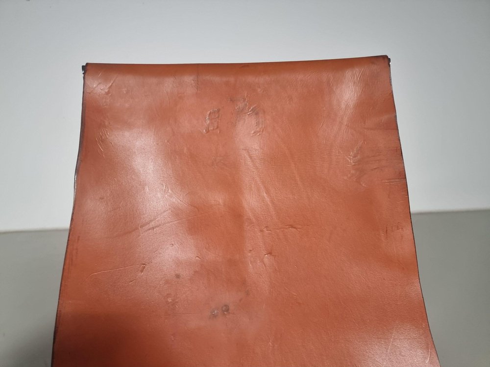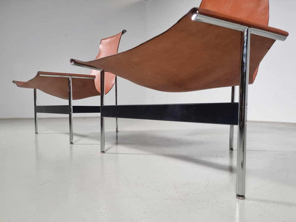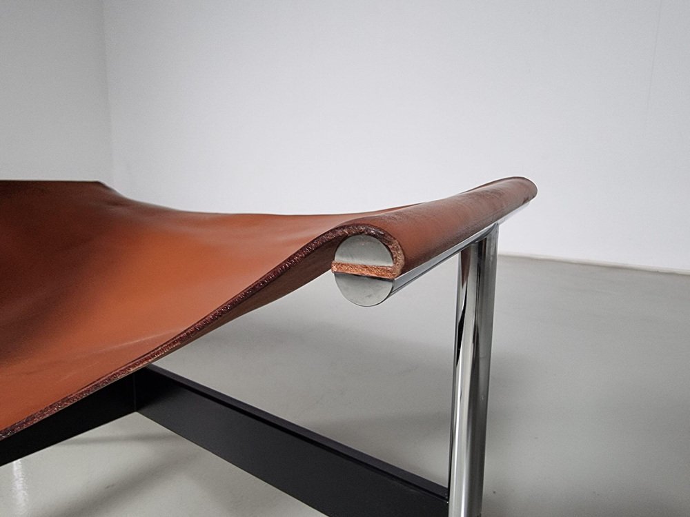 Rare lounge versions of the 3LC chairs, better known as T-chairs. Chrome-plated and enameled steel with original cognac leather sling, designed by William Katavolos, Ross Littell, and Douglas Kelley. By Laverne International’s “New Furniture” collection of 1952. with hidden screws, the leather seat is attached to a frame of chromed tubular steel and black-lacquered flat steel to create a striking three-legged chair. The steel frame creates an open look and a floating appearance of the seating. The T chair can be found in the permanent collection of the Museum of Modern Art in New York and other top museums worldwide. Patinated leather, some signs on the frames.