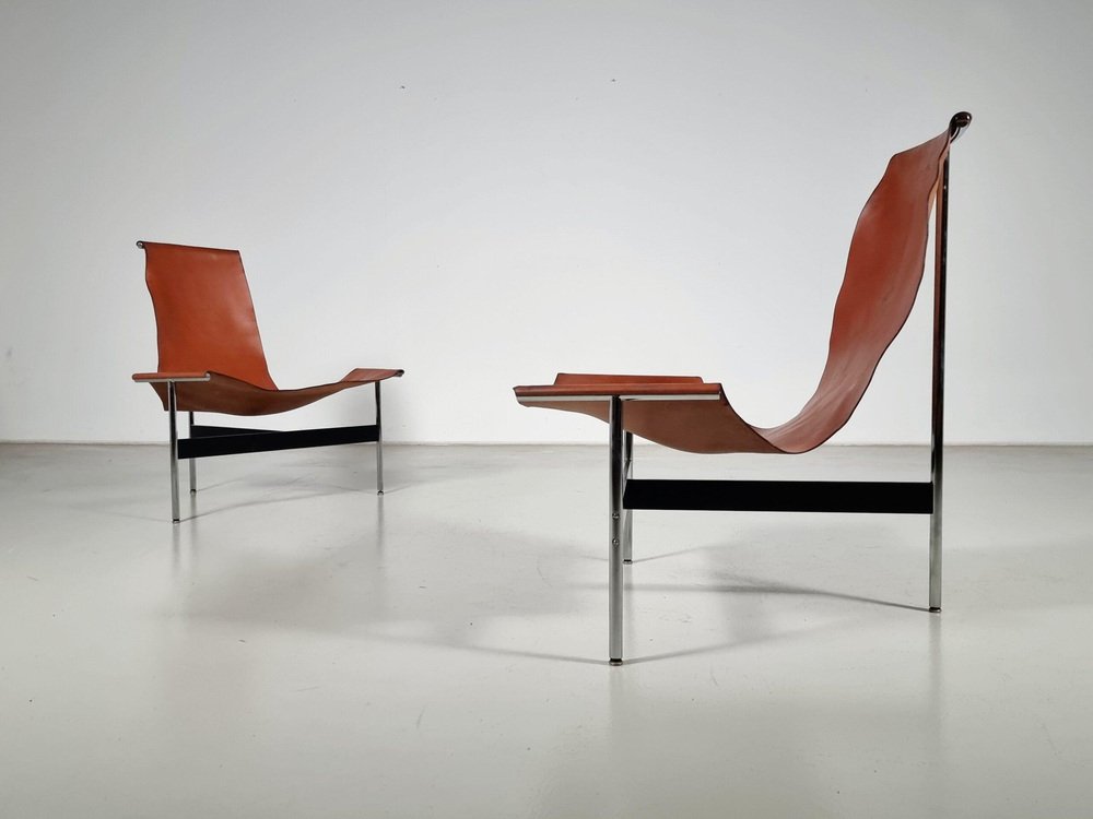 Rare versioni lounge delle sedie 3LC, meglio conosciute come T-chairs. In acciaio cromato e smaltato con imbragatura originale in pelle color cognac, progettate da William Katavolos, Ross Littell e Douglas Kelley. Dalla collezione "New Furniture" di Laverne International del 1952. Con viti nascoste, la seduta in pelle è fissata a una struttura in tubolare d'acciaio cromato e acciaio piatto laccato nero per creare una sedia a tre gambe di grande effetto. La struttura in acciaio crea un aspetto aperto e fluttuante della seduta. La sedia T si trova nella collezione permanente del Museum of Modern Art di New York e in altri importanti musei del mondo. Pelle patinata, alcuni segni sulla struttura.
